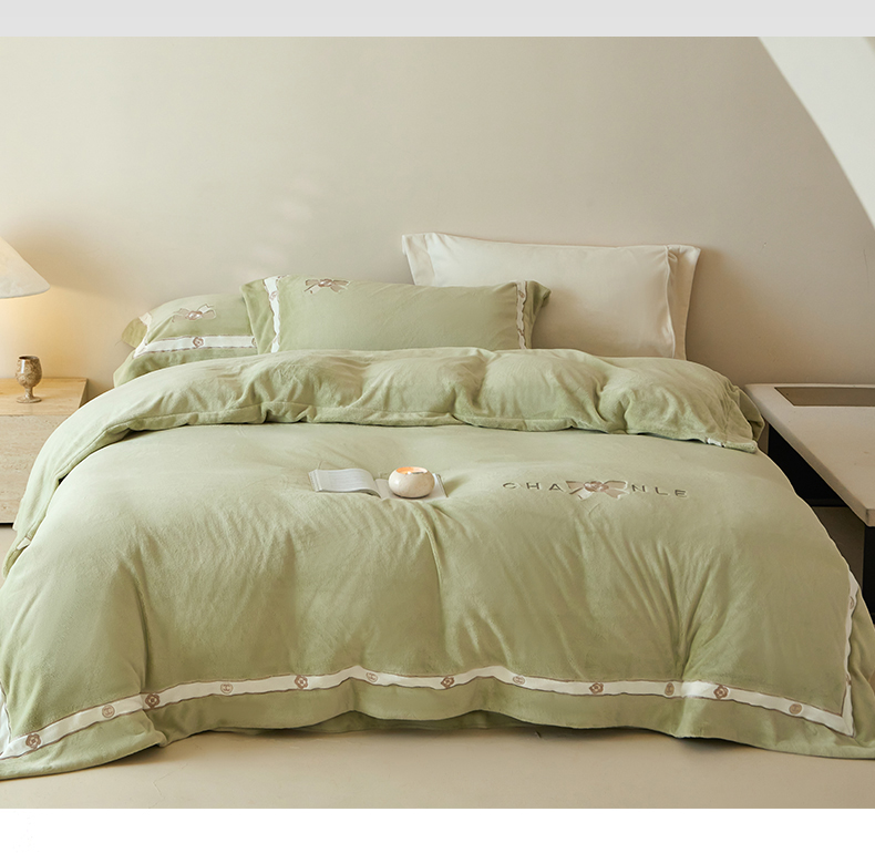 名品优仓 2024新款高克重牛奶绒绣花撞色织带四件套-贝琳娜 贝琳娜-绿矾