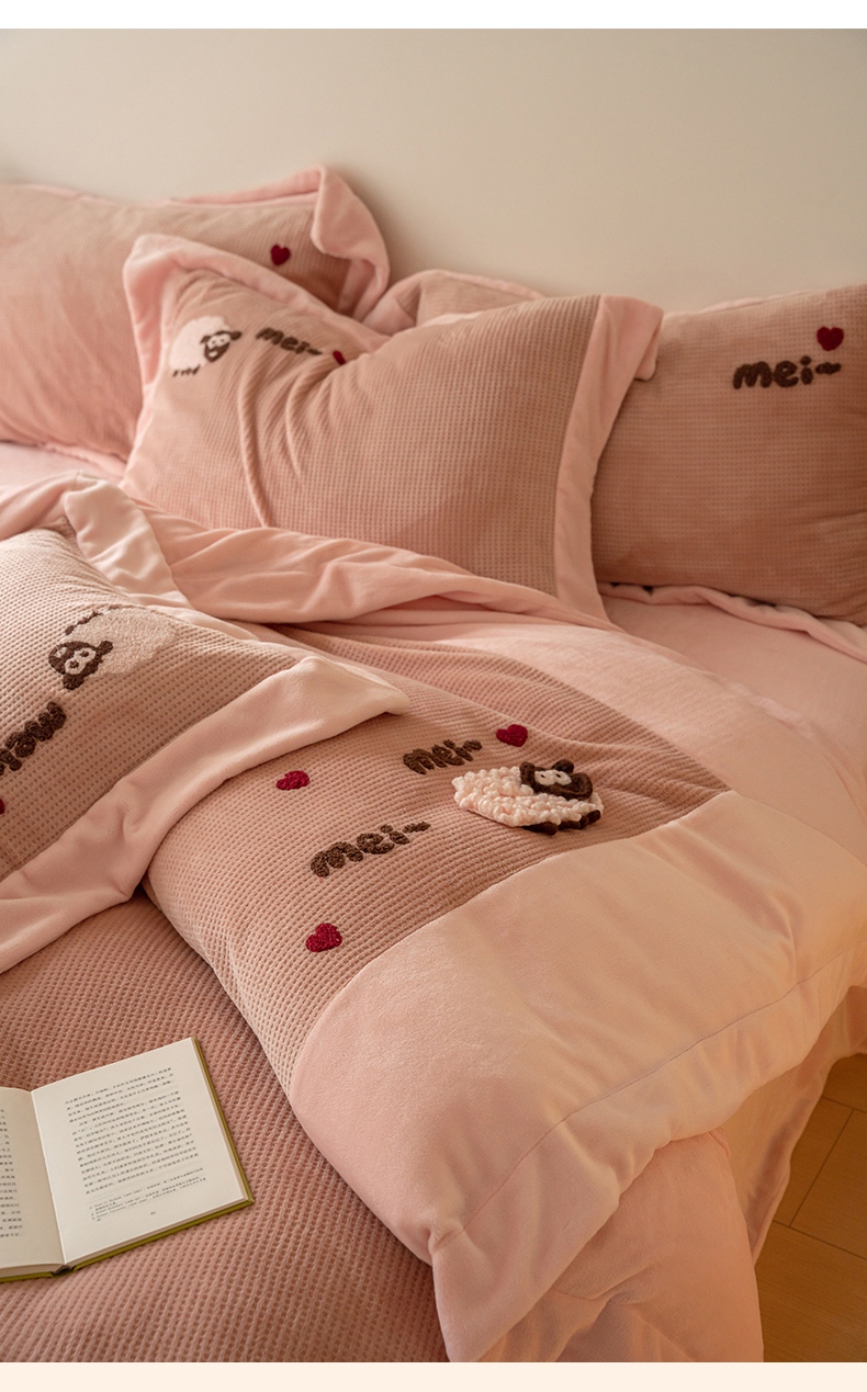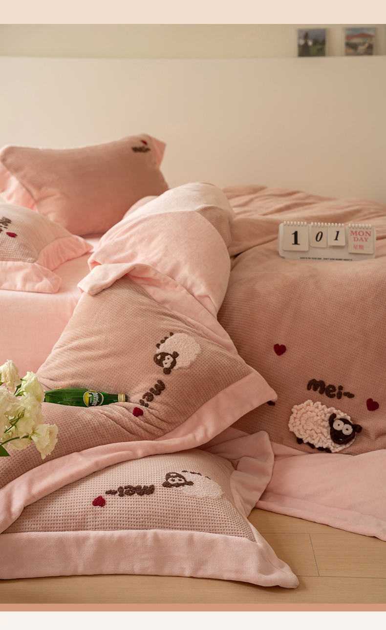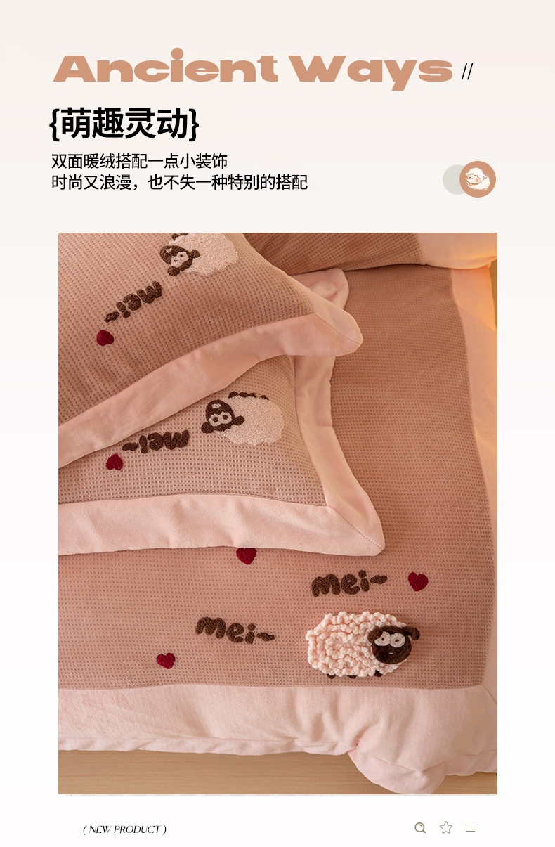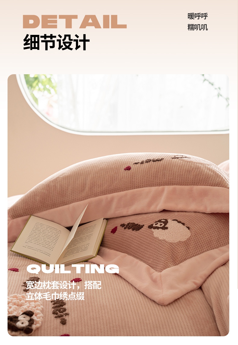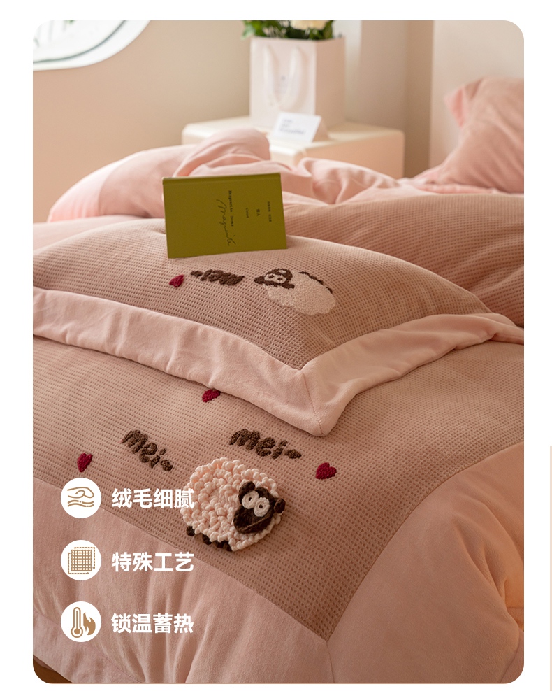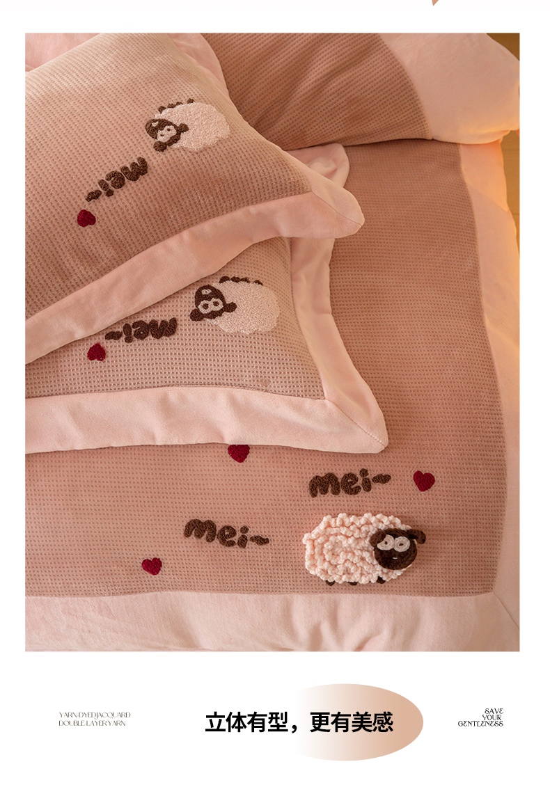 商品名称:名品优仓 2024新款华夫格牛奶绒毛巾绣四件套-喜洋洋 喜洋洋 玉豆沙
