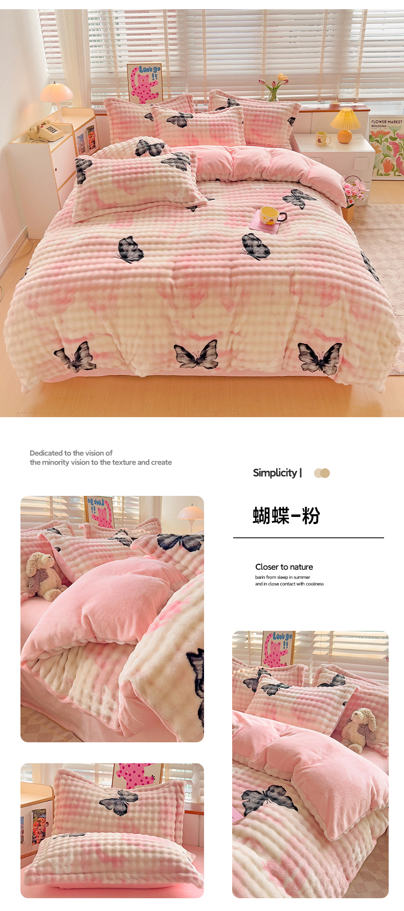 当前位置: 91家纺网 > 商品网购 > 床品套件 > 四件套 > 牛奶绒四件套 > 八方汇(一户被芯生活馆) 2024新款泡泡绒牛奶绒立体印花四件套系列二 蝴蝶-粉