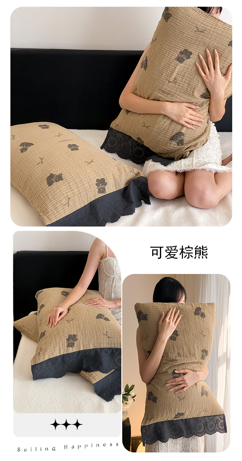 麻依 2024新款法式四层纱布枕套花边款 可爱棕熊