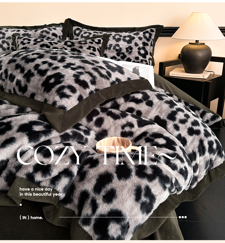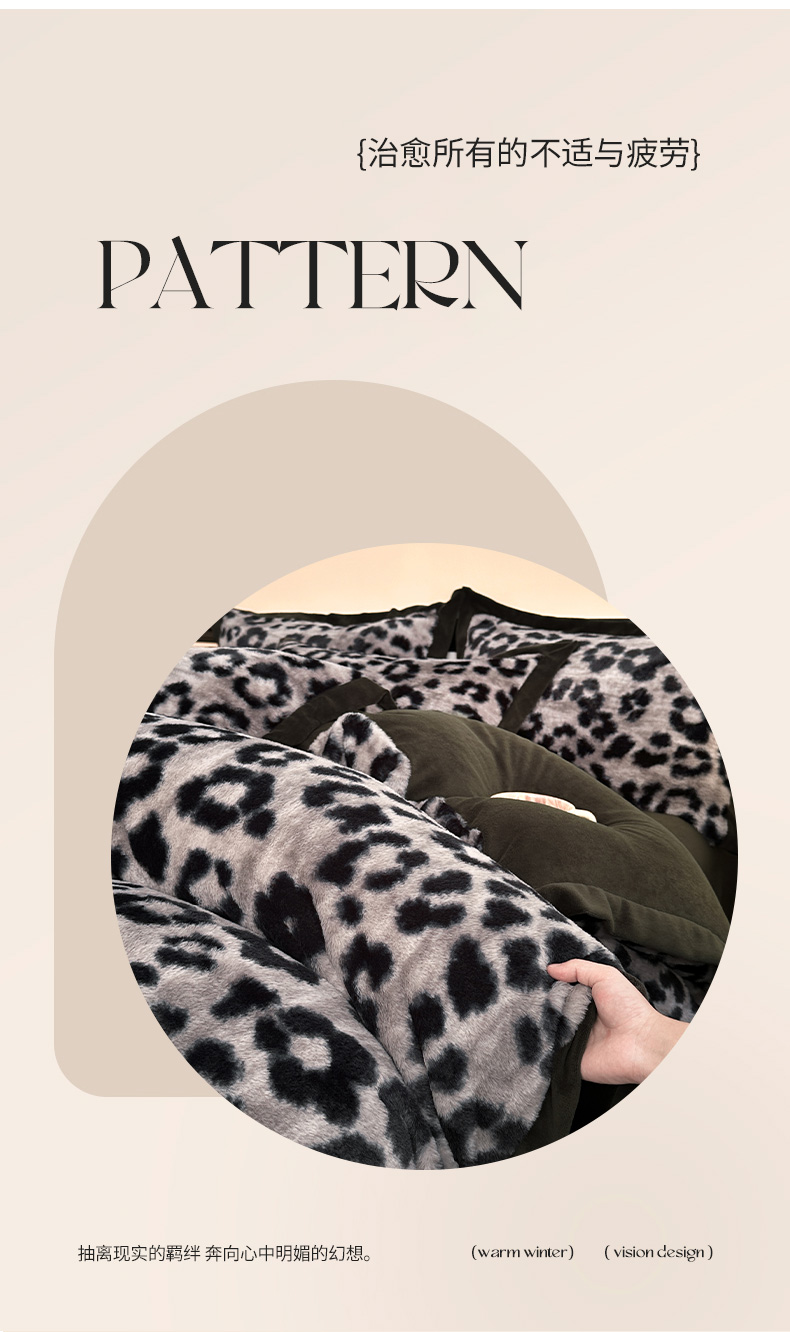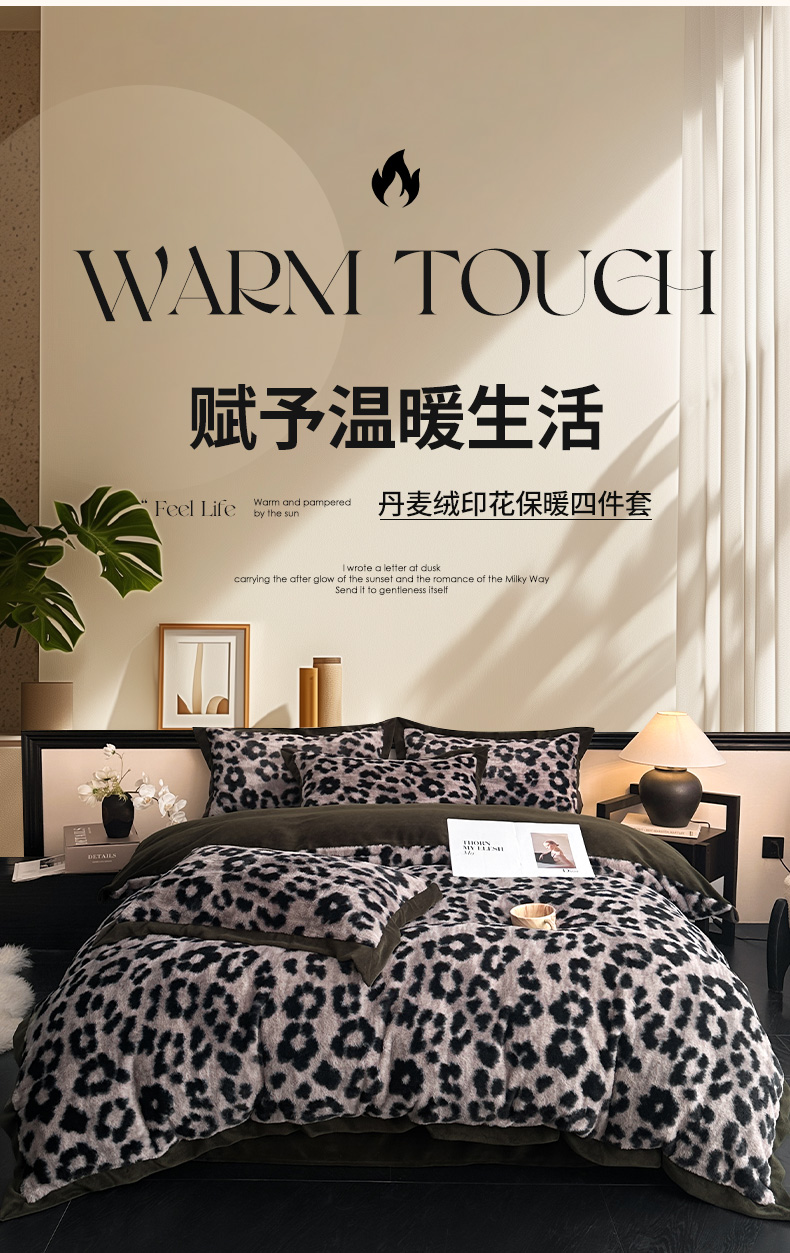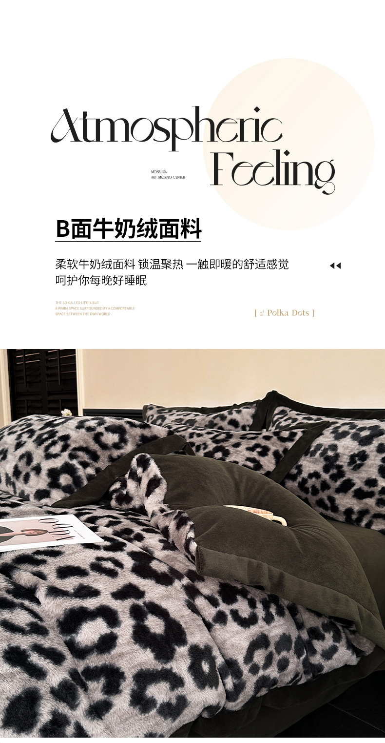 丝印良品 2024秋冬新款丹麦绒宽边牛奶绒四件套 宽边兔绒-豹纹灰