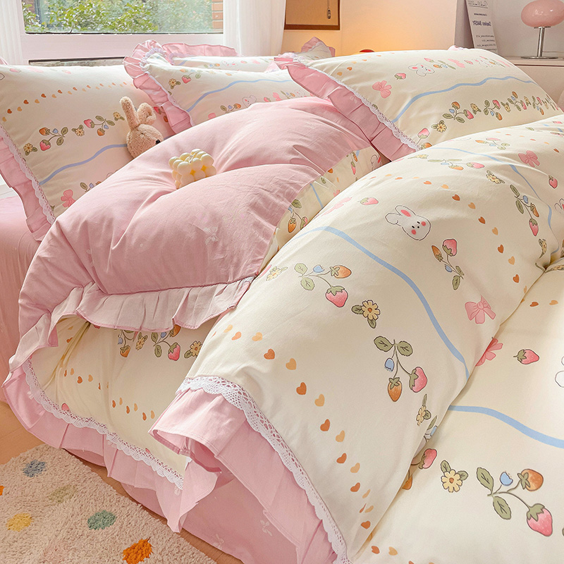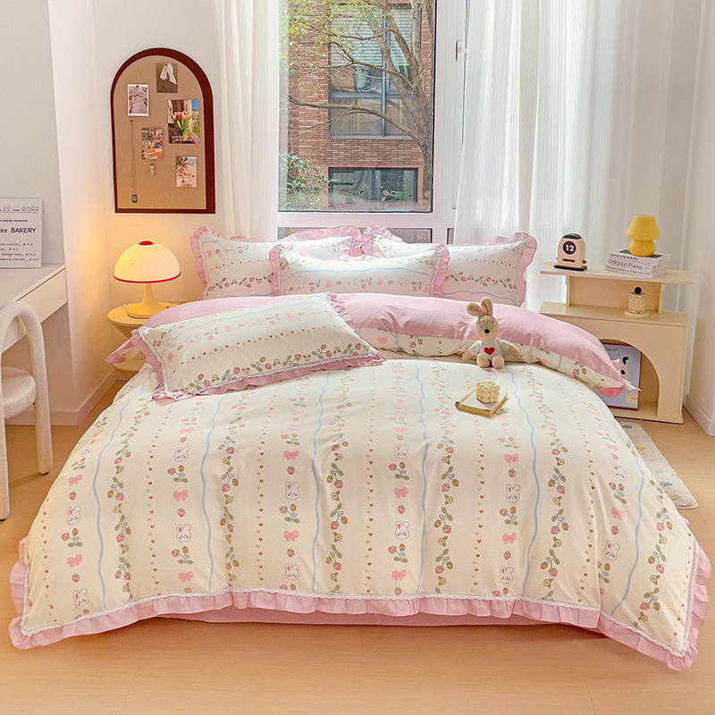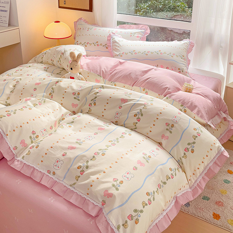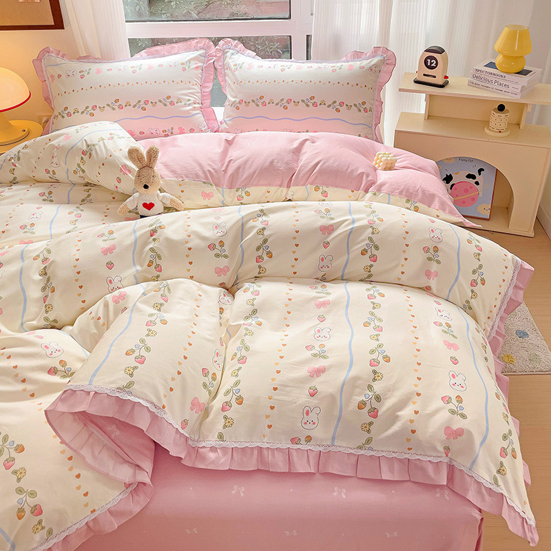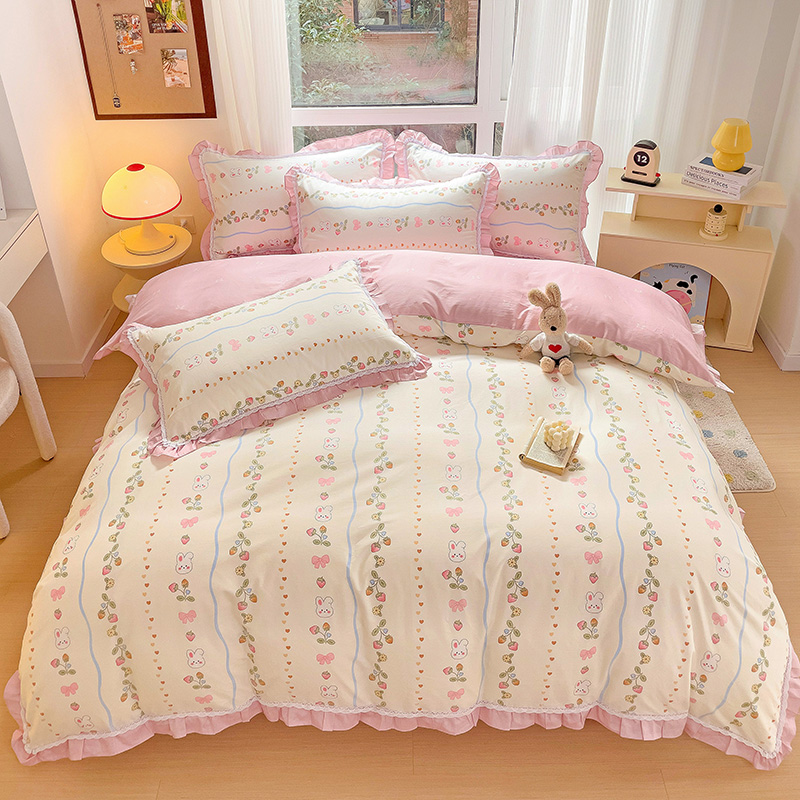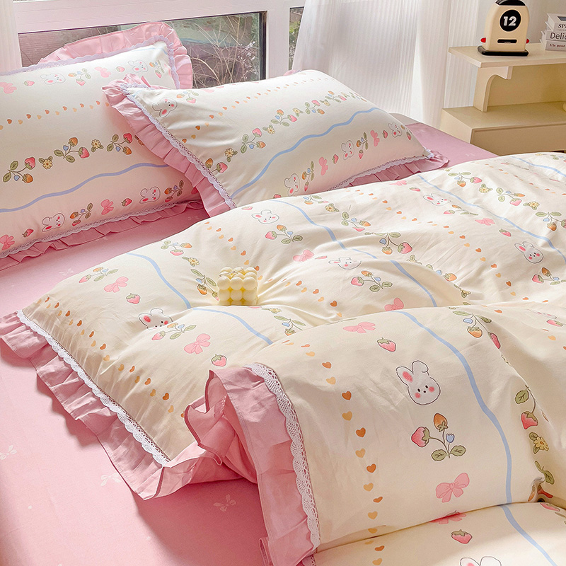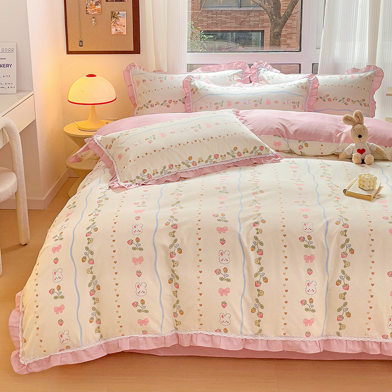 棉生活家纺 2025新款全棉小清新花边款蕾丝四件套 花野兔
