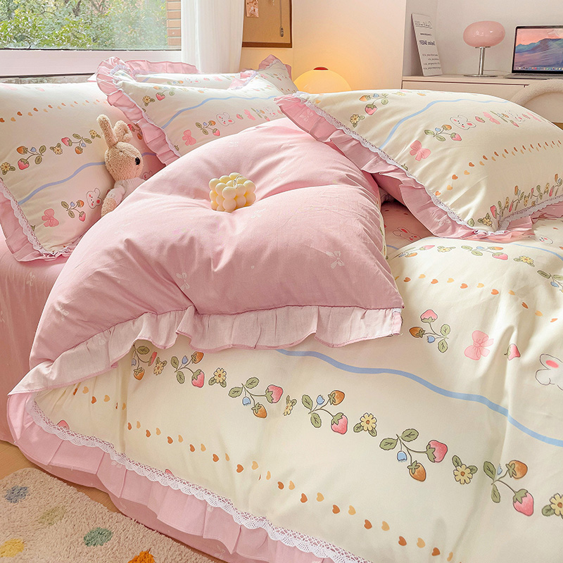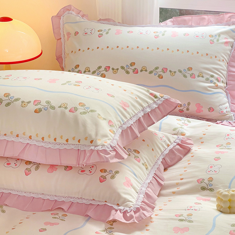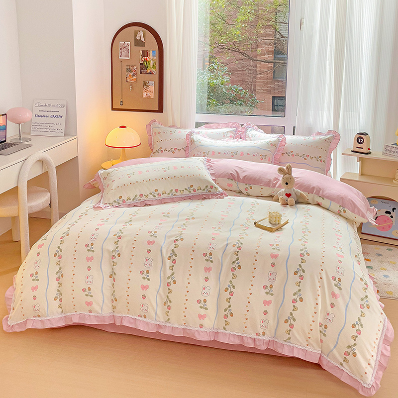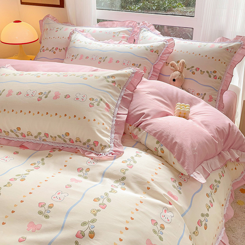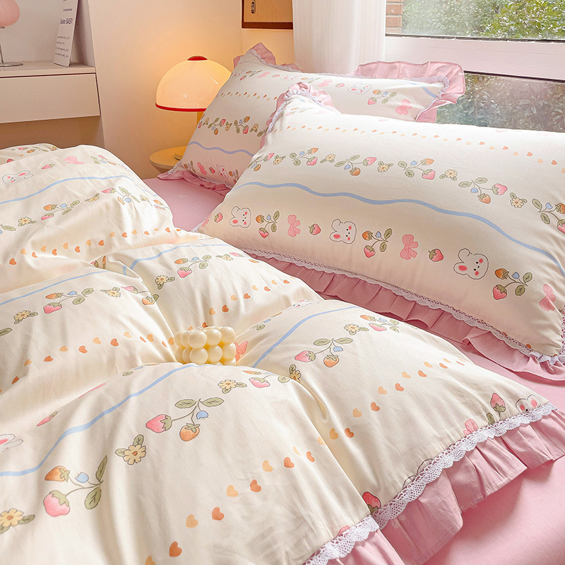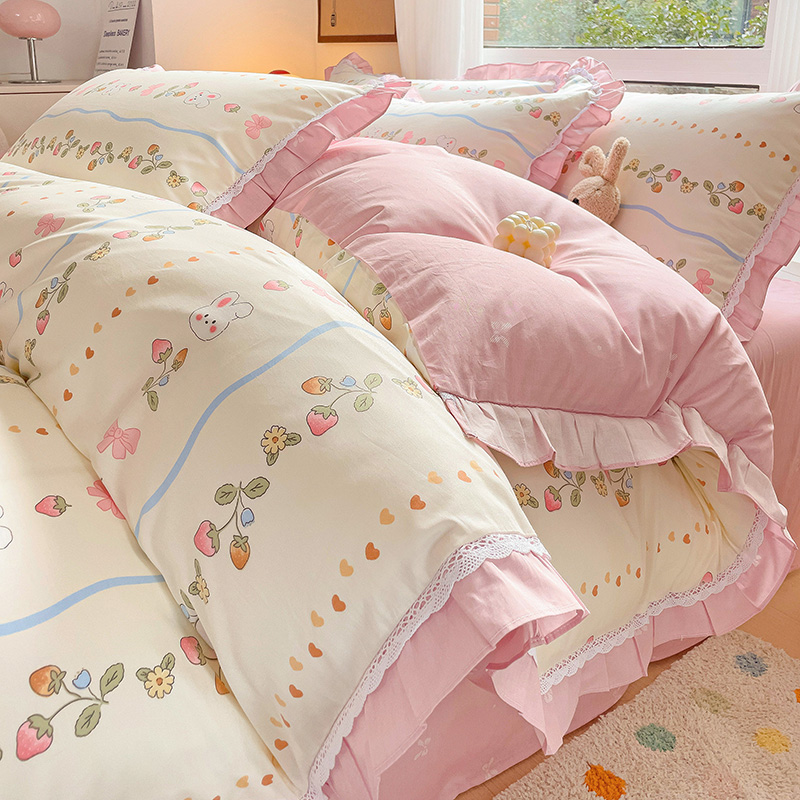 棉生活家纺 2025新款全棉小清新花边款蕾丝四件套 花野兔