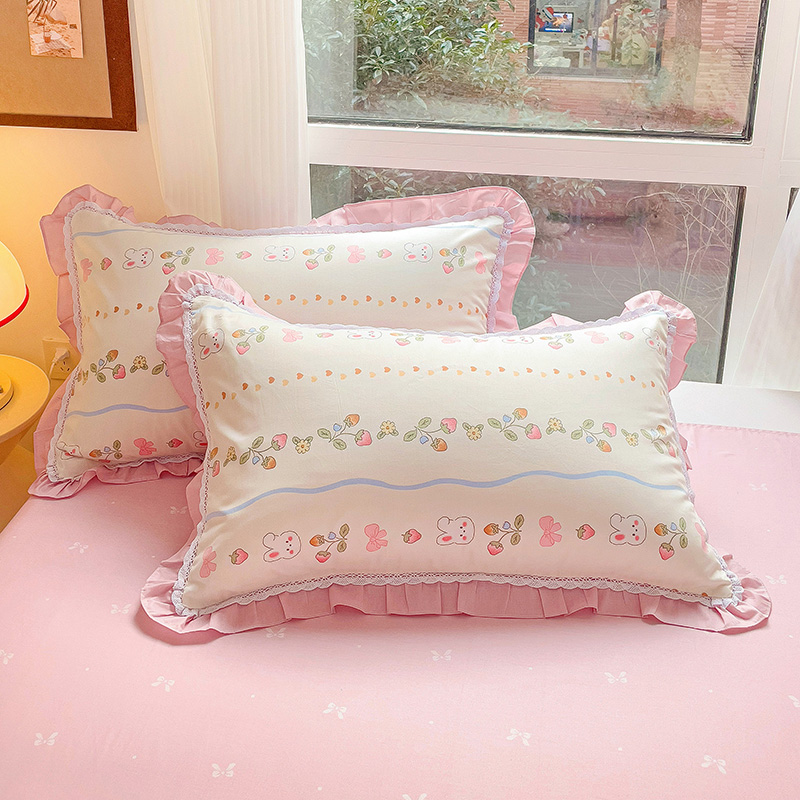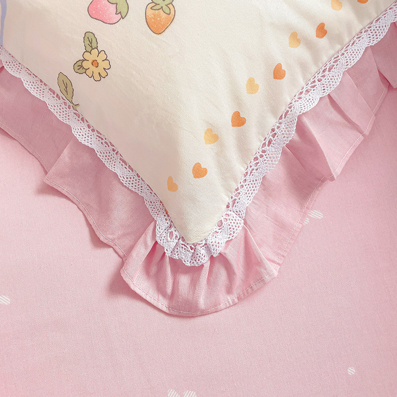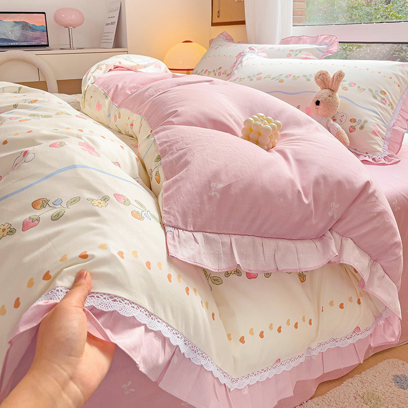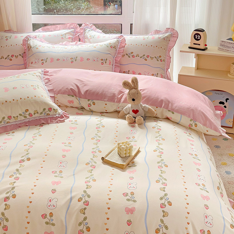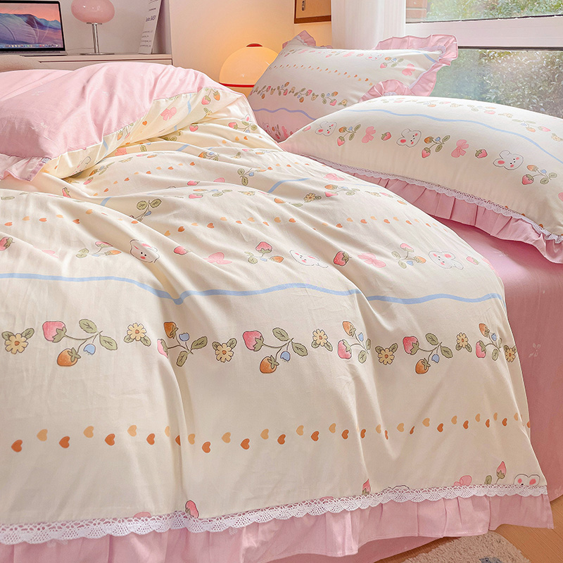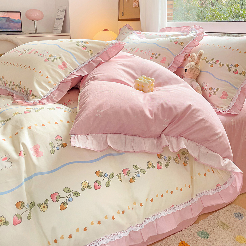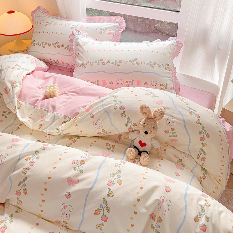 棉生活家纺 2025新款全棉小清新花边款蕾丝四件套 花野兔