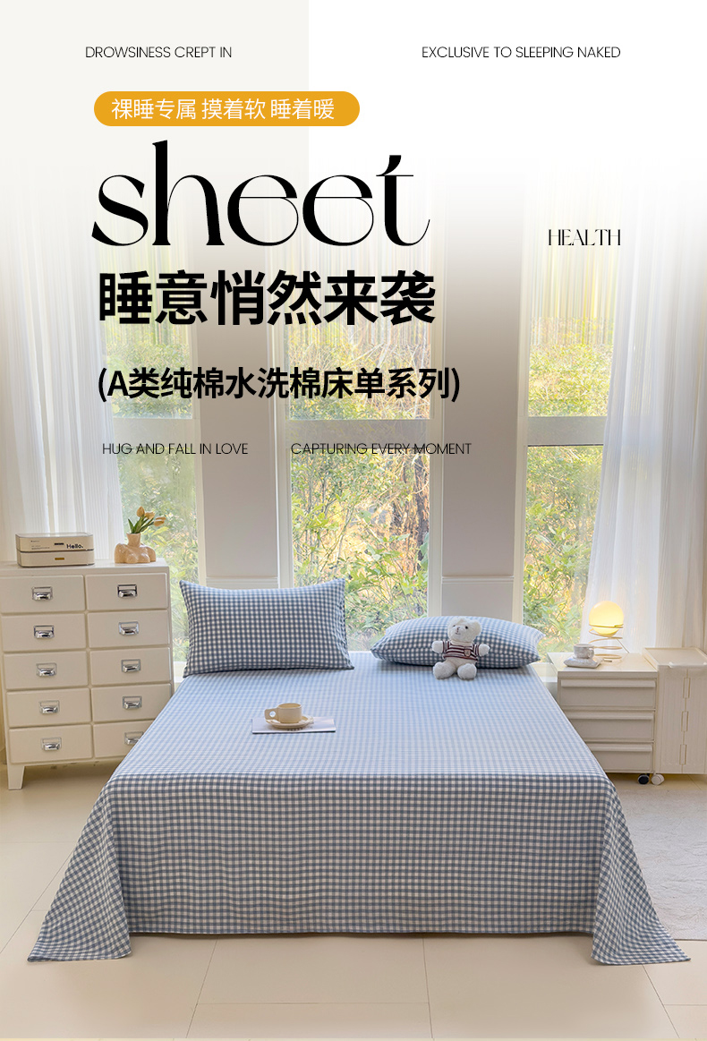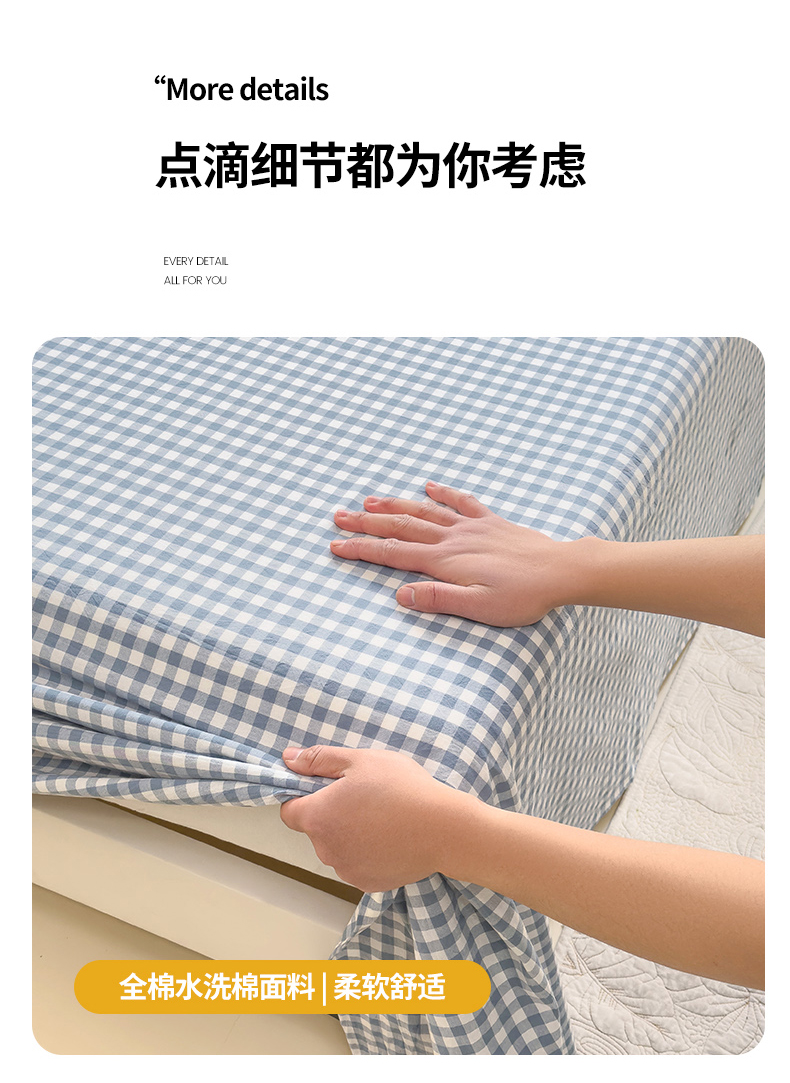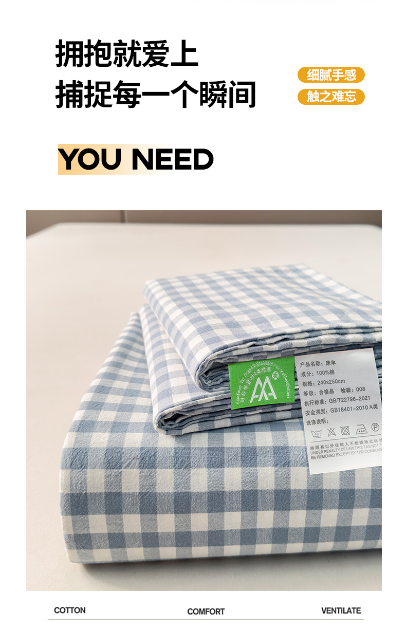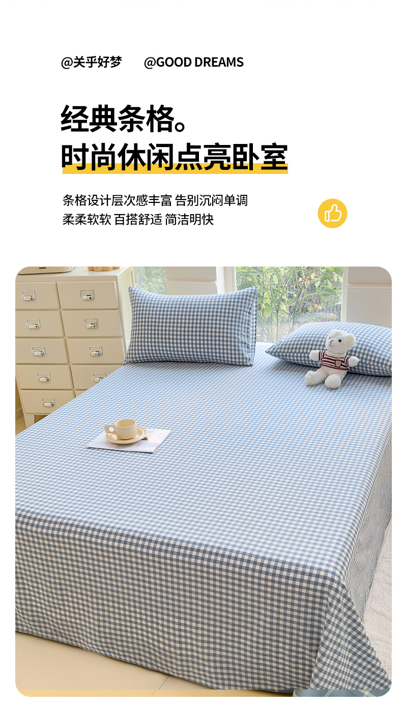 • 91家纺网 家纺一手货源 找家纺 柠萌家居 2025新款无印风全棉色织A类母婴级纯棉水洗棉床单 浅蓝小格