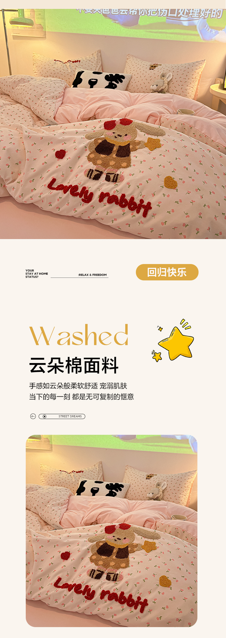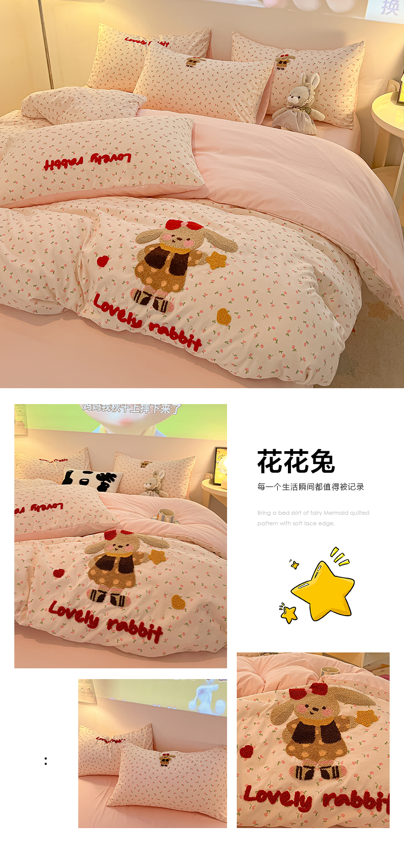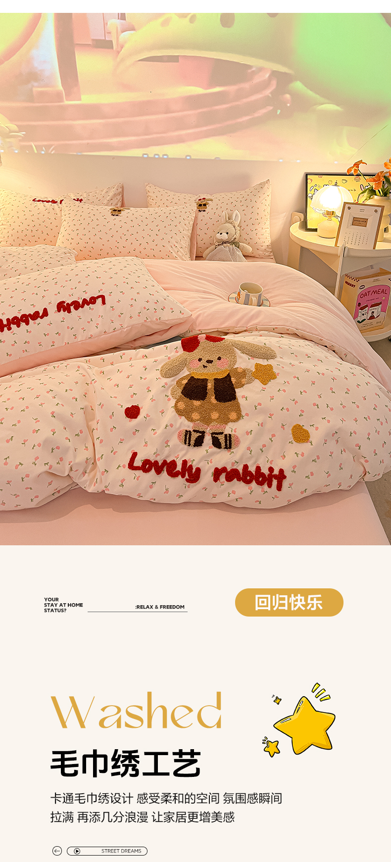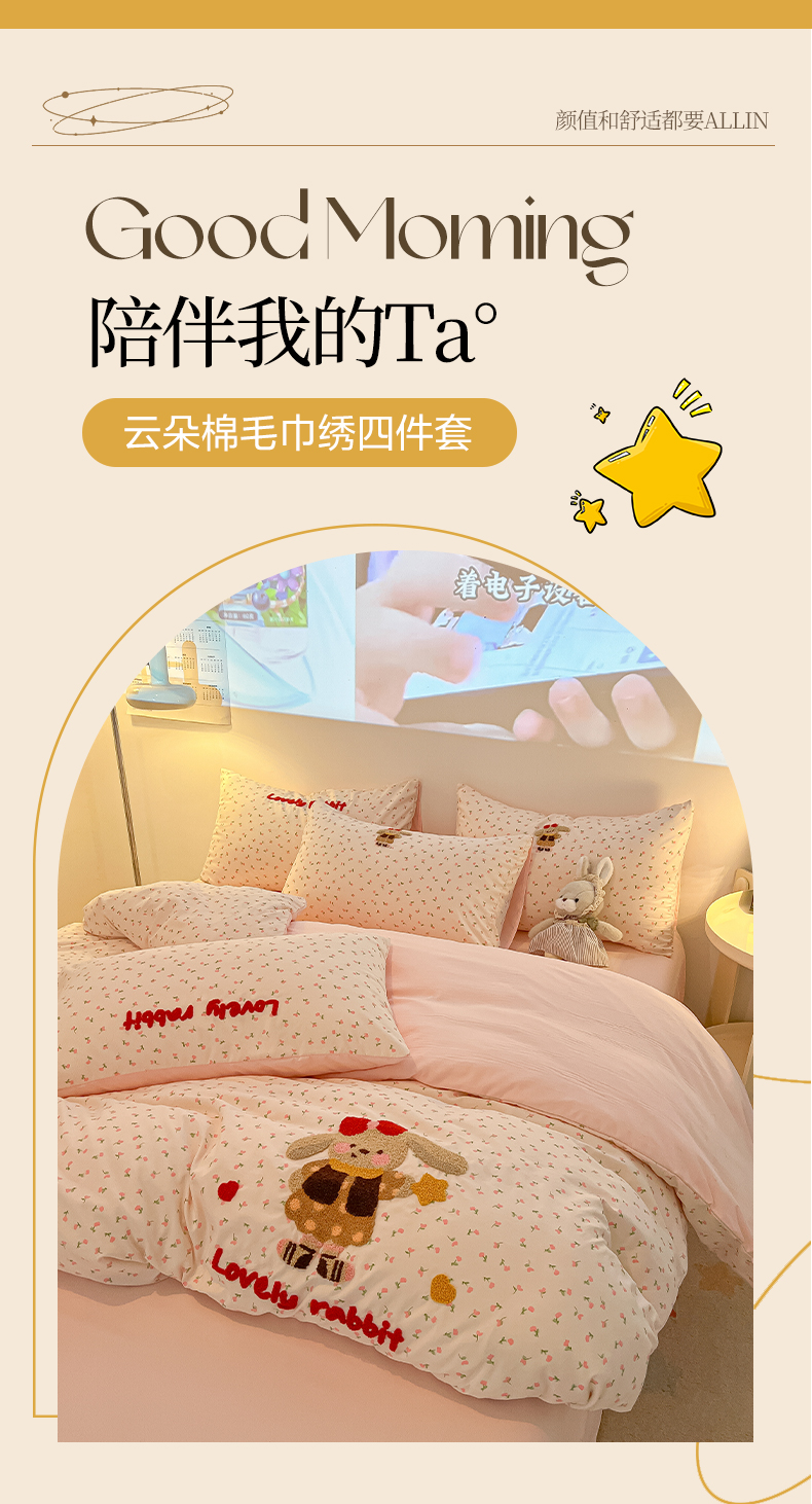 当前位置: 91家纺网 > 商品网购 > 床品套件 > 四件套 > 毛巾绣四件套 > 韩巢家纺 2025新款云朵棉可爱小猫咪毛巾绣被套床单床上用品四件套宿舍三件套(提供卖家秀) 花花兔