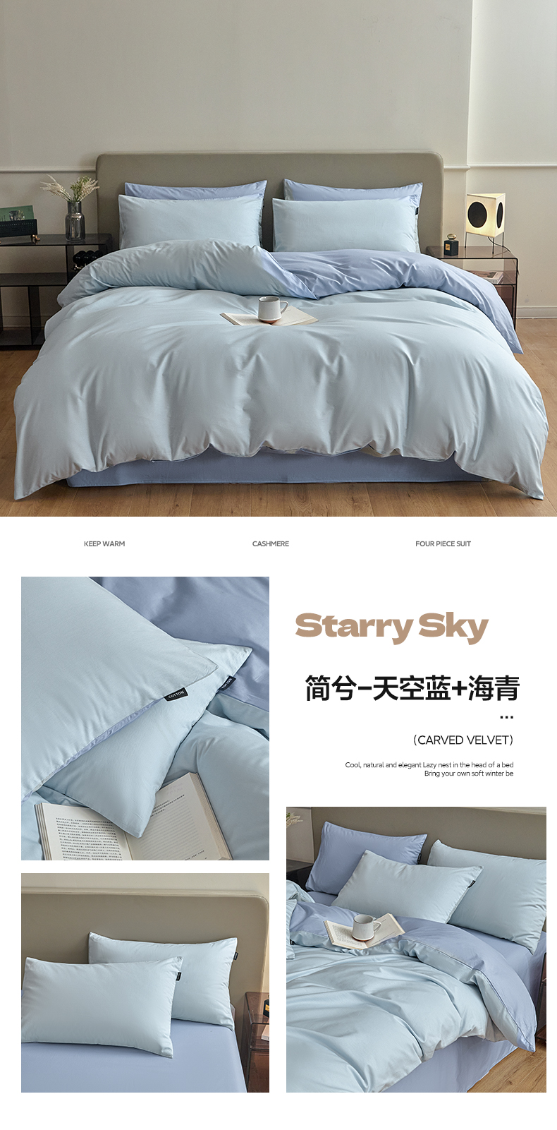 当前位置: 91家纺网 > 商品网购 > 床品套件 > 四件套 > 全棉普通四件套 > 佳汐蓝家纺 2025新款全棉纯色双拼-简兮系列四件套 简兮-天空蓝+海青