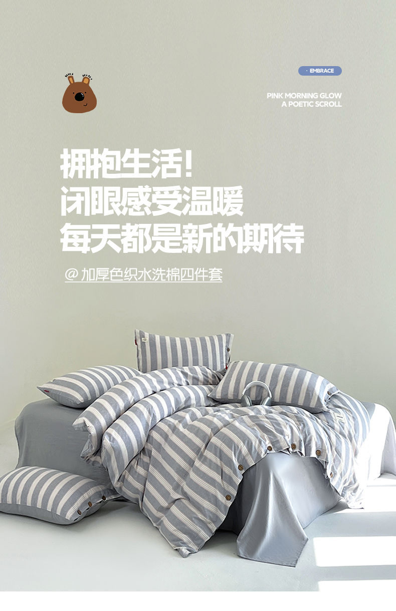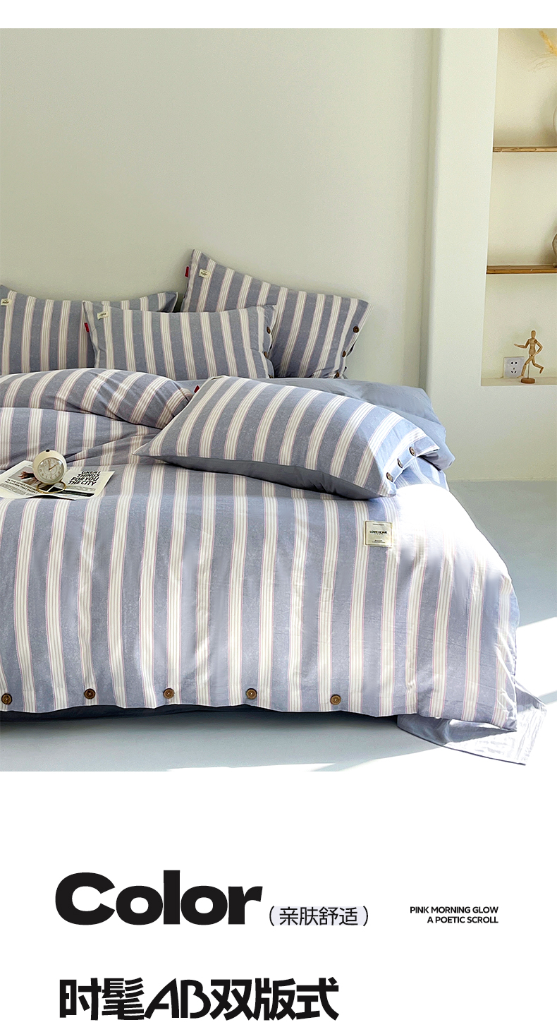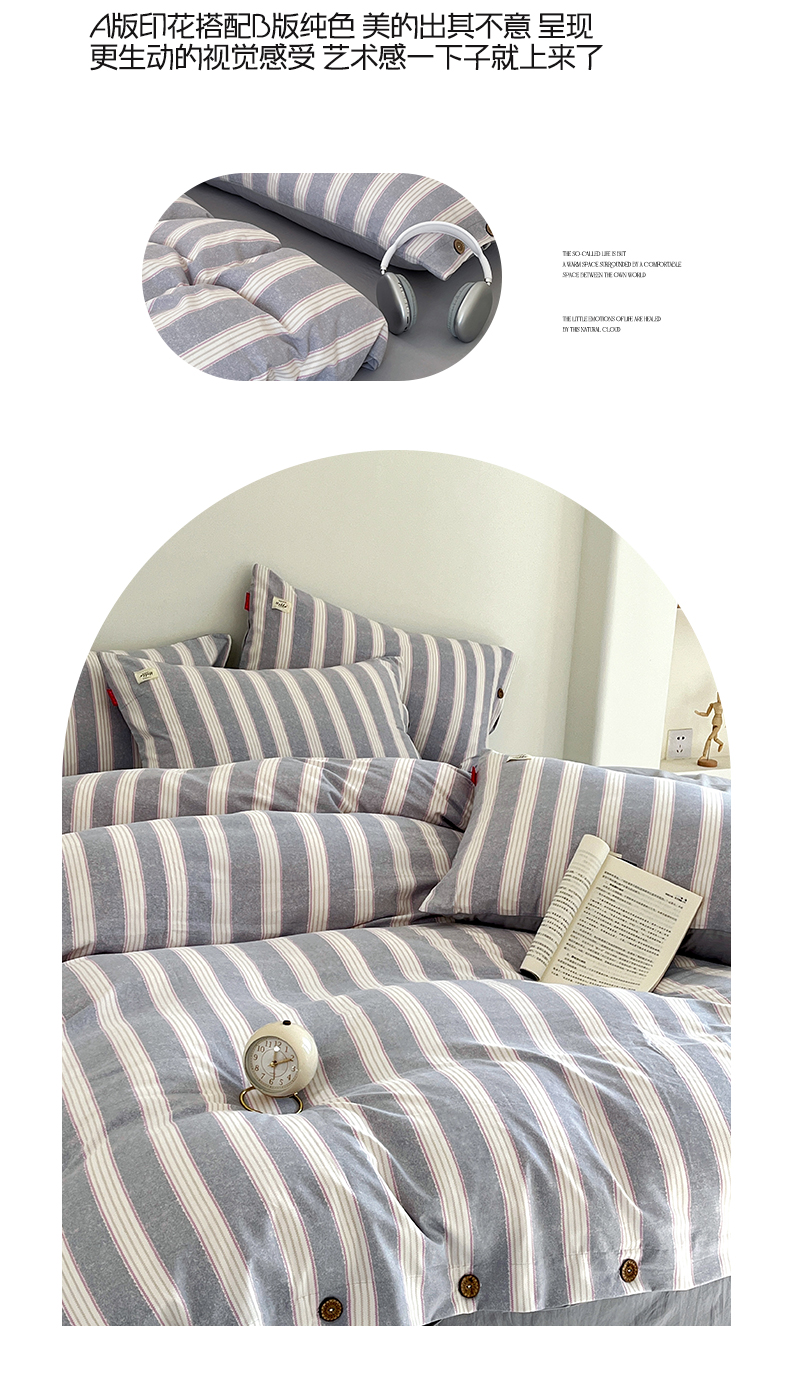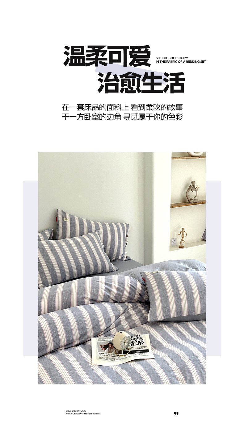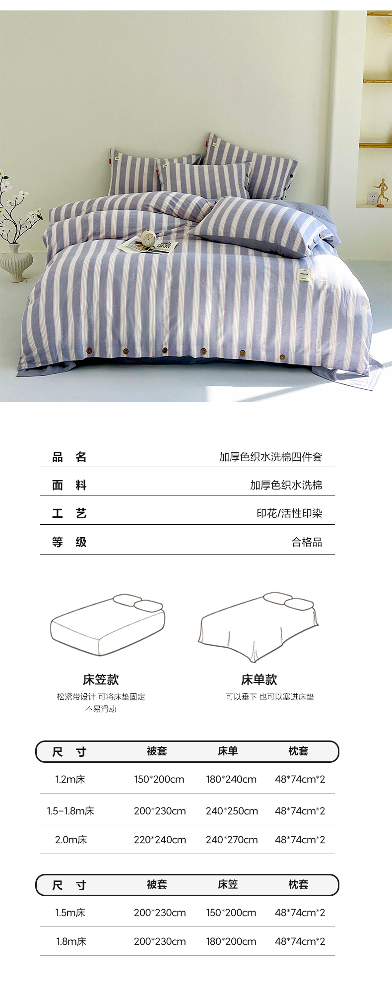 商品名称:睡美美 2025新款加厚色织水洗棉印染条纹四件套 蓝灰条纹