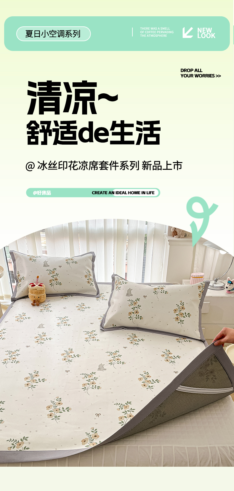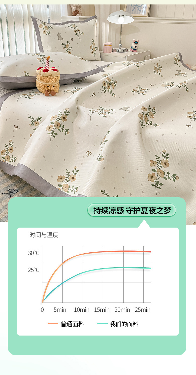 川悦生活 2025新款600D立体宽边冰丝印花凉席 春日花钿