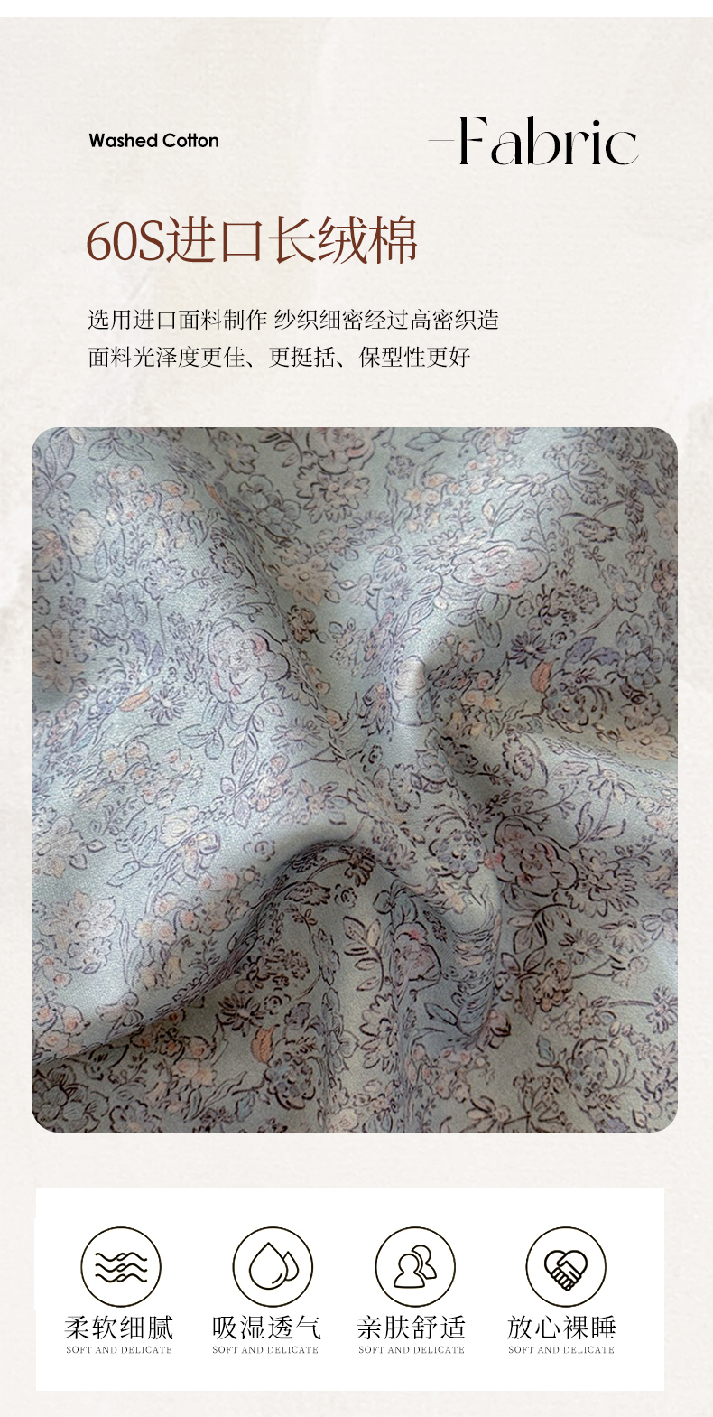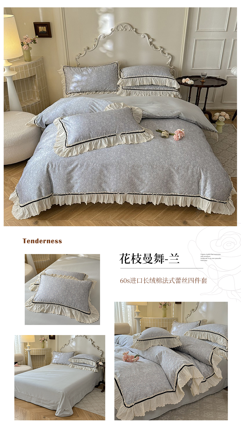 商品名称:巧玲珑 2025新款法式蕾丝印花60支进口长绒棉四件套 花枝曼舞-兰