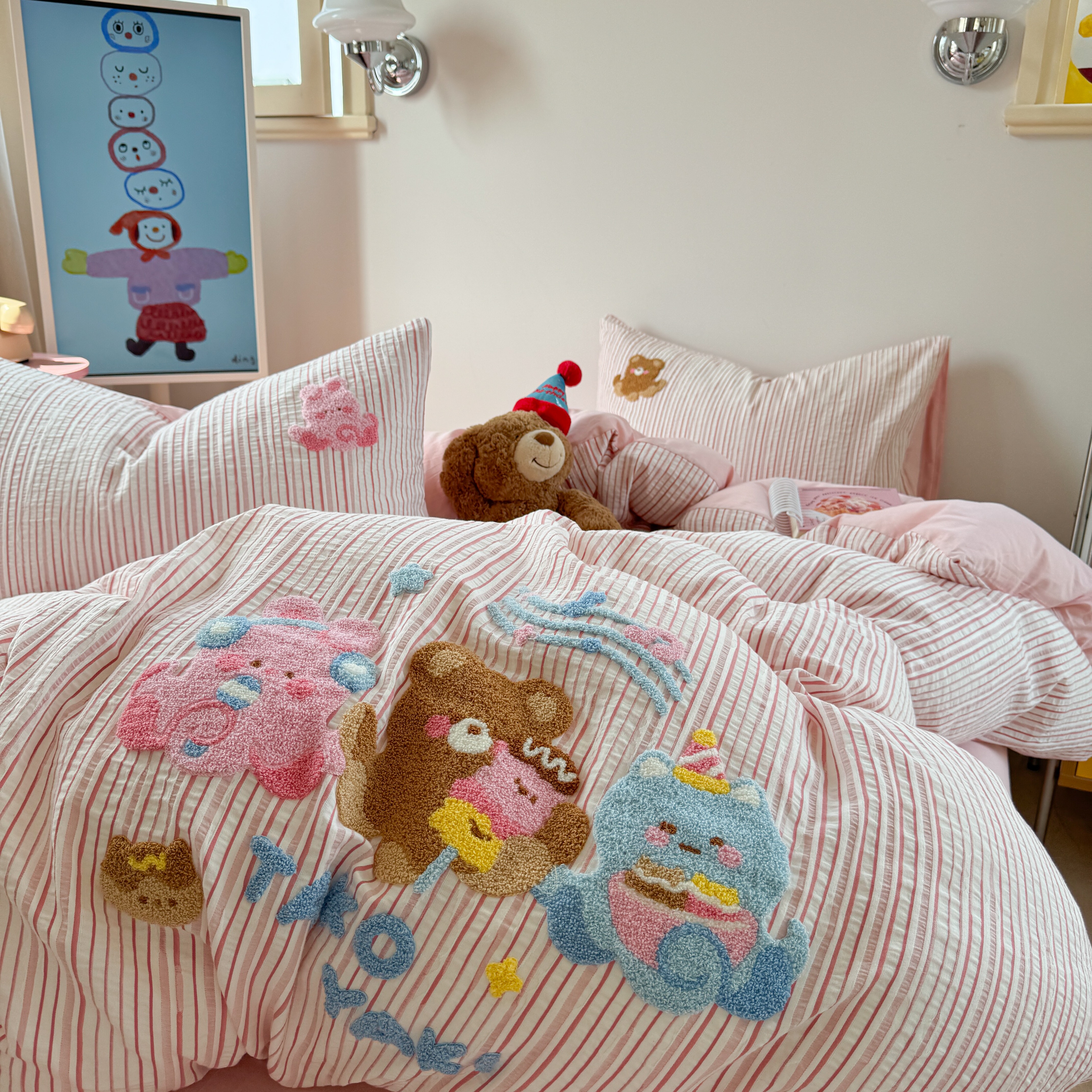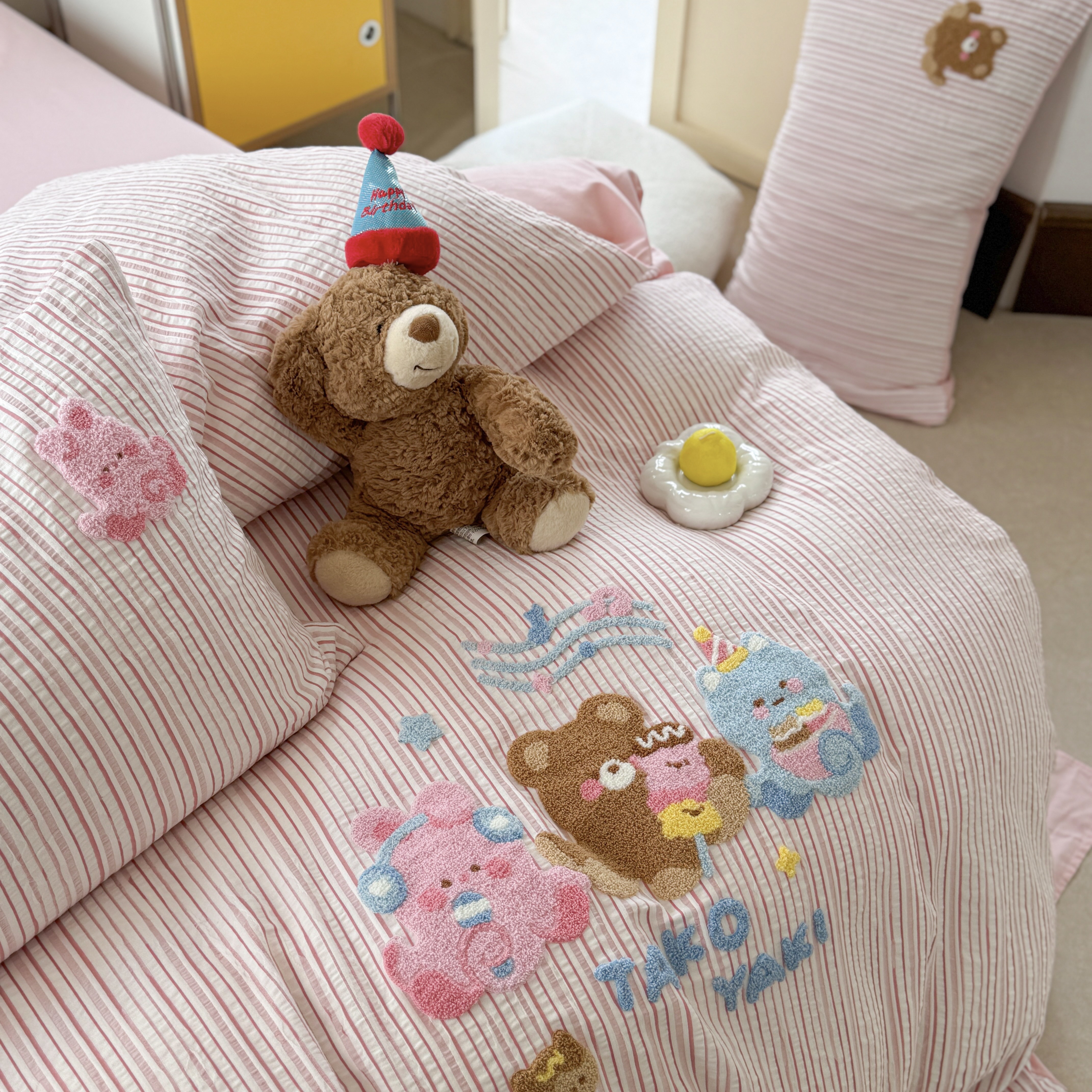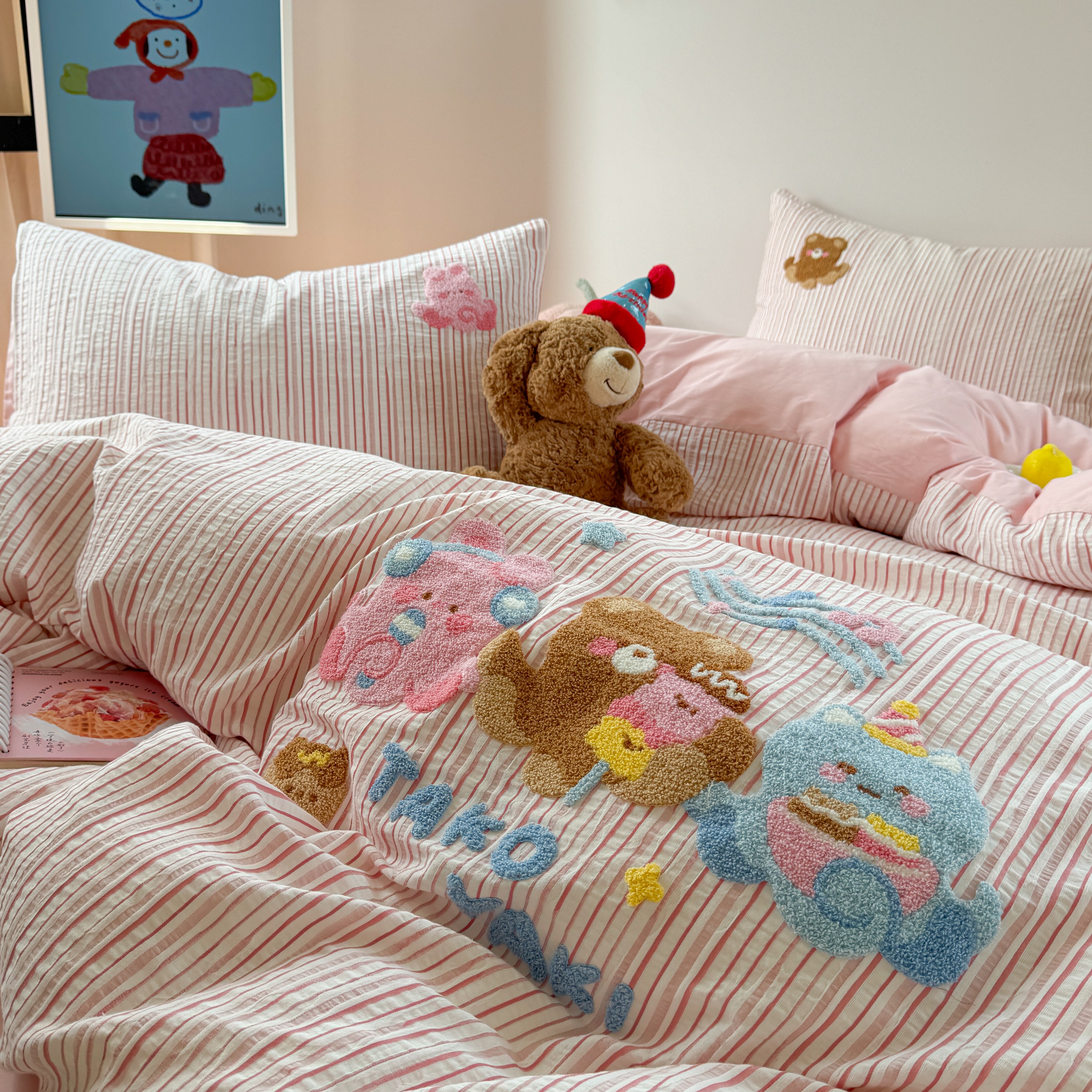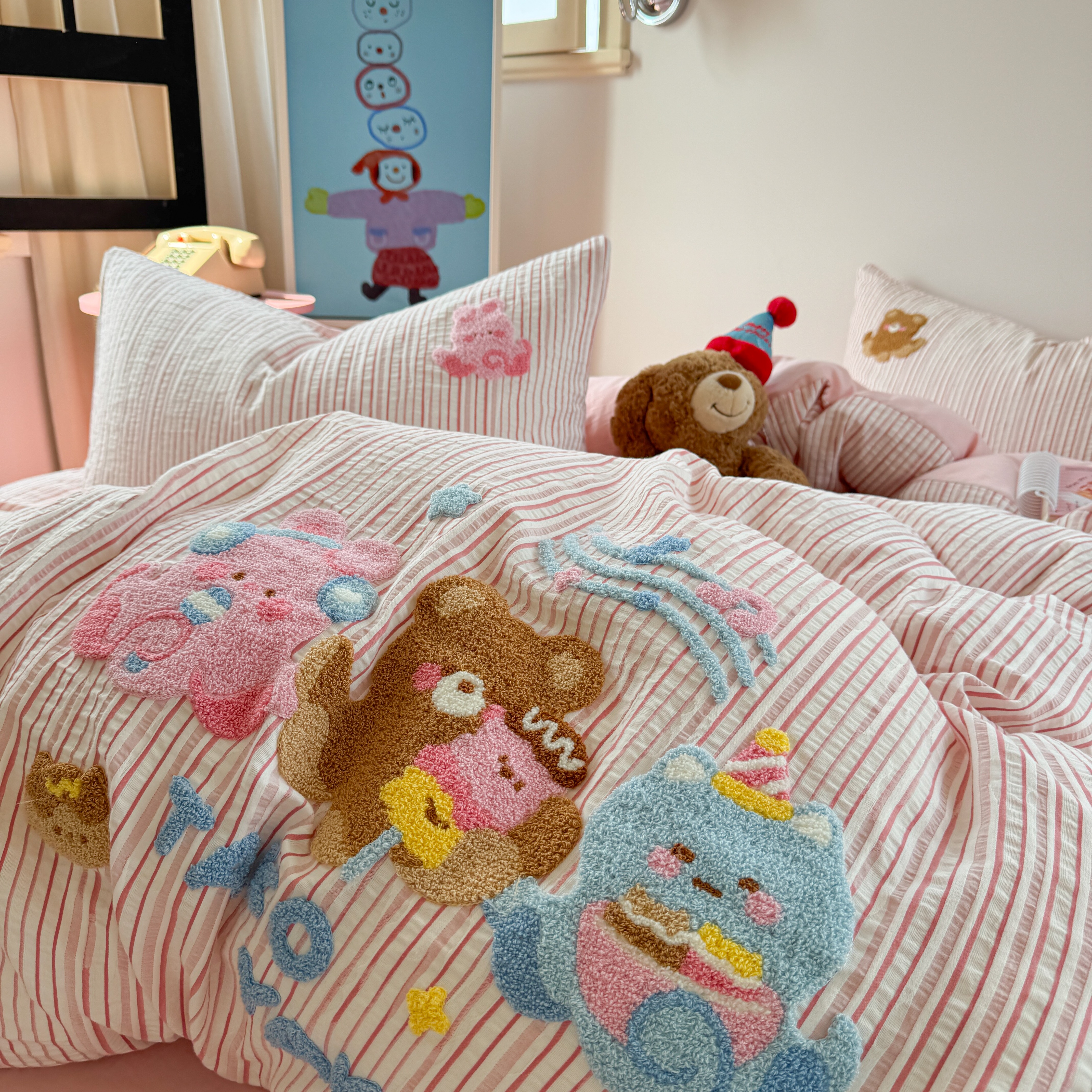 (总)柚子YOUTH 2025新款全棉双层纱贴布绣四件套,棒球熊猫,贝雷帽,冰淇淋小熊,格子玩偶,碎花小兔,小黑猫