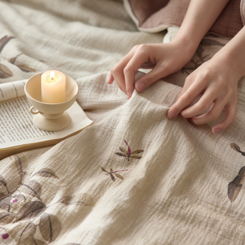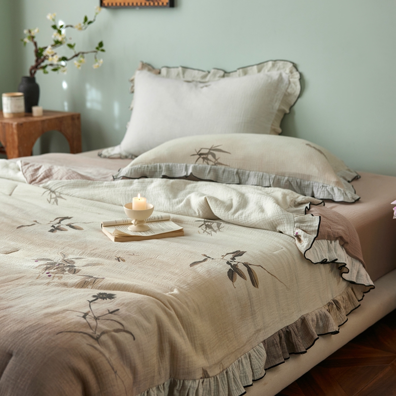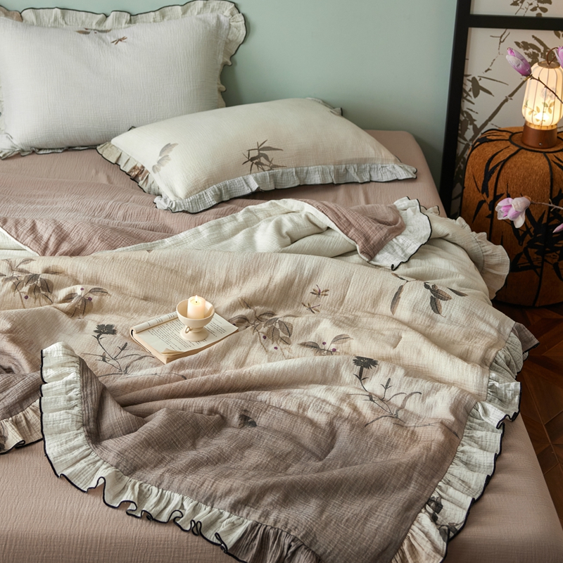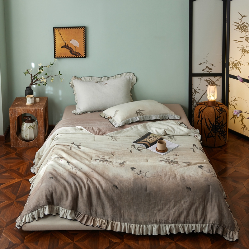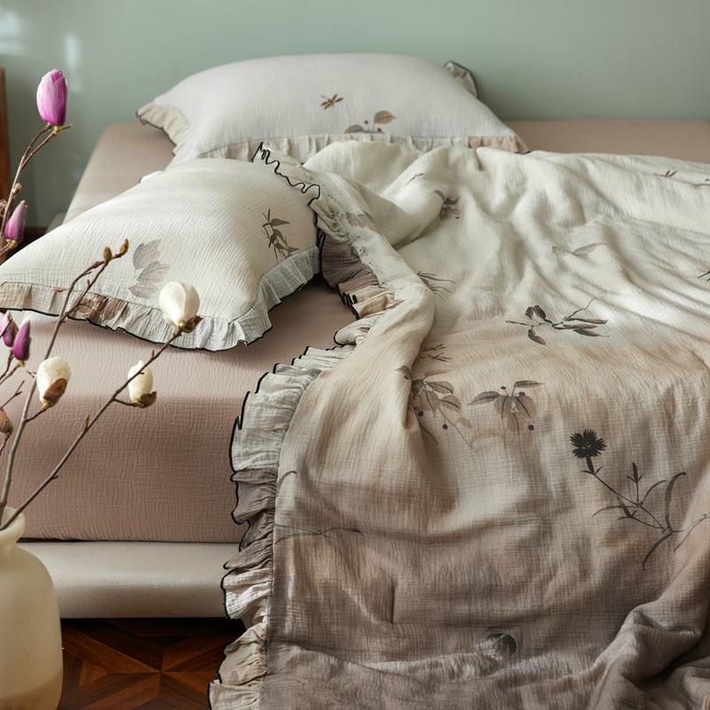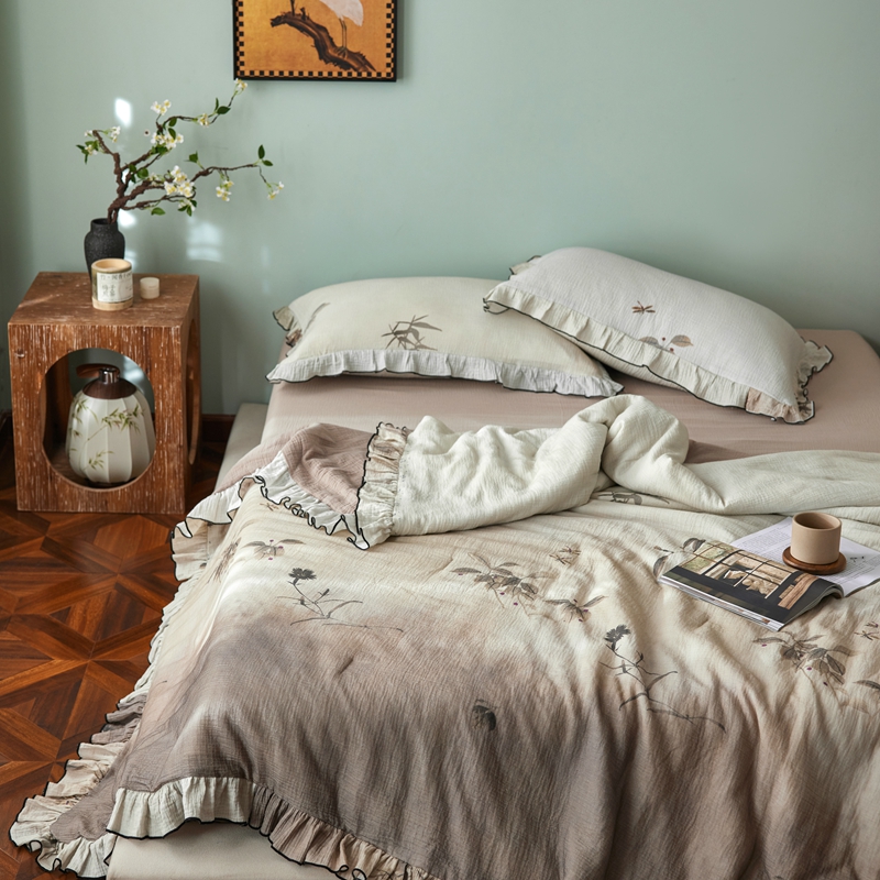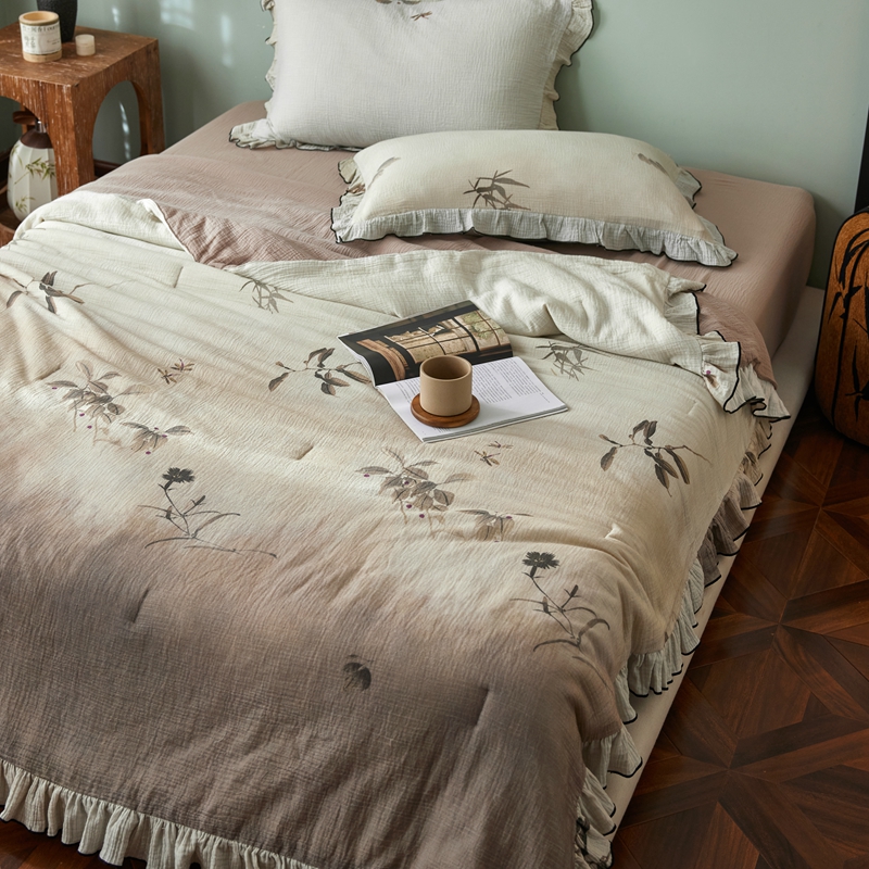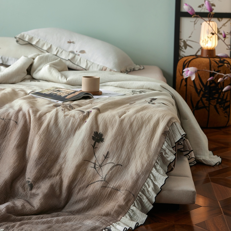 安莱生活 2025新款全棉精梳棉双层纱绉纱数码印花夏凉被 烟雨江南-咖 夏被