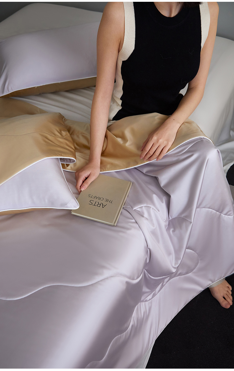 商品名称:头等舱 2025新款水光缎冰肌锦氨A类55植物大豆7A抗菌夏被配包装模特图 水光紫配香槟咖