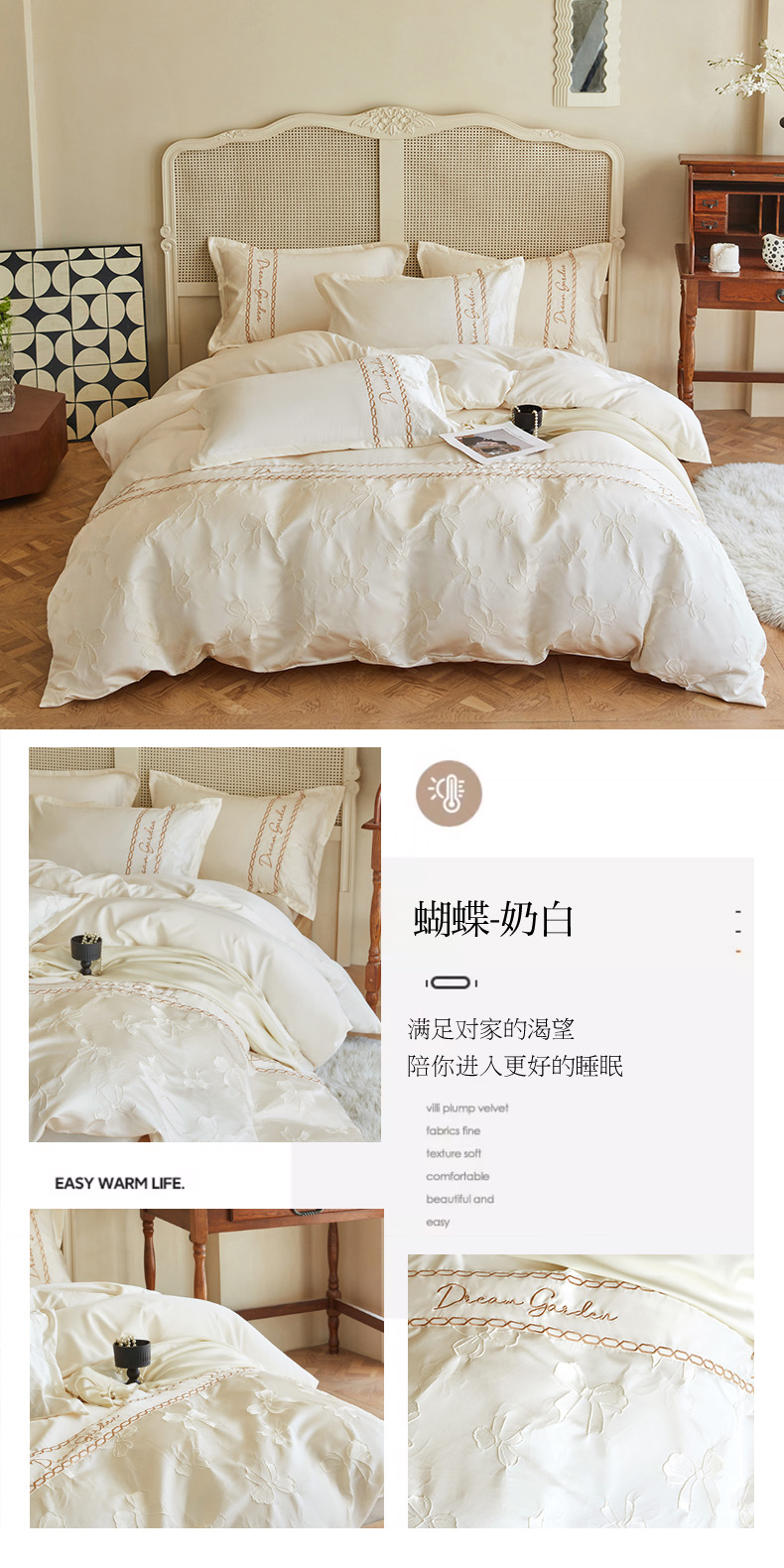 商品名称:菲儿2025新款冰丝浮雕提花绣花四件套 蝴蝶-奶白