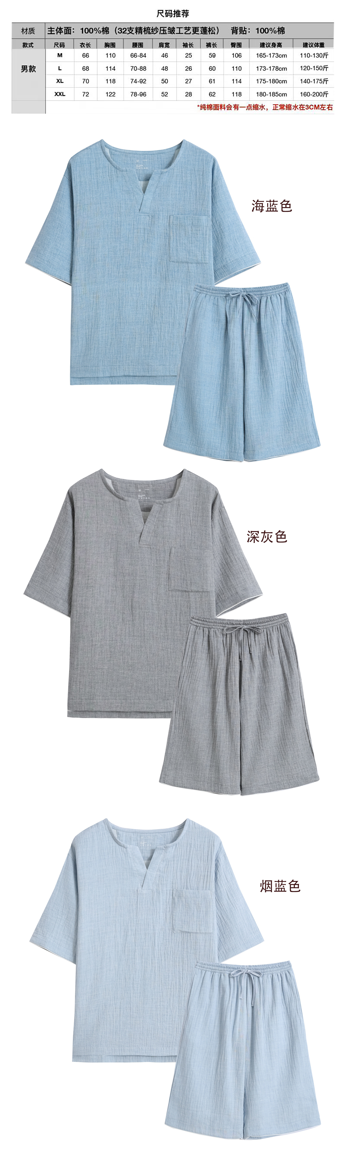 (总)伊嫚家居日式无印风良品全棉双层纱睡衣男纯棉短袖睡衣夏季皱纱短裤家居服,男海蓝色短袖短裤,男深灰色短袖短裤,男烟蓝色短袖短裤