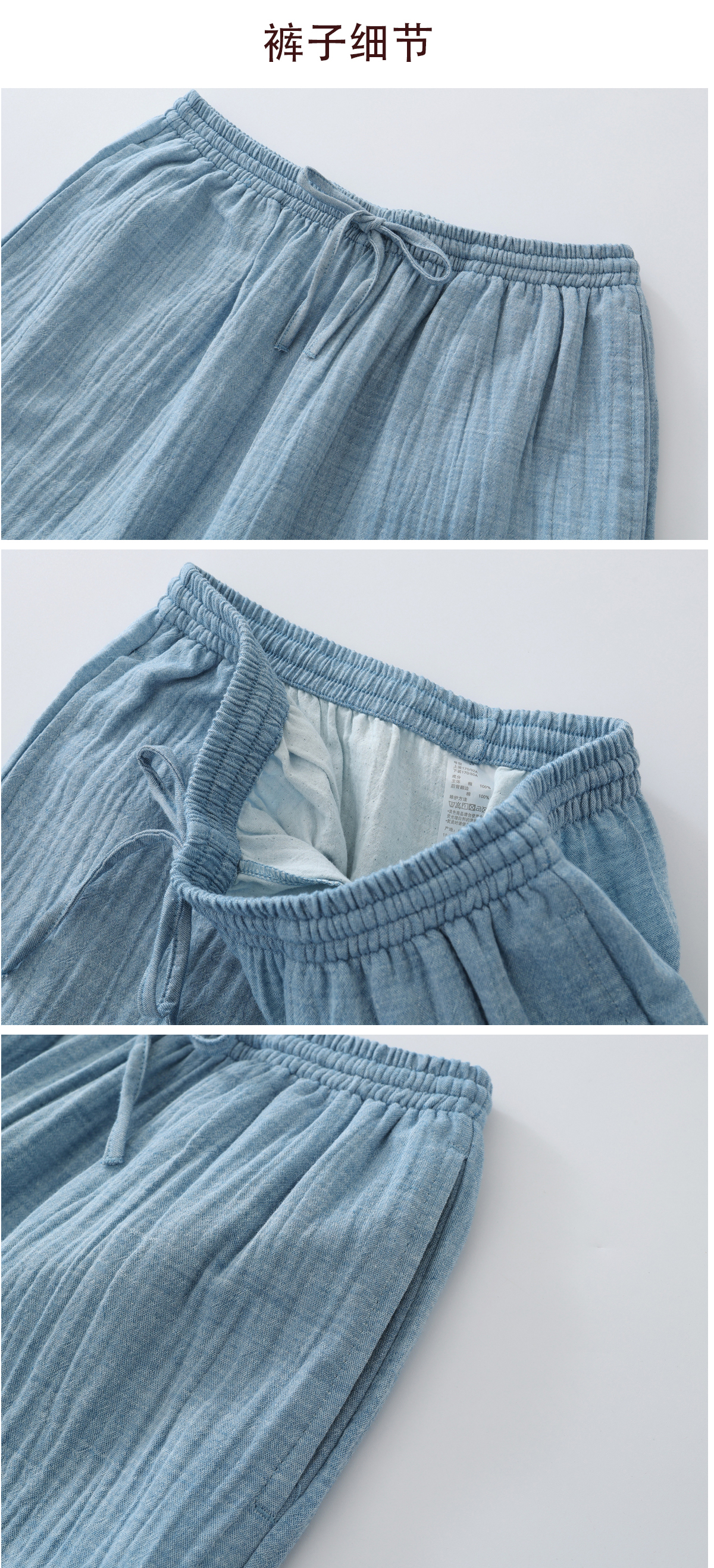 商品名称:伊嫚家居 日式无印风良品全棉双层纱睡衣男纯棉短袖睡衣夏季皱纱短裤家居服 男海蓝色短袖短裤