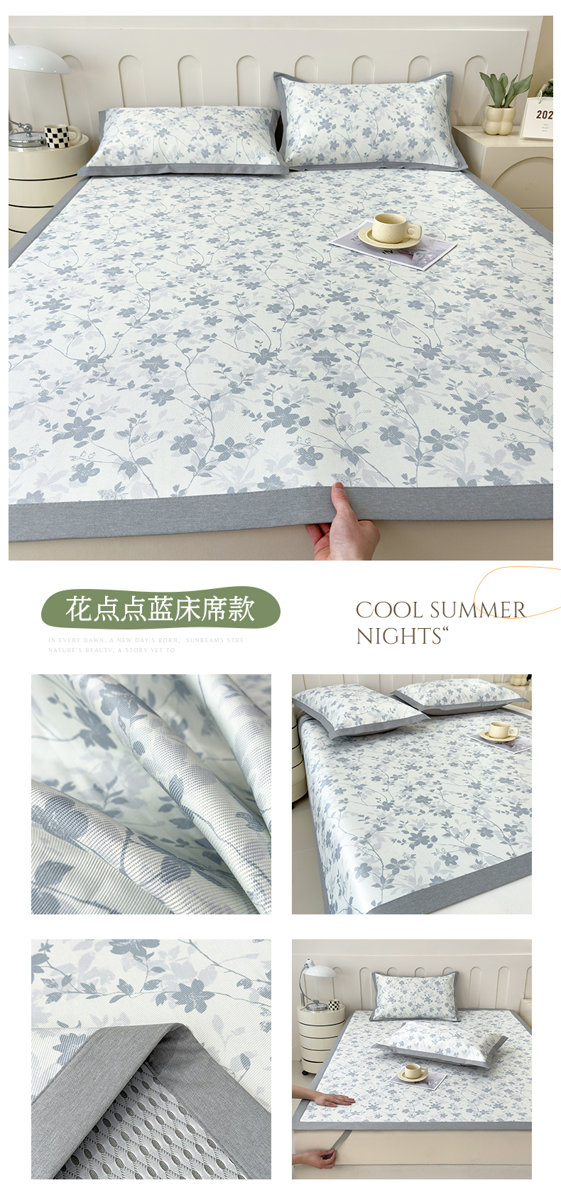 倾慕家纺 2025年新款600D丝滑冰丝凉席-床席款 花点点蓝
