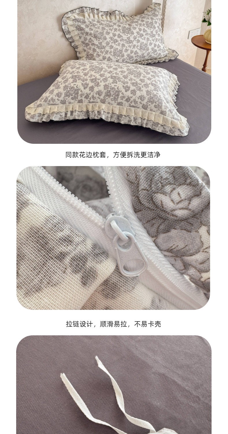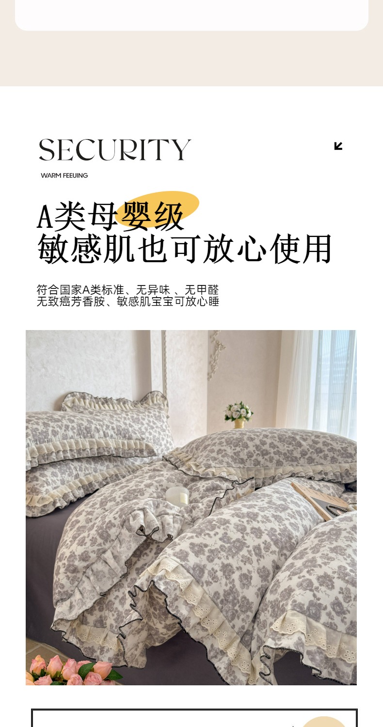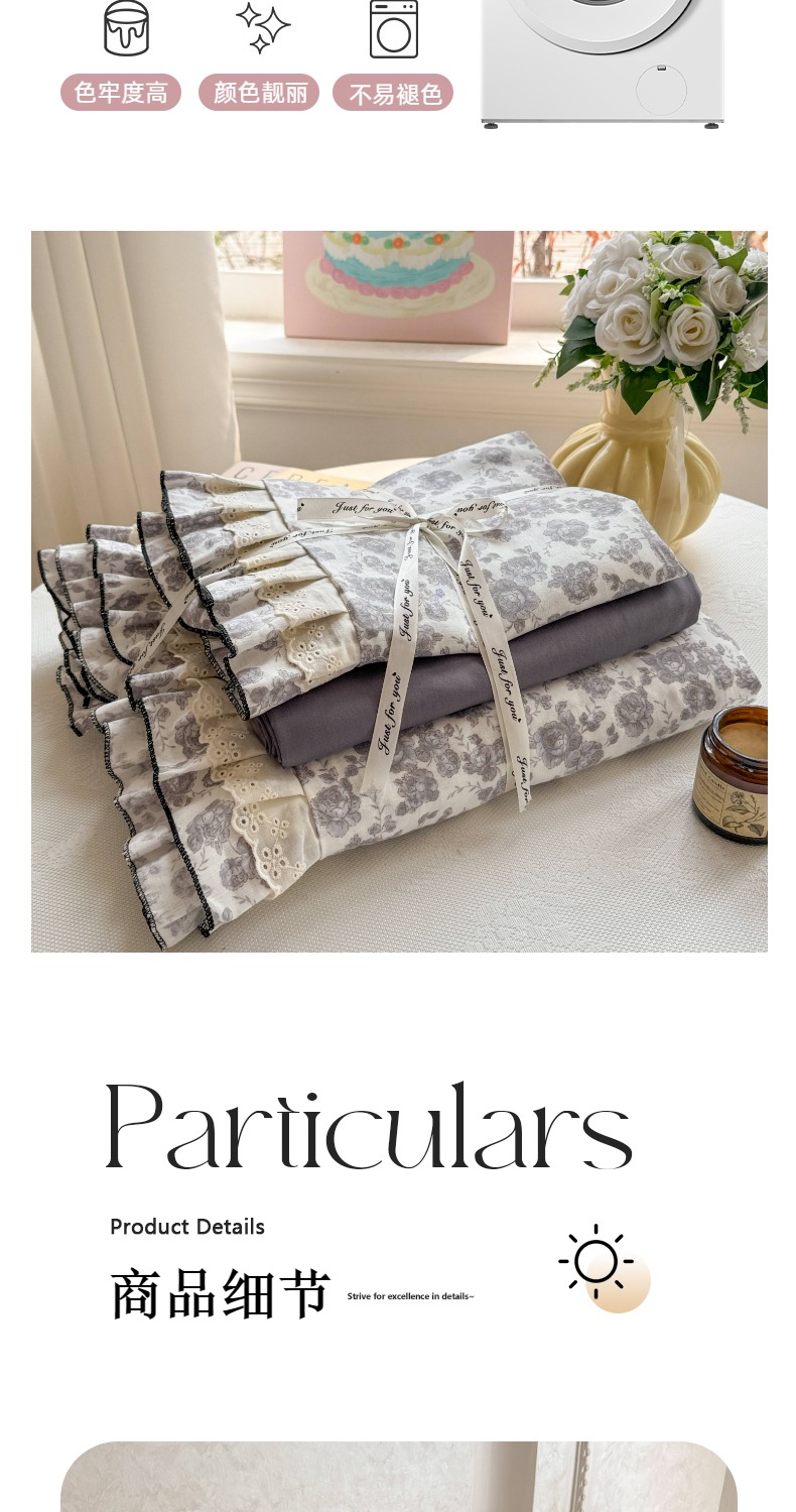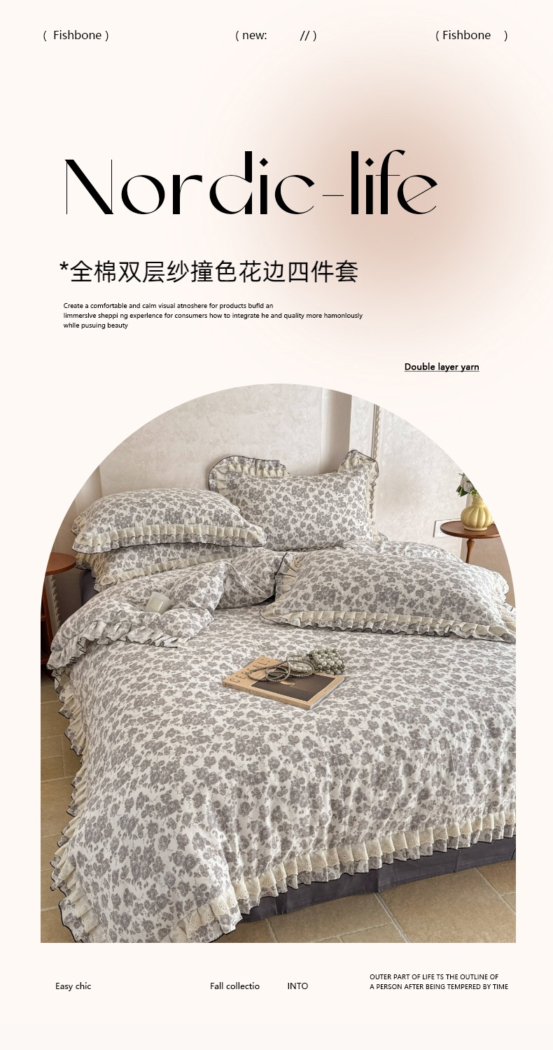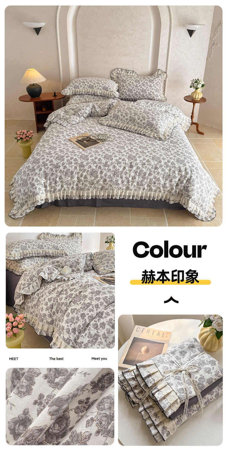 简宜家居(朝初家纺) 2025新款40s全棉纯棉双层纱撞色蕾丝花边四件套 赫本印象
