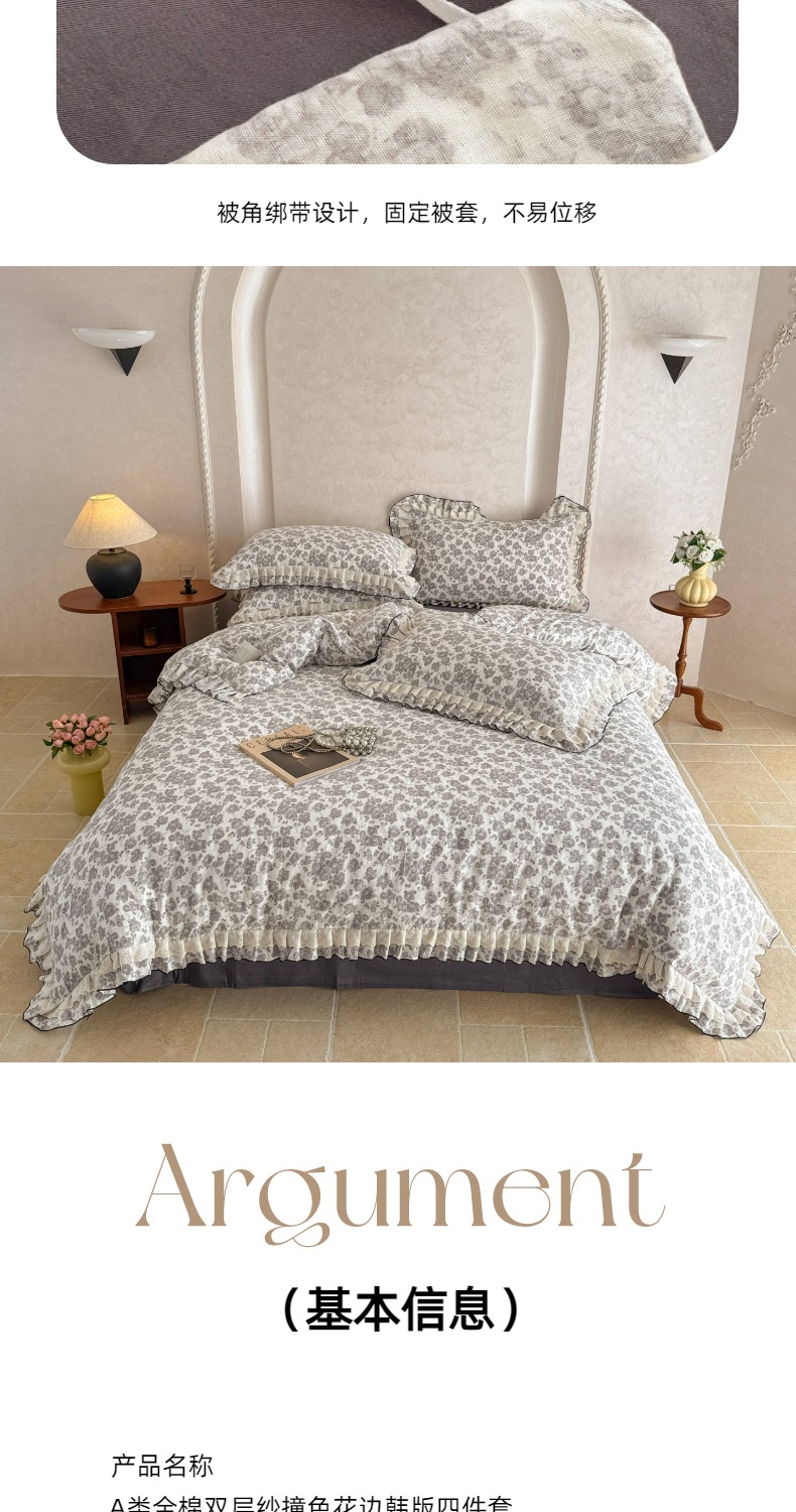 商品名称:简宜家居(朝初家纺) 2025新款40s全棉纯棉双层纱撞色蕾丝花边四件套 赫本印象
