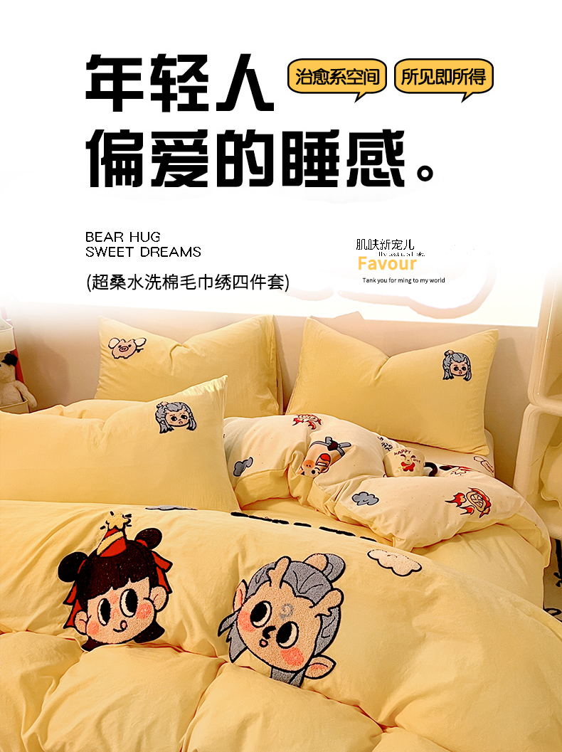 (总)易辰美 2025新款水洗棉毛巾绣卡通四件套,彩条狗,吉他小熊,拉布布,篮球小象,萌趣猫咪,小新与大白