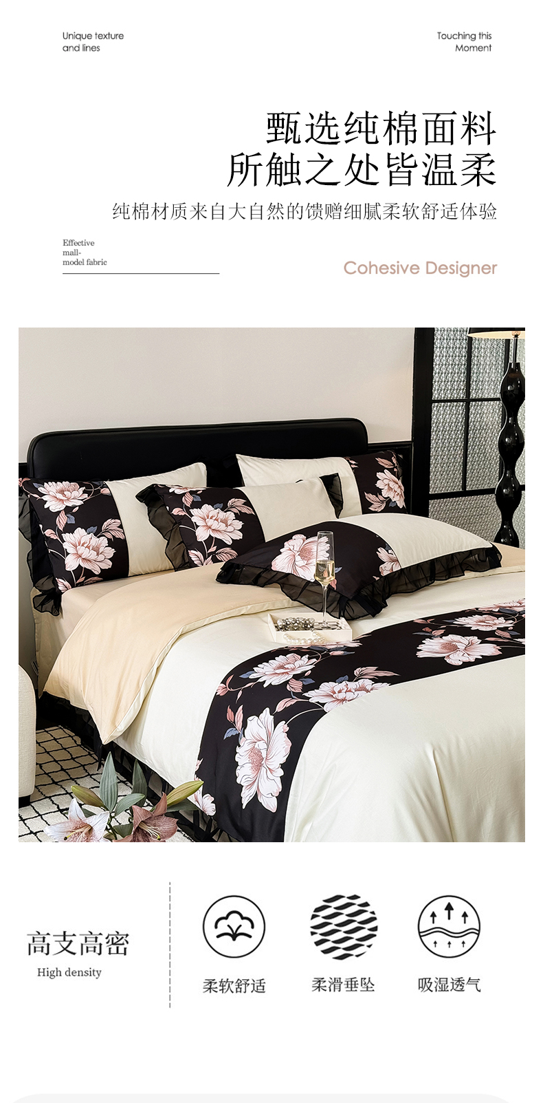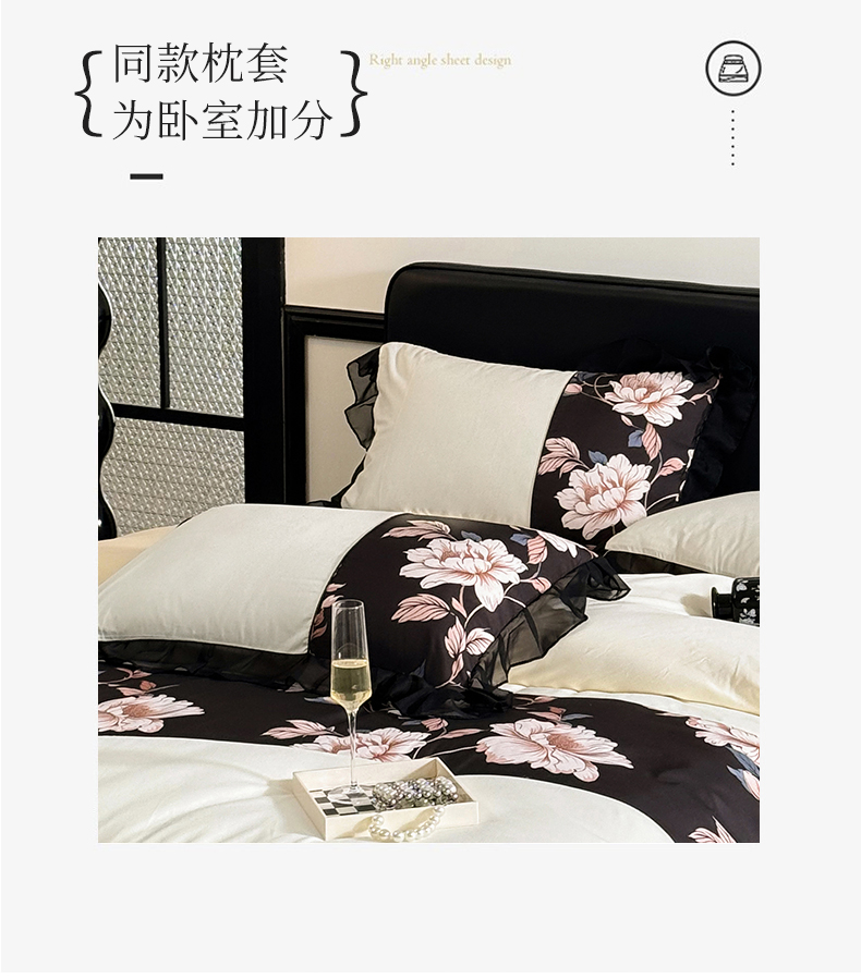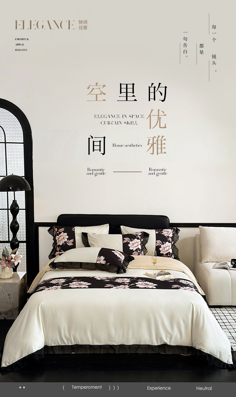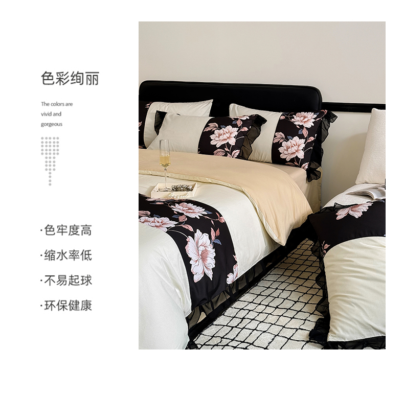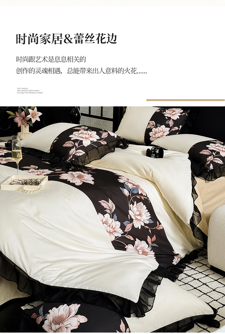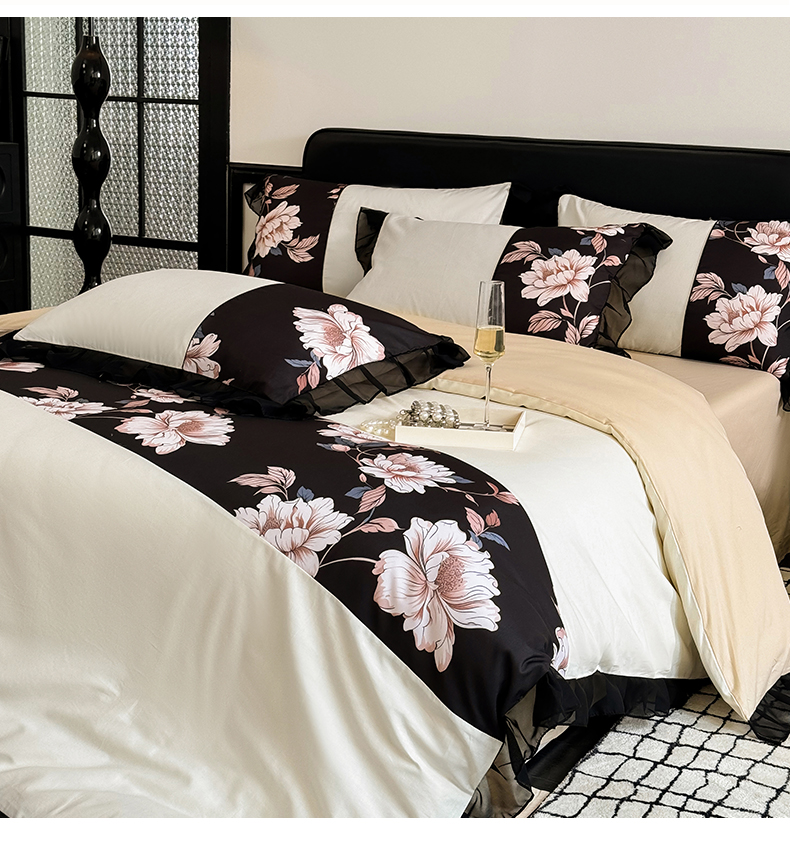 宅家居 2025新款轻法式复古风拼接印花纯棉长绒棉韩式黑色花边40支全棉四件套-赫琳娜 赫琳娜-奶昔白