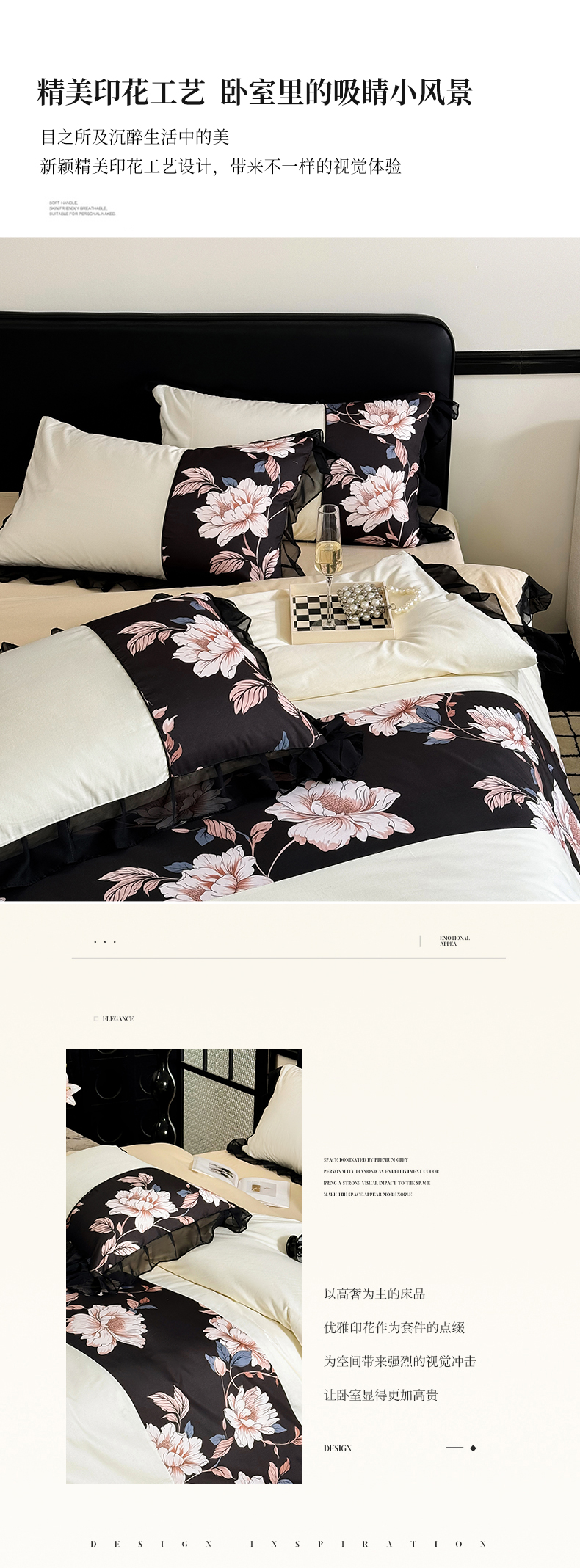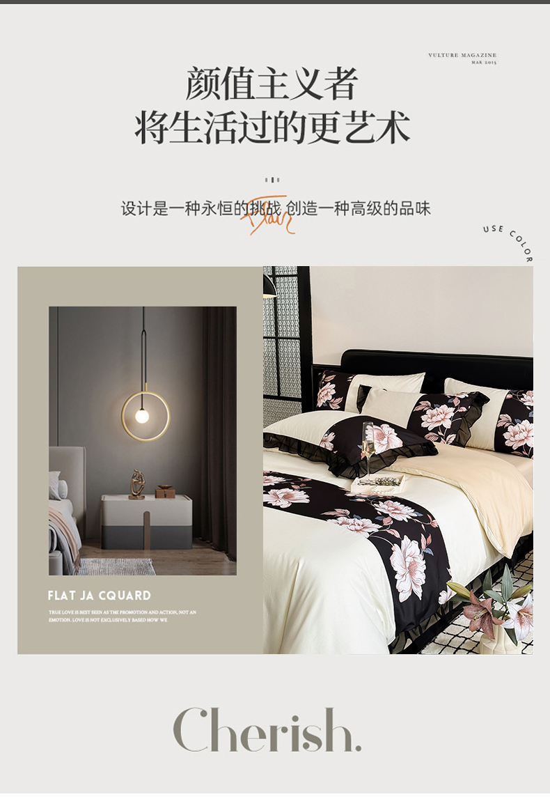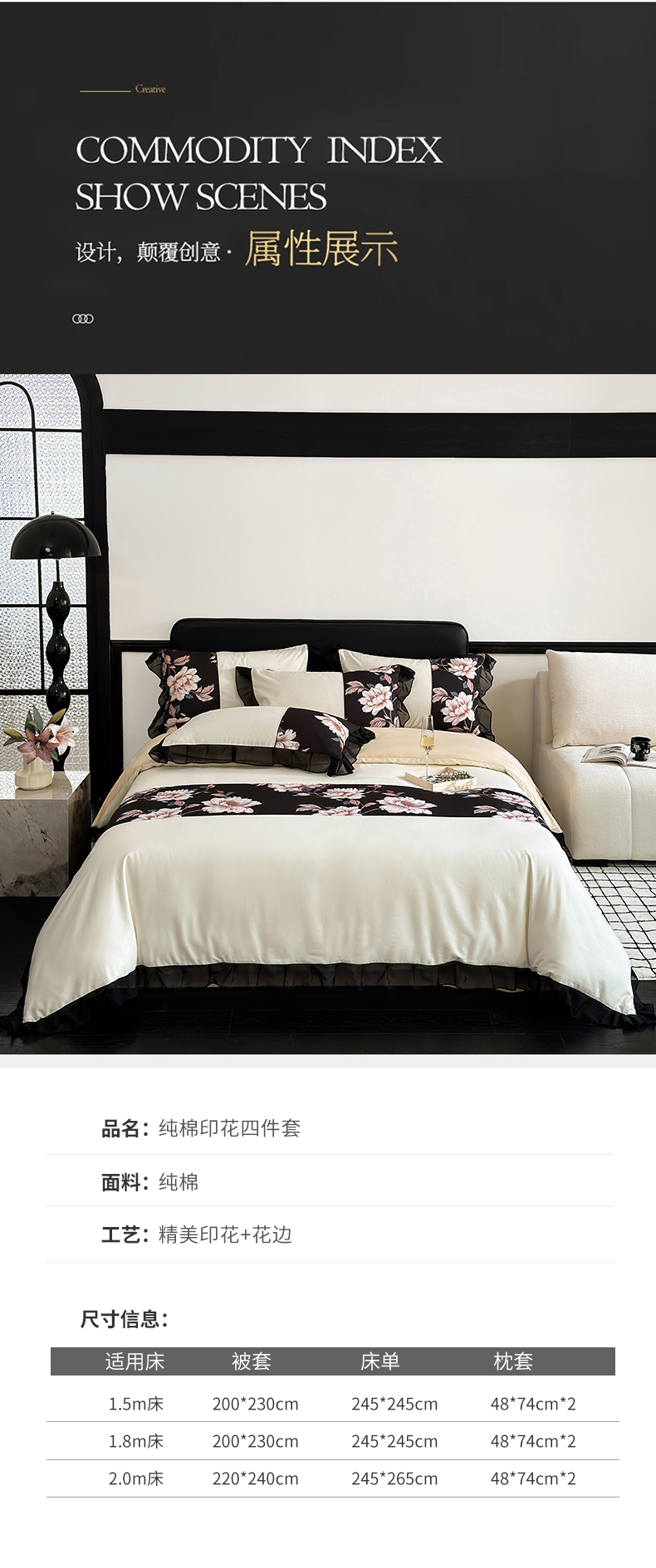商品名称:宅家居 2025新款轻法式复古风拼接印花纯棉长绒棉韩式黑色花边40支全棉四件套-赫琳娜 赫琳娜-奶昔白
