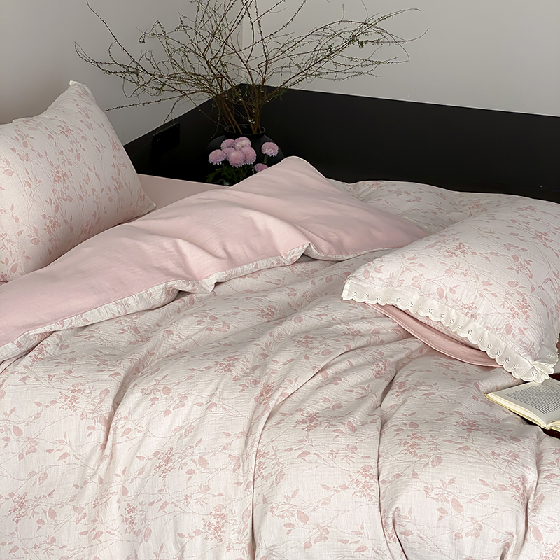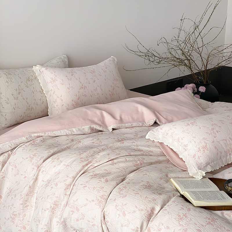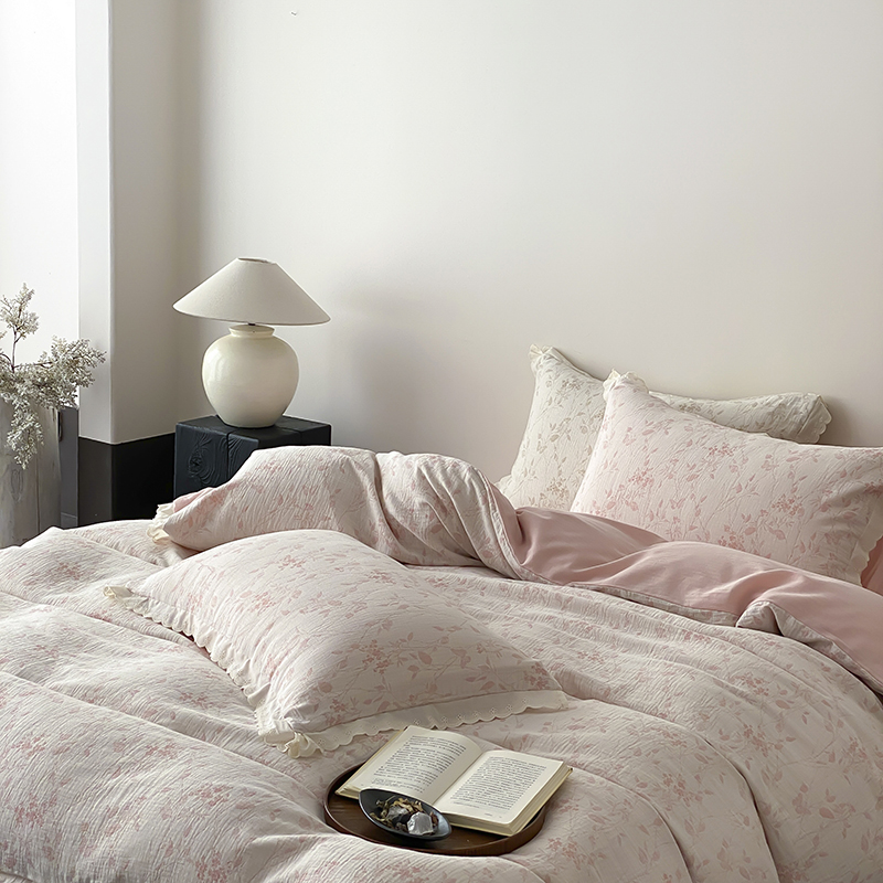 商品名称:梦享生活家居 2025新款双层纱花边四件套 羽叶粉