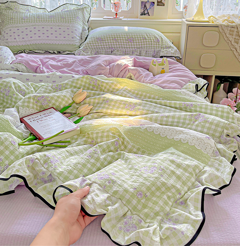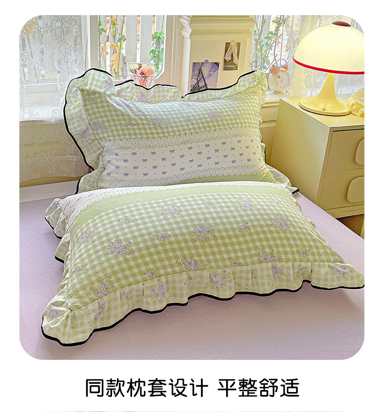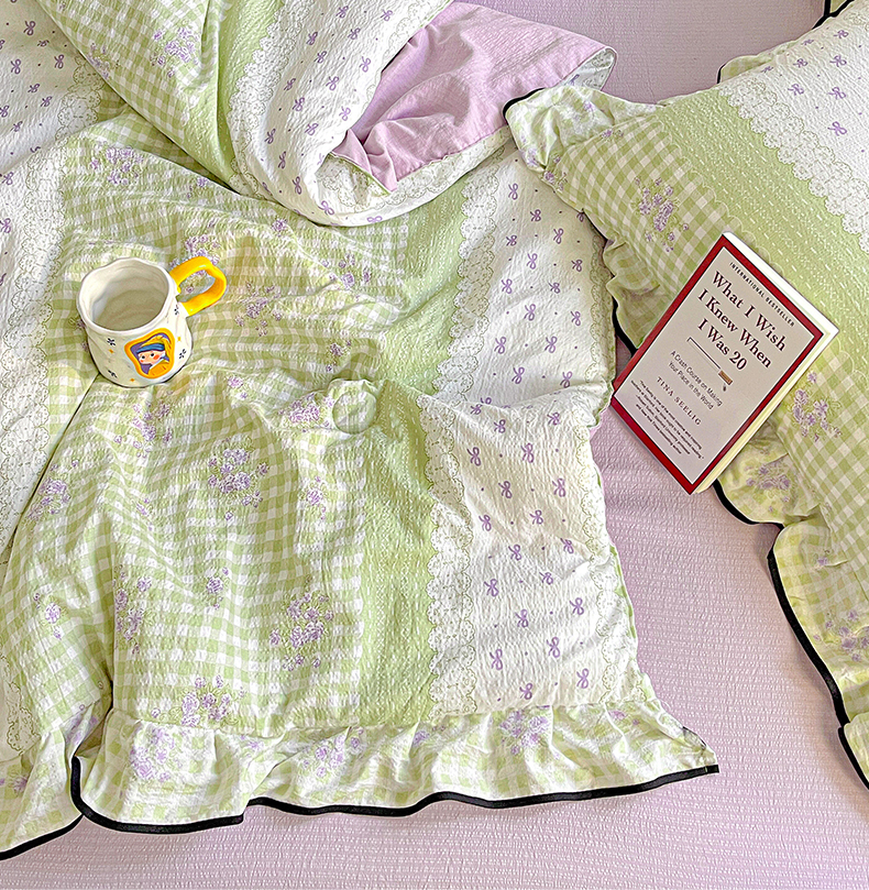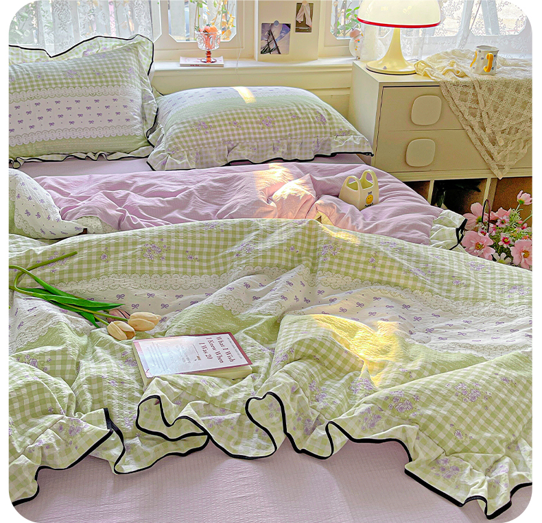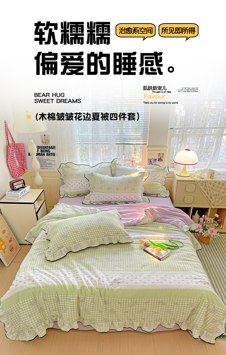 暖芯优选 2025(优选)新款皱皱双层纱荷叶大花边夏被空调被夏凉被三件套 清雅花韵