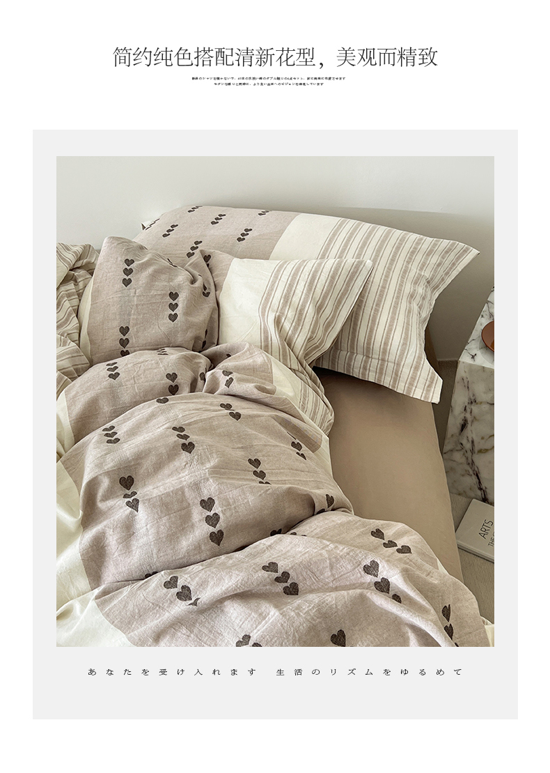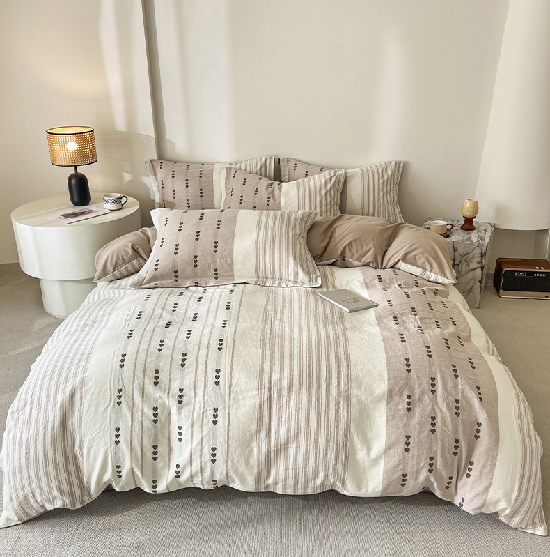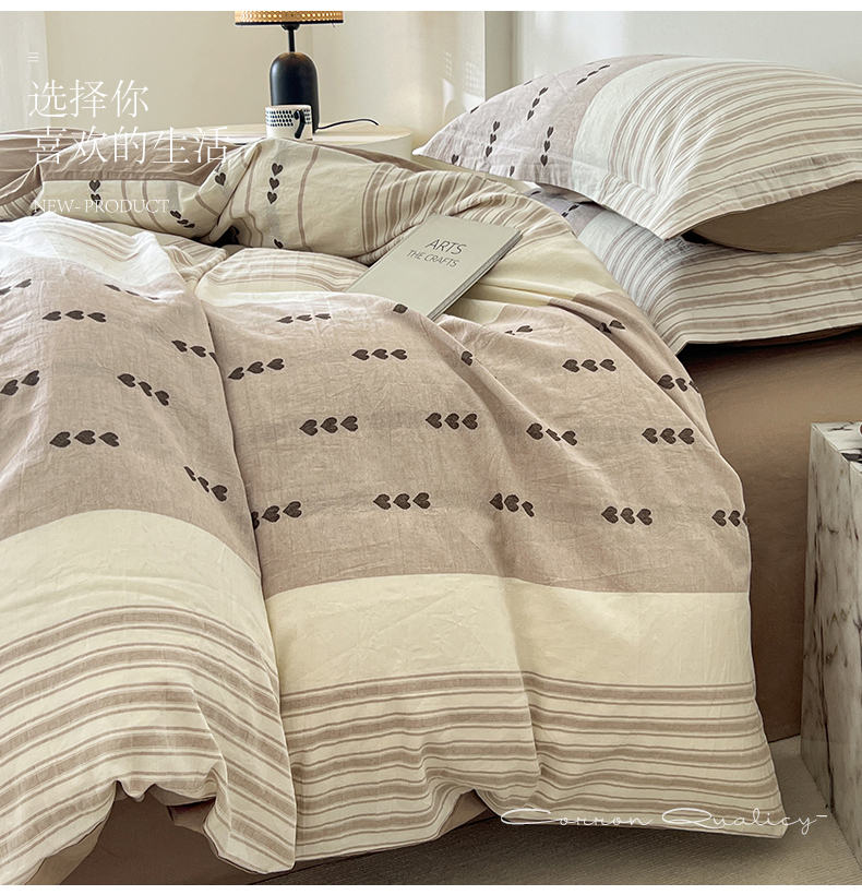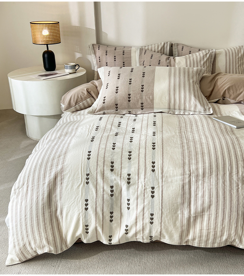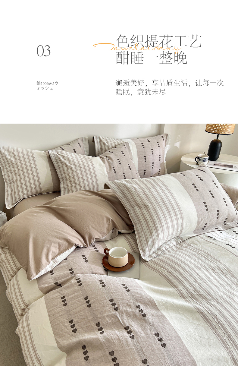 小懒猪2025色织水洗棉提花四件套 爱心条咖