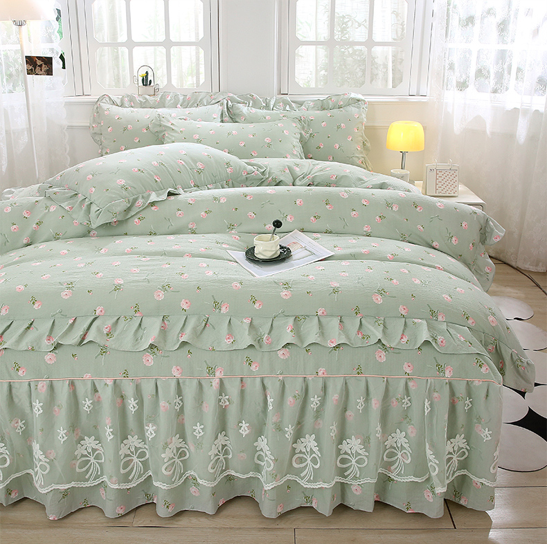 当前位置: 91家纺网 > 商品网购 > 床品套件 > 四件套 > 双层纱四件套 > 衿成家纺 2025新款A类双层纱蕾丝花边床裙四件套 半身倾慕