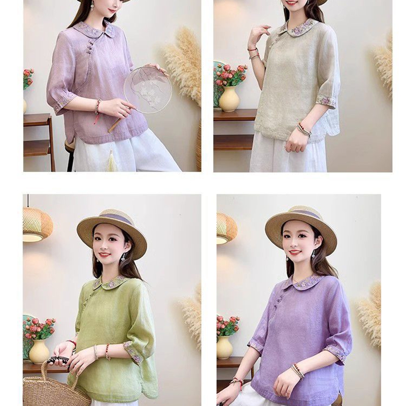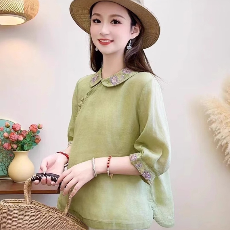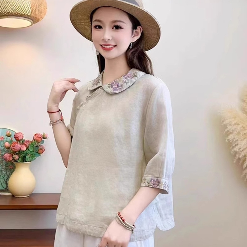 (总)洛兰沙家居馆【只代发】【只代发】 2025夏季新款复古文艺民族风翻领衬衫斜襟中式盘扣女装棉麻茶服上衣女