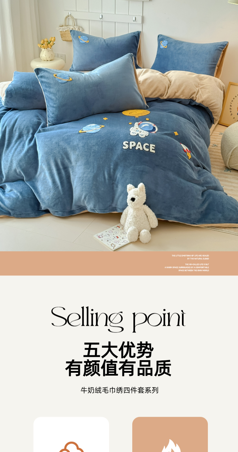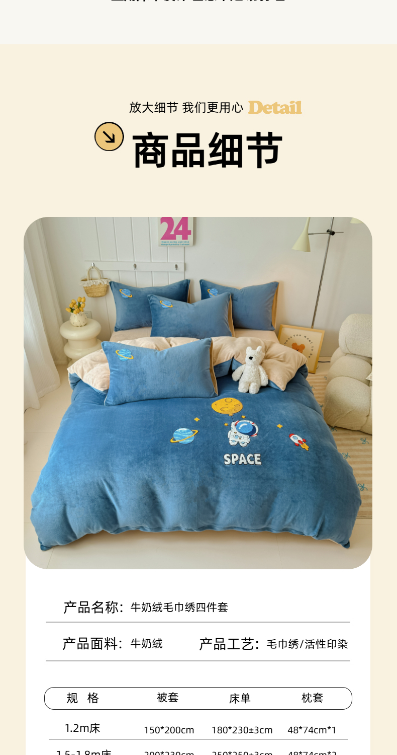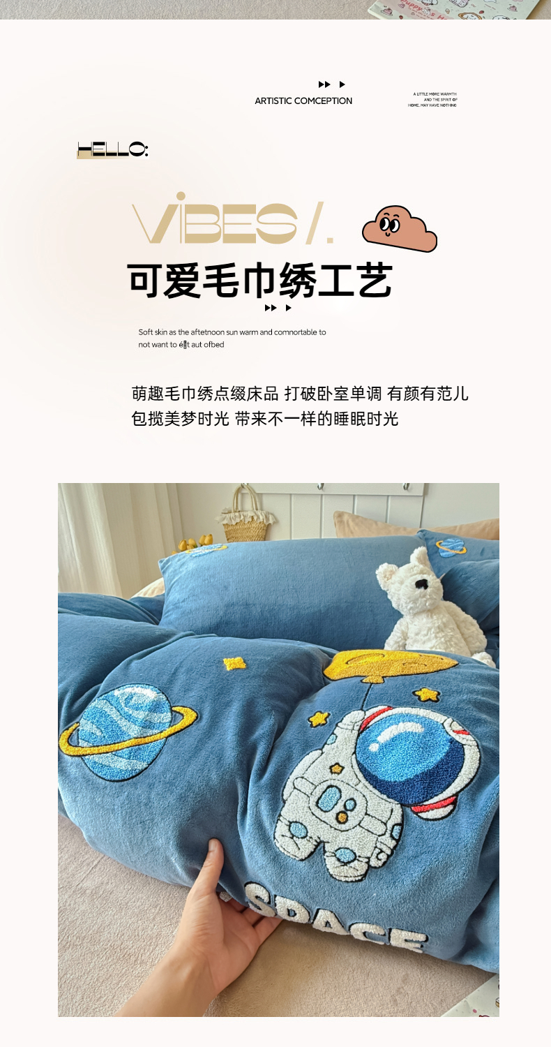 商品名称:莱凯家纺 2025新款毛巾绣牛奶绒四件套 遨游太空