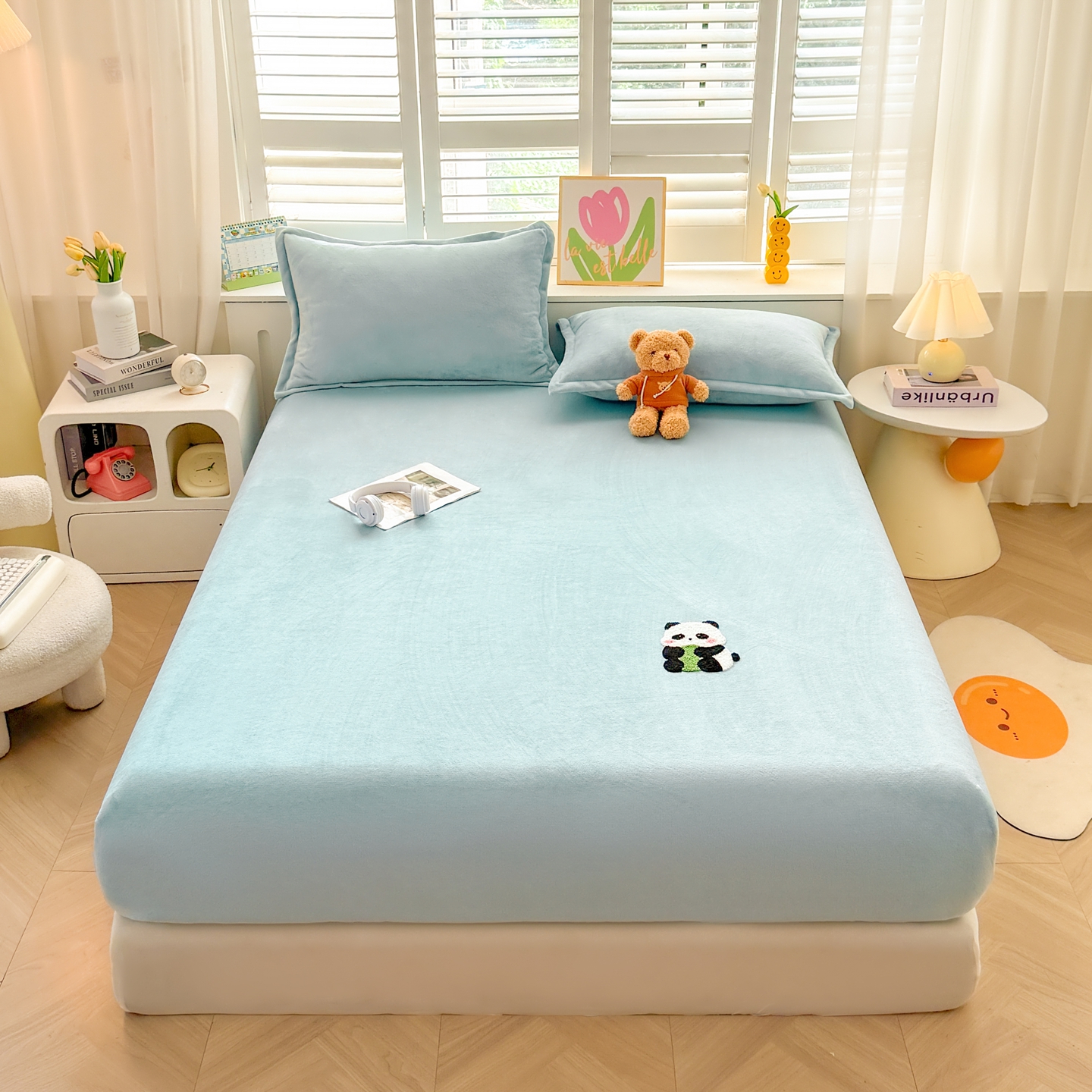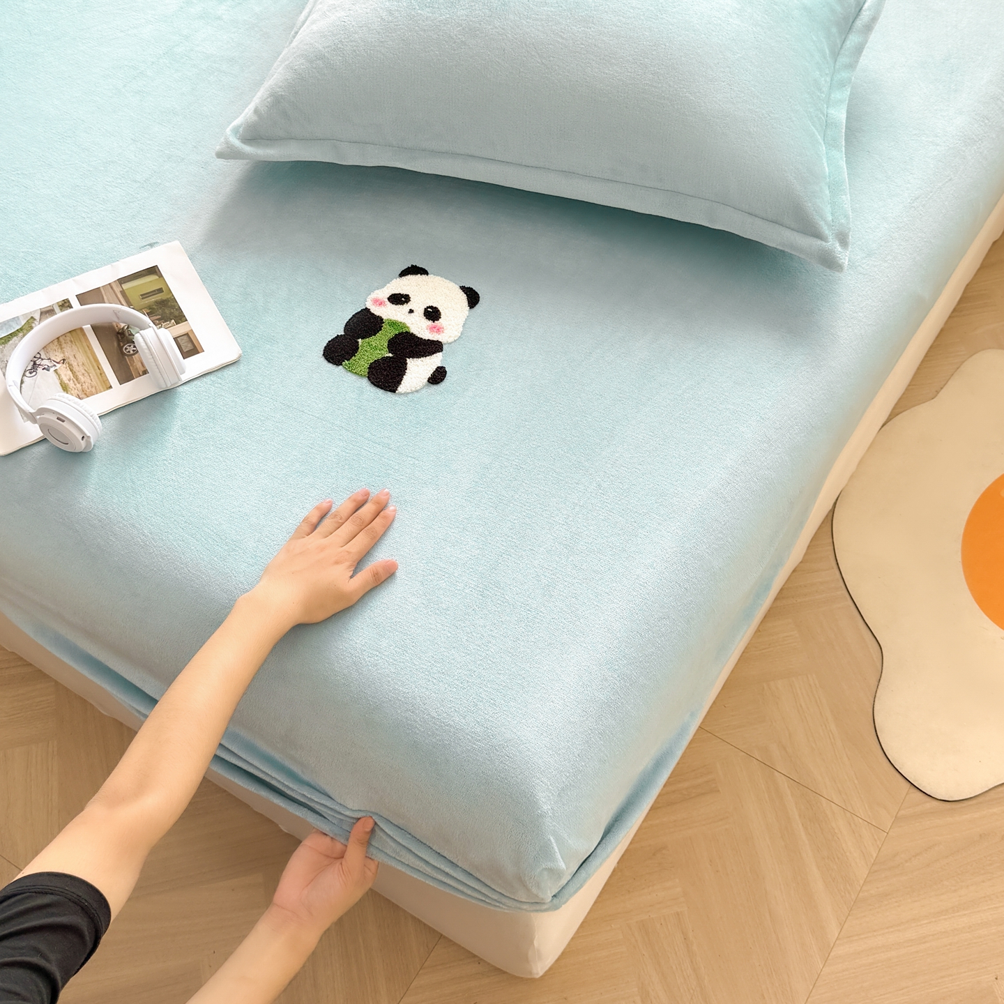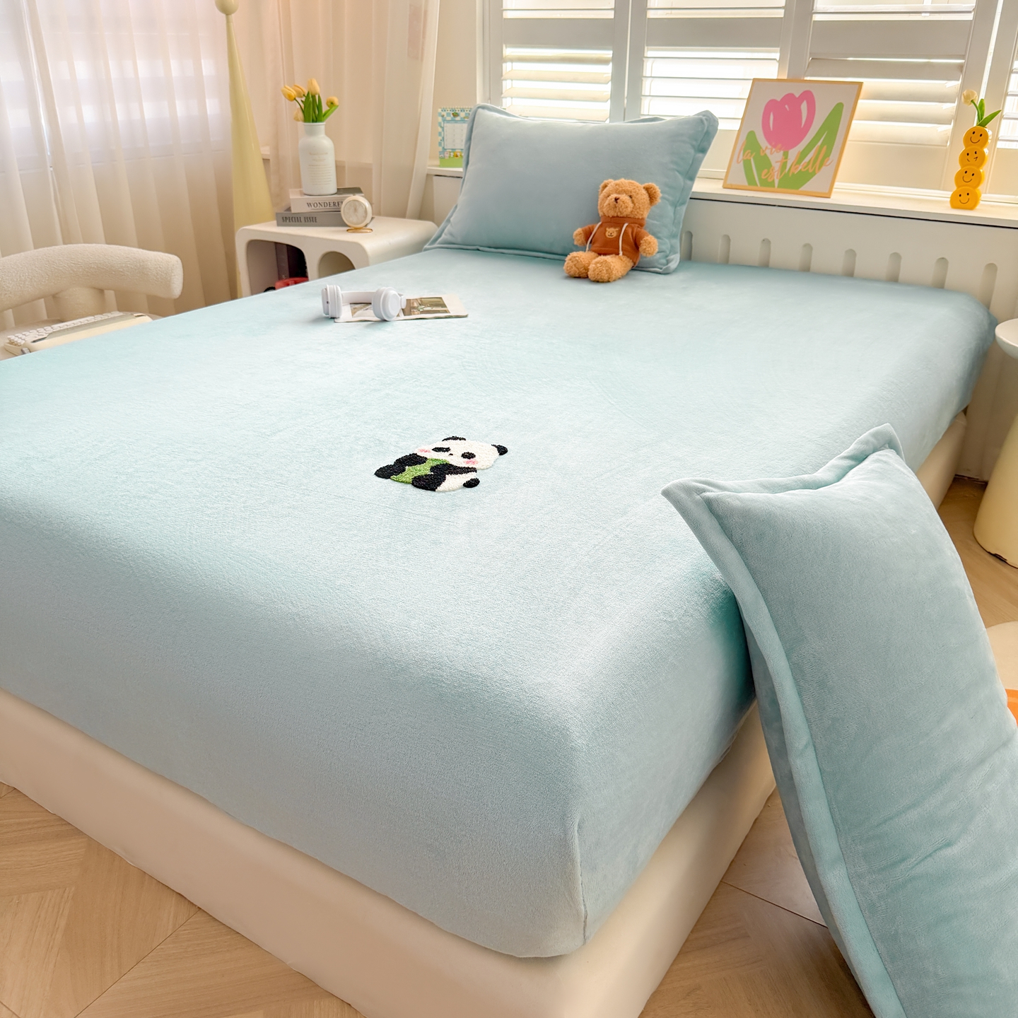 湘之帛 2025新款牛奶绒印花床笠 小熊猫-浅蓝