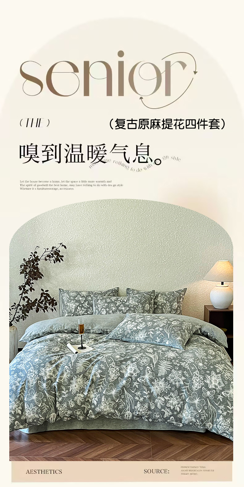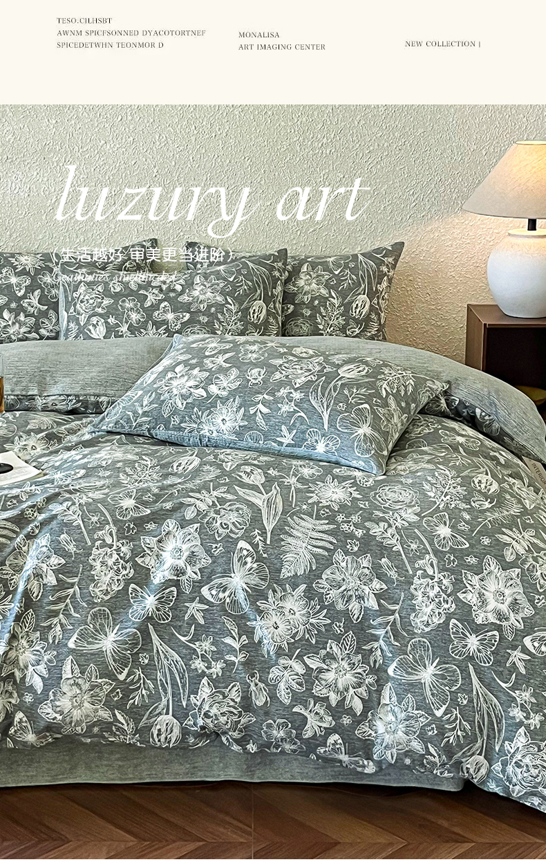斯卡诺家纺 2026新款原麻亚麻皱皱纱四件套水洗棉印花四件套 繁花似锦