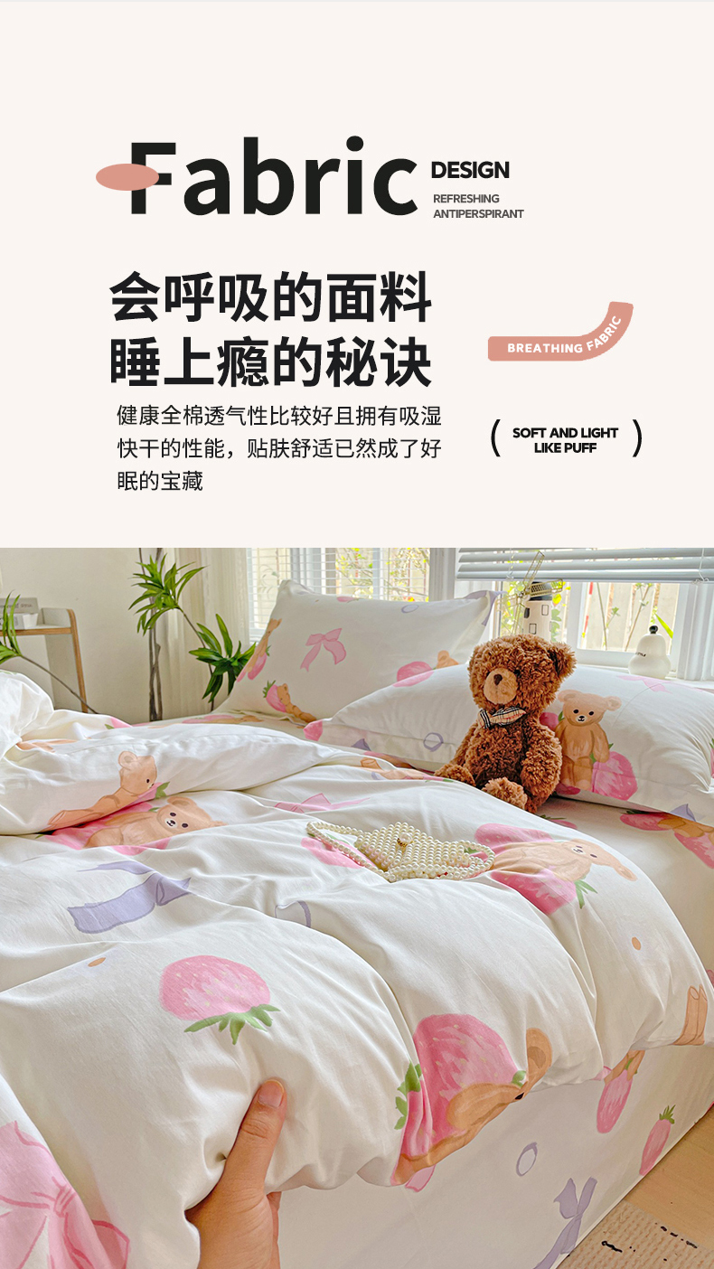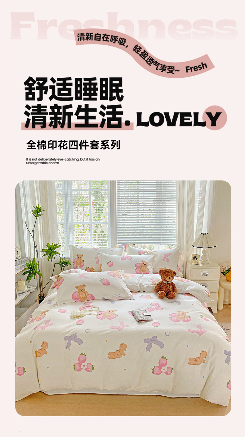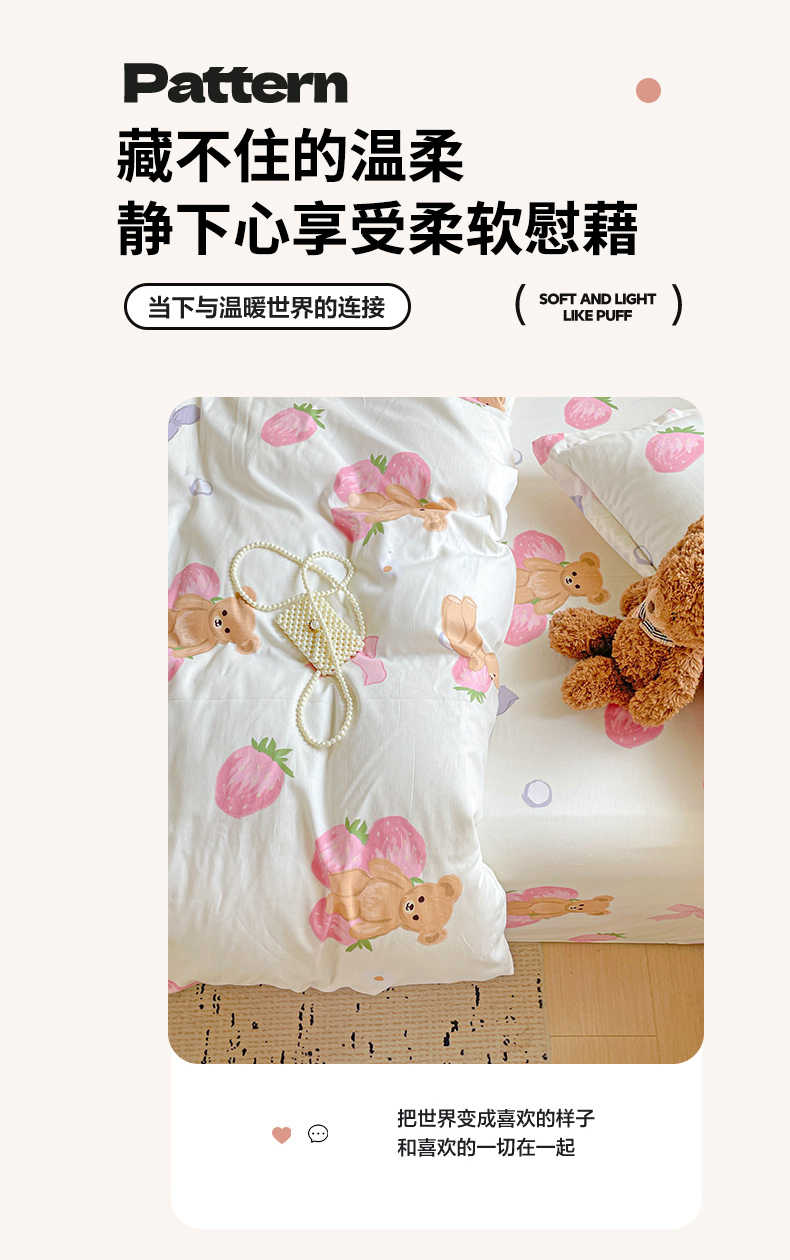 当前位置: 91家纺网 > 商品网购 > 床品套件 > 四件套 > 全棉普通四件套 > 文黛家居 2025新款全棉喷气印花全棉纯棉印花系列四件套 草莓熊-米