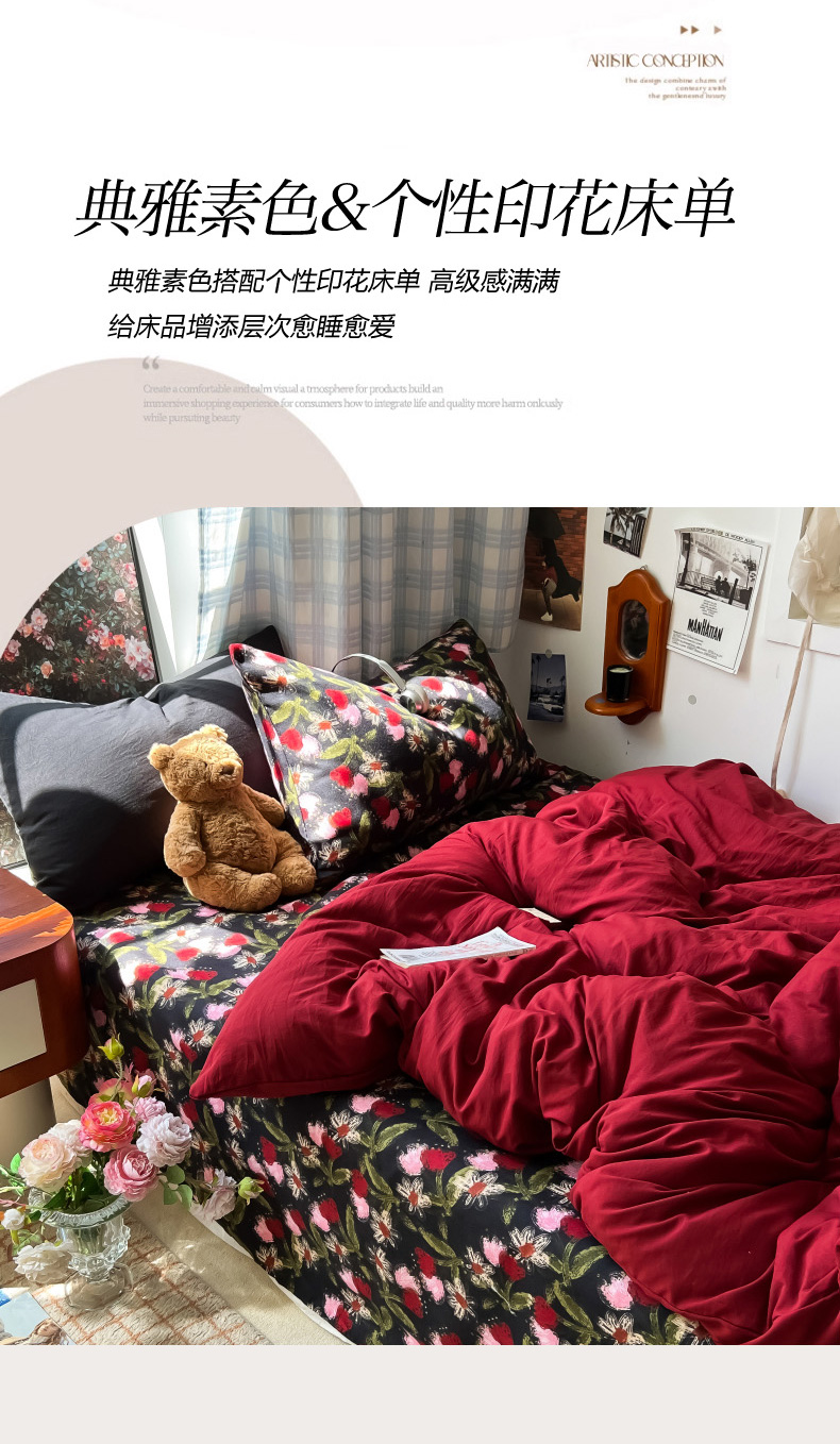 商品名称:花伞家居 2025新款小众高级感纯色花卉拼色加厚水洗棉四件套【提供买家秀】 番喜-红