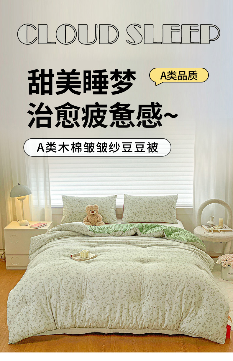 • 91家纺网 家纺一手货源 找家纺 丫丫家纺 2025新款云感木棉皱皱纱被子豆豆绒大豆被冬被被芯春秋豆豆被 茶语-绿