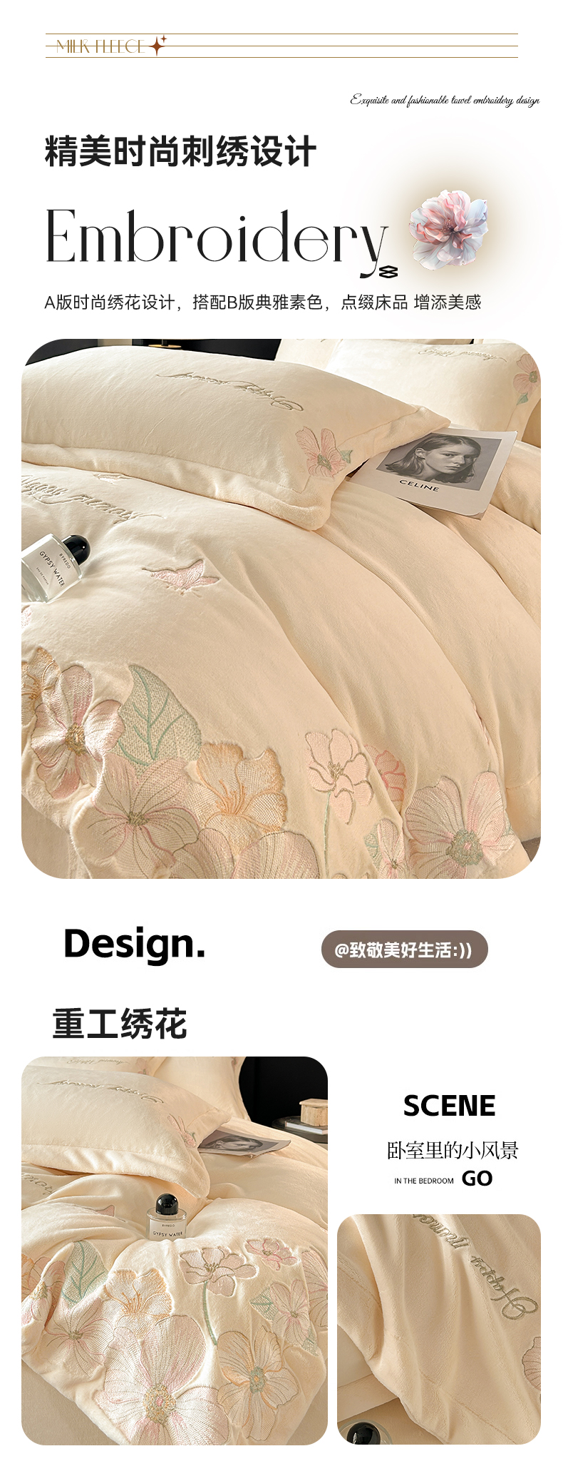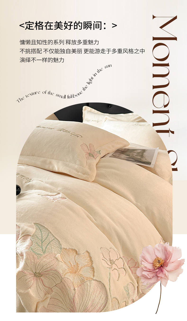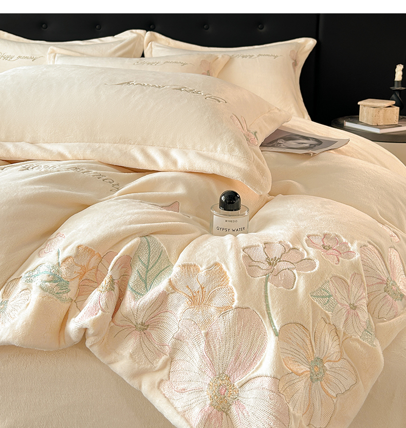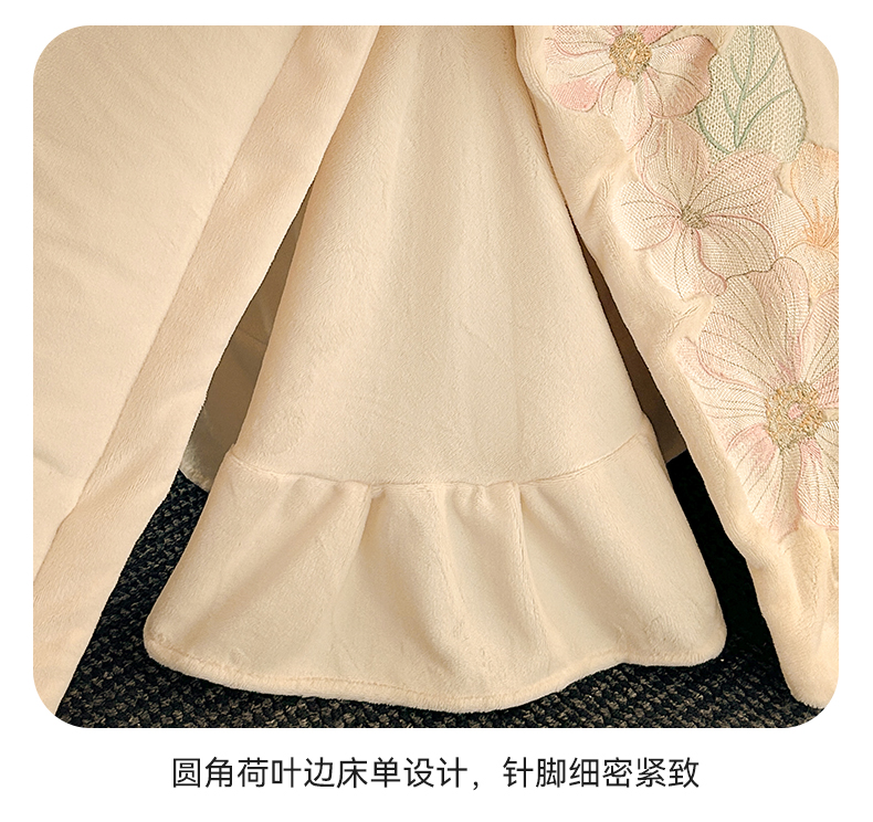 恋绒家纺 2025新款牛奶绒刺绣四件套-花舞 月牙黄