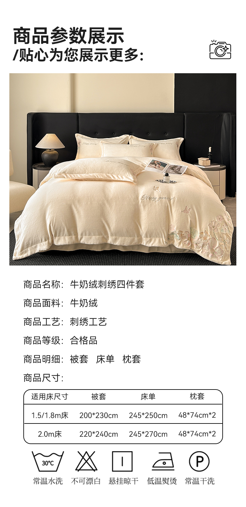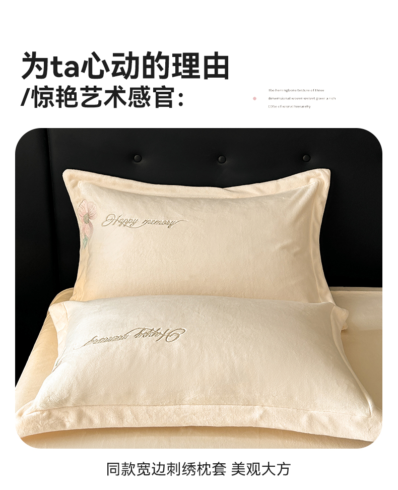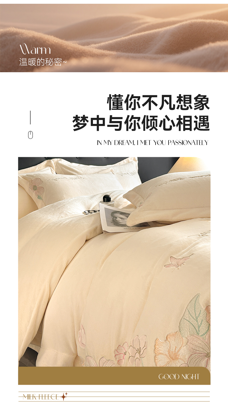 商品名称:恋绒家纺 2025新款牛奶绒刺绣四件套-花舞 月牙黄
