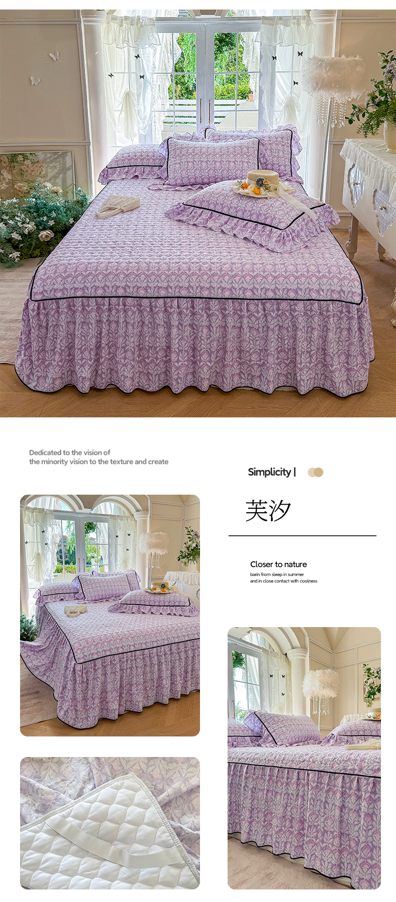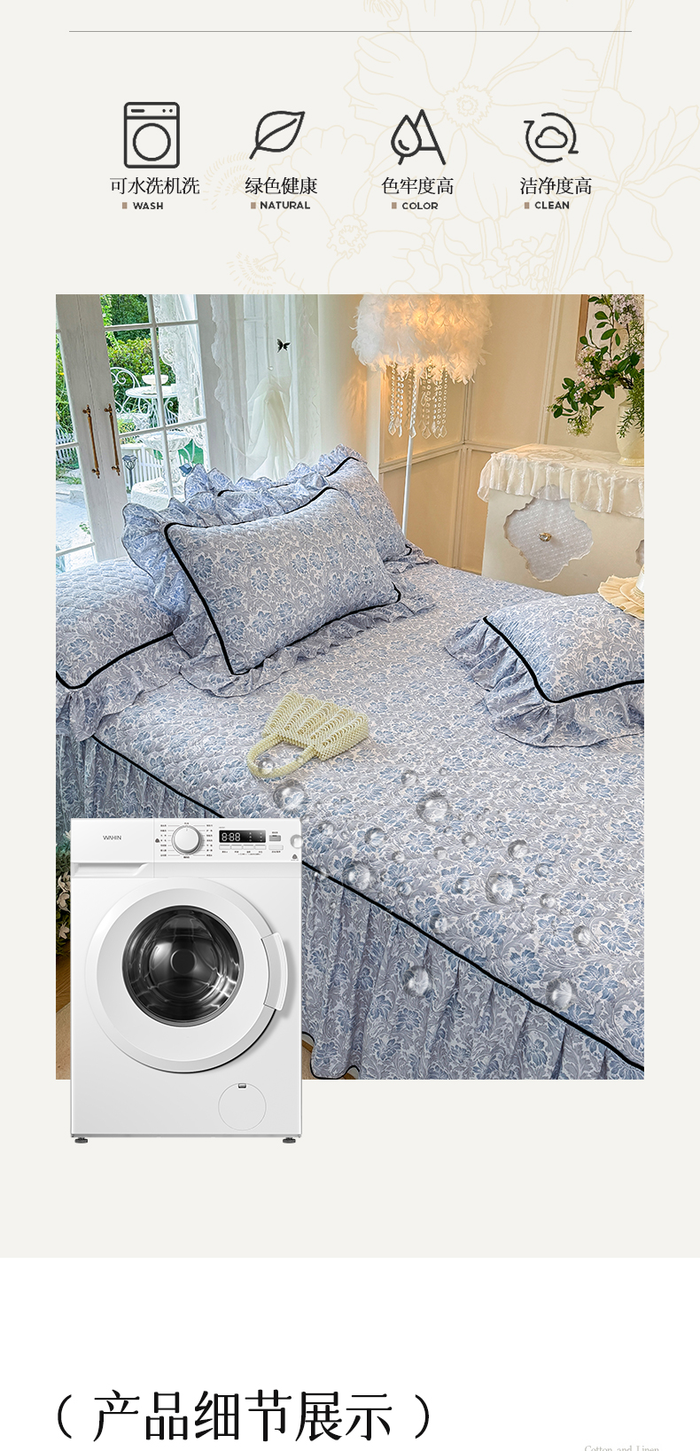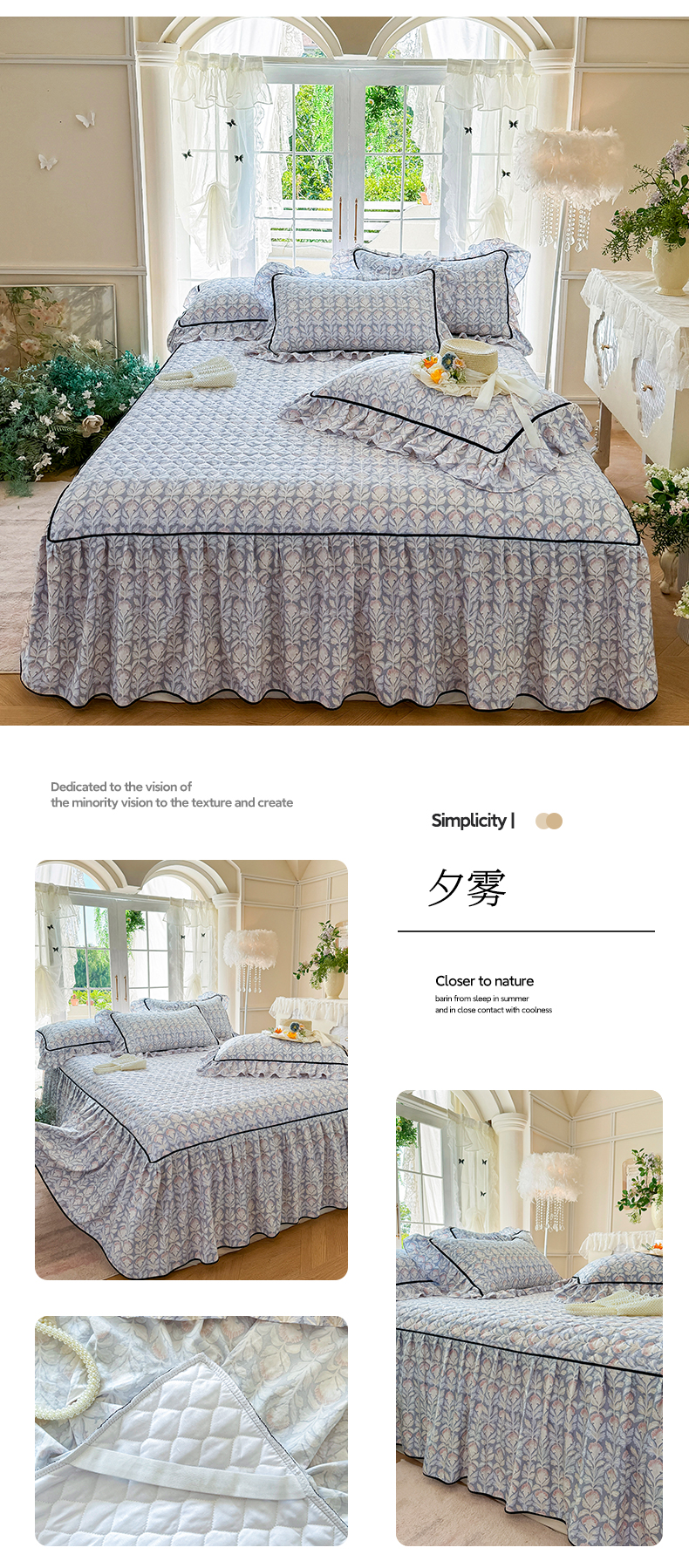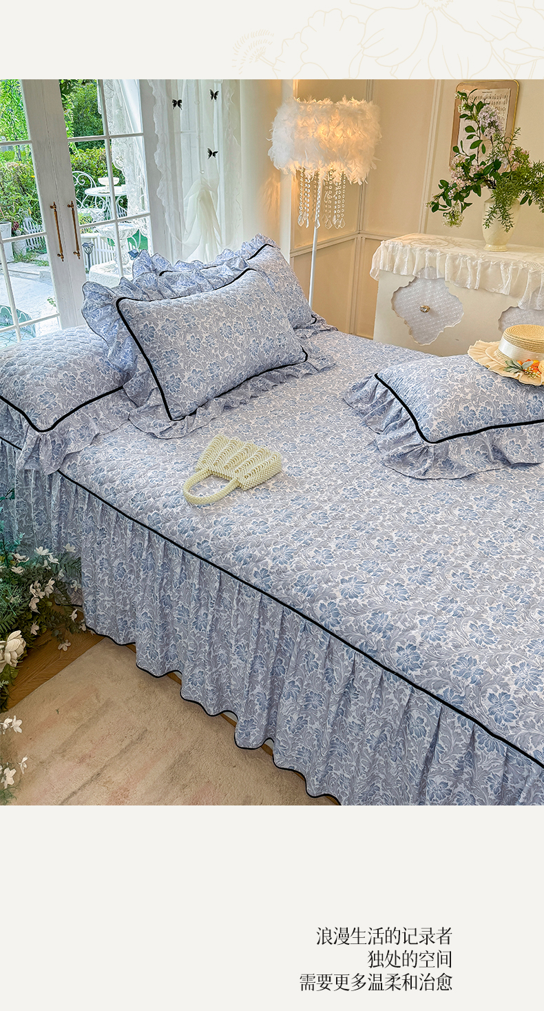 当前位置: 91家纺网 > 商品网购 > 床品套件 > 三件套 > 宜凡家纺 2025新款A类水洗珍珠棉夹棉床裙三件套 兰伊