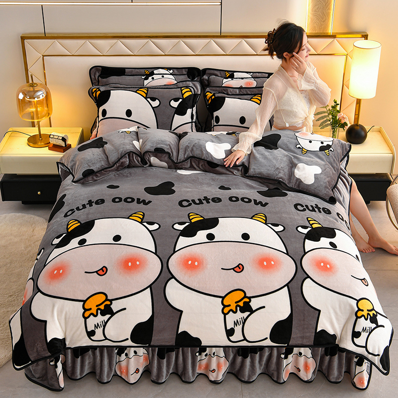 硕喜 2025新款新8.5斤法莱绒四件套珊瑚牛奶金貂绒四件套床裙款 奶牛,奶牛