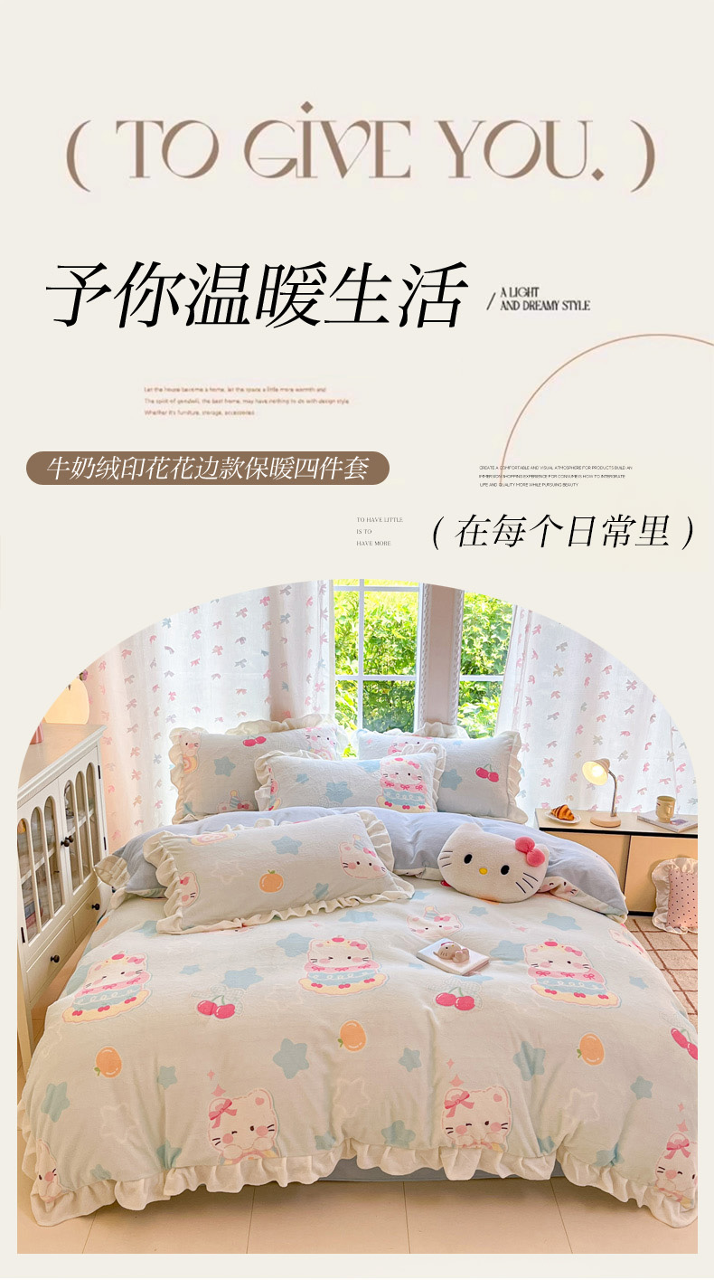 (总)慕澄家居 2025新款花边款牛奶绒印花四件套,花边款-蛋糕猫咪,花边款-甜品美乐蒂,花边款-快乐卡皮,花边款-小美好,花边款-蓝条凯蒂,花边款-粉色喵喵,花边款-碎花小汪,花边款-心心相印,花边款-浪漫波点,花边款-繁花,花边款-奶奶可爱,花边款-梦幻花语,花边款-格子小猫