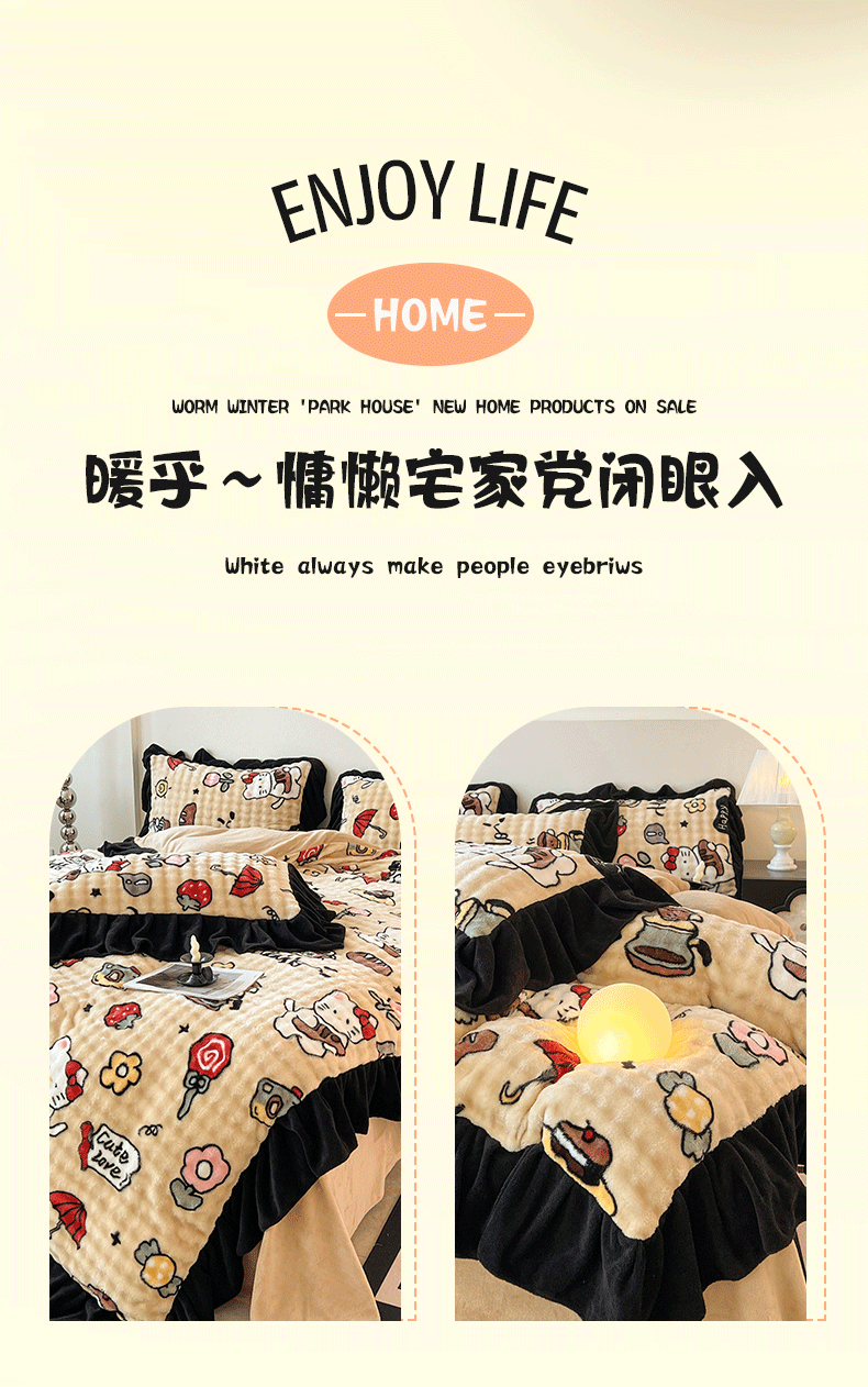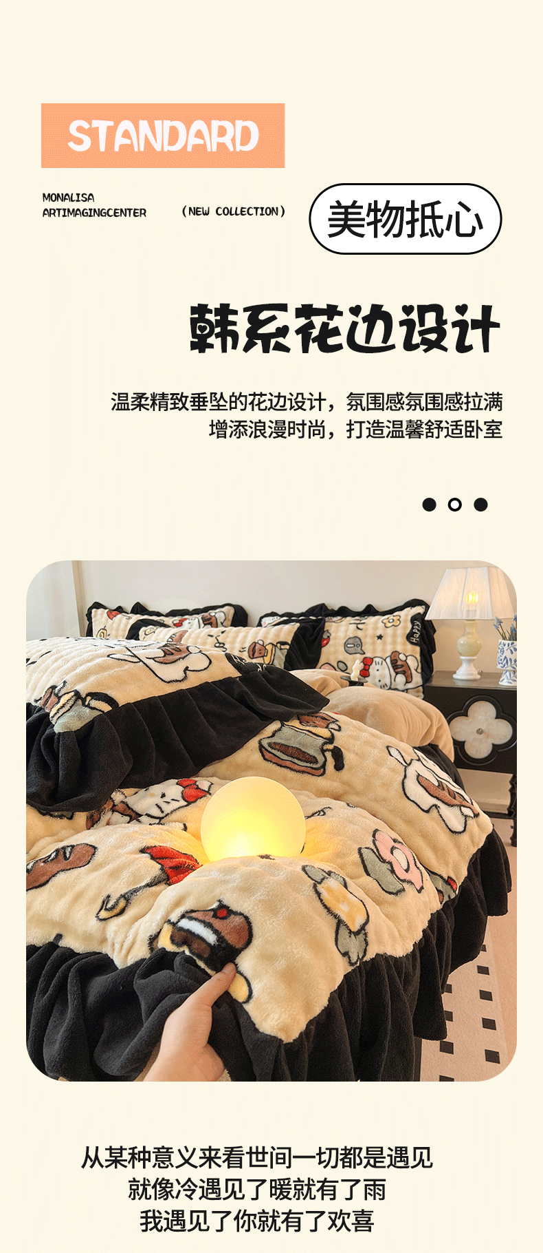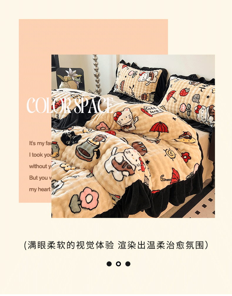 言熙居家纺 2025新款A类兔毛绒韩版卡通花边四件套 休闲一刻