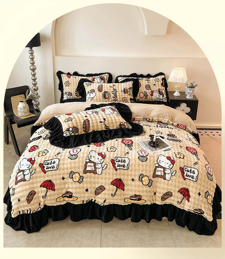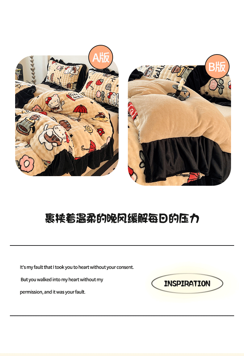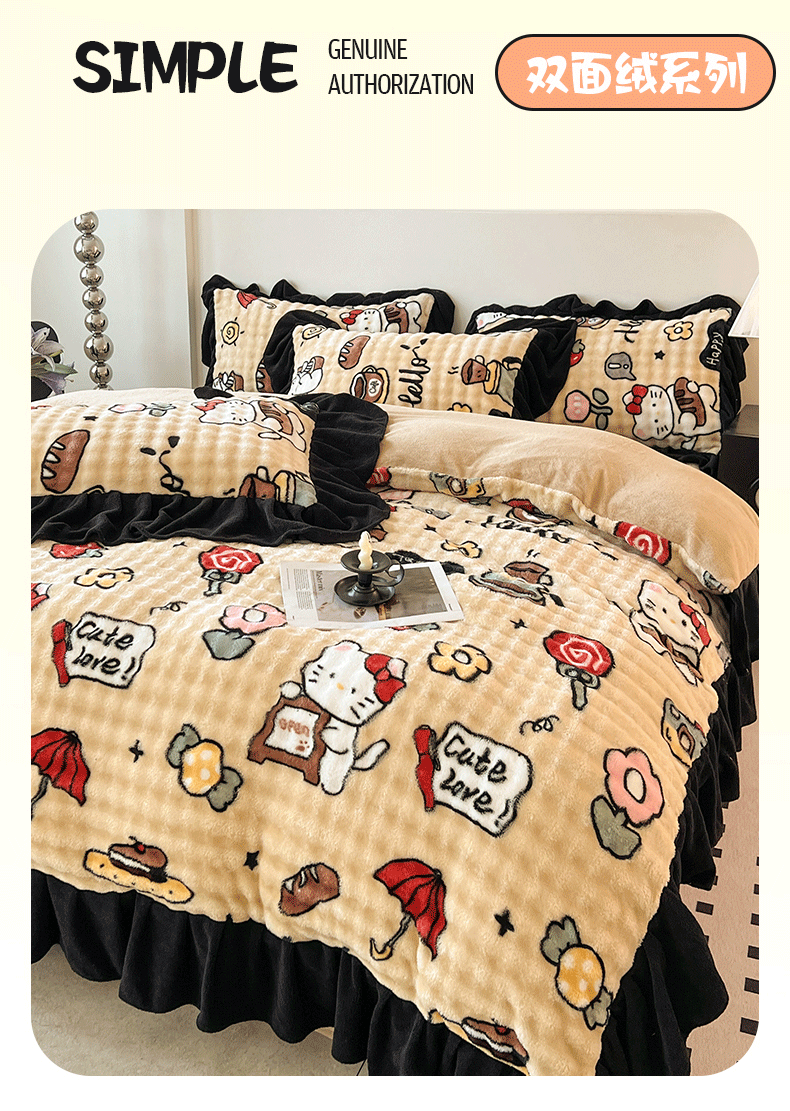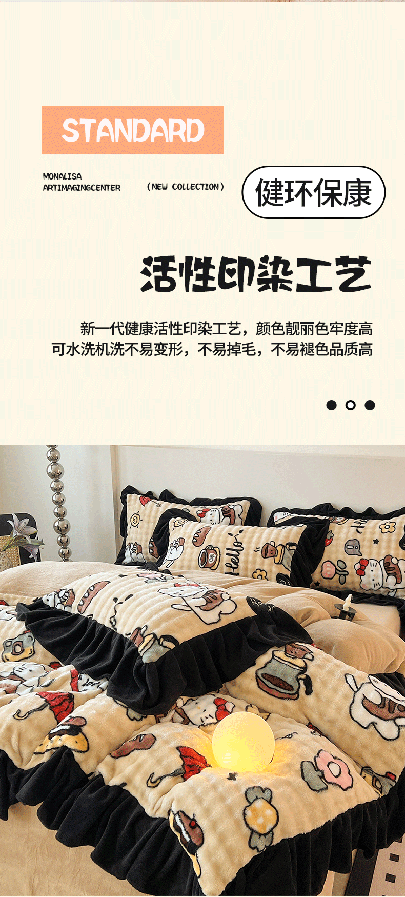 言熙居家纺 2025新款A类兔毛绒韩版卡通花边四件套 休闲一刻