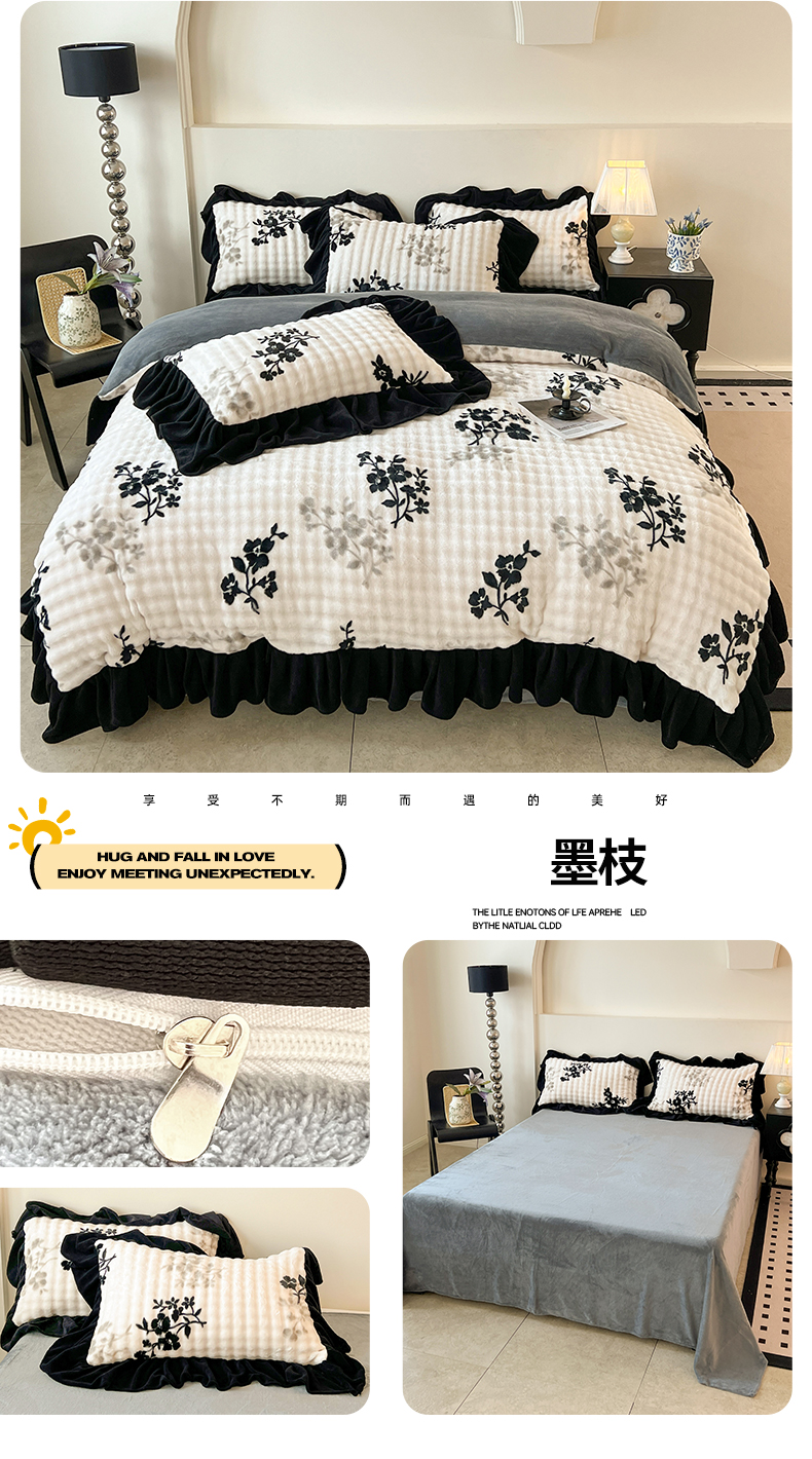 (总)言熙居家纺 2025新款A类兔毛绒韩版卡通花边四件套,蝴蝶结,幻蝶,墨枝,休闲一刻,映春,花眠