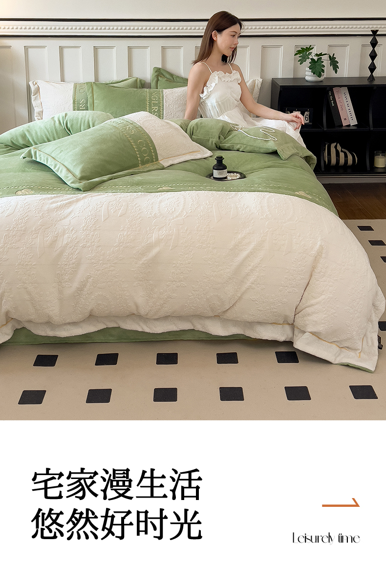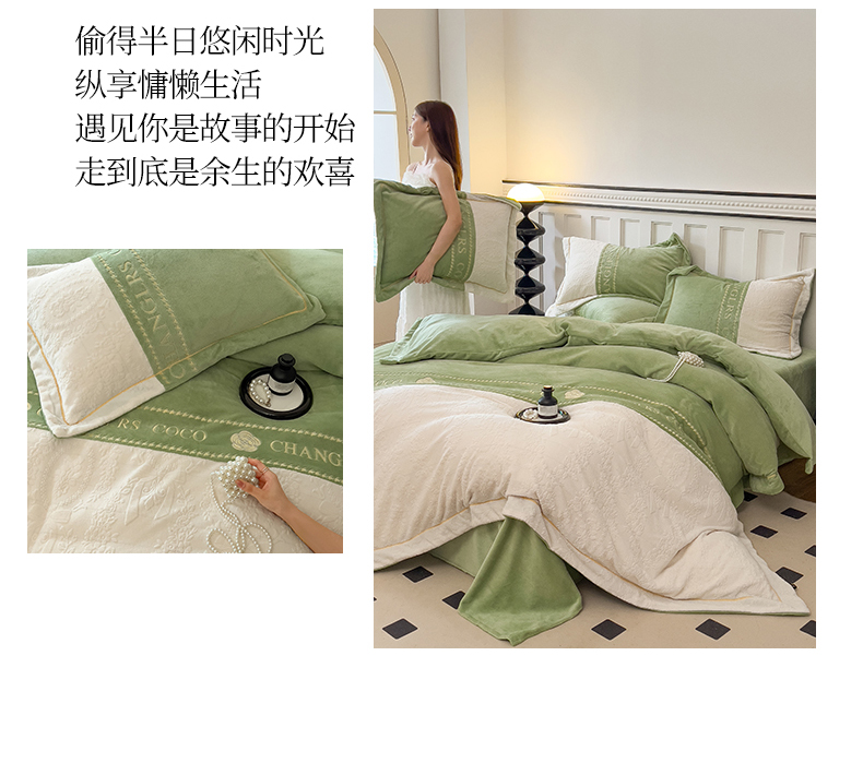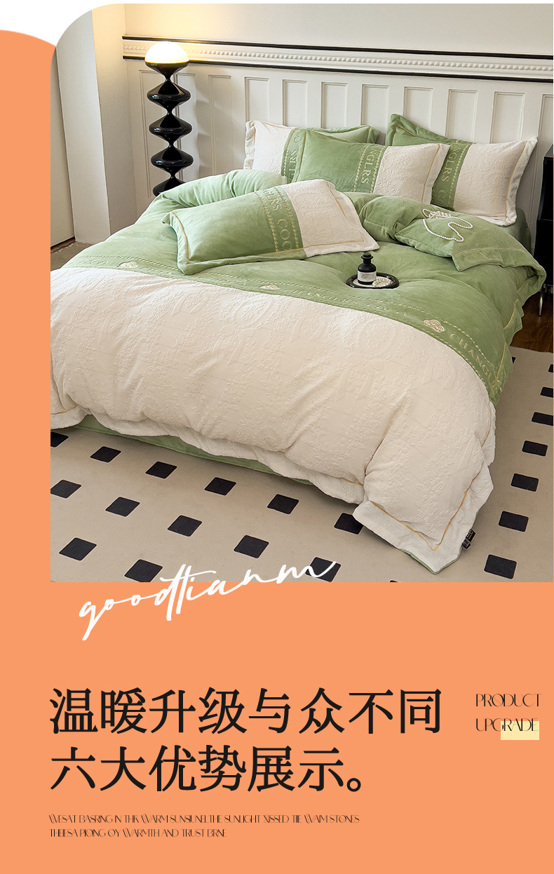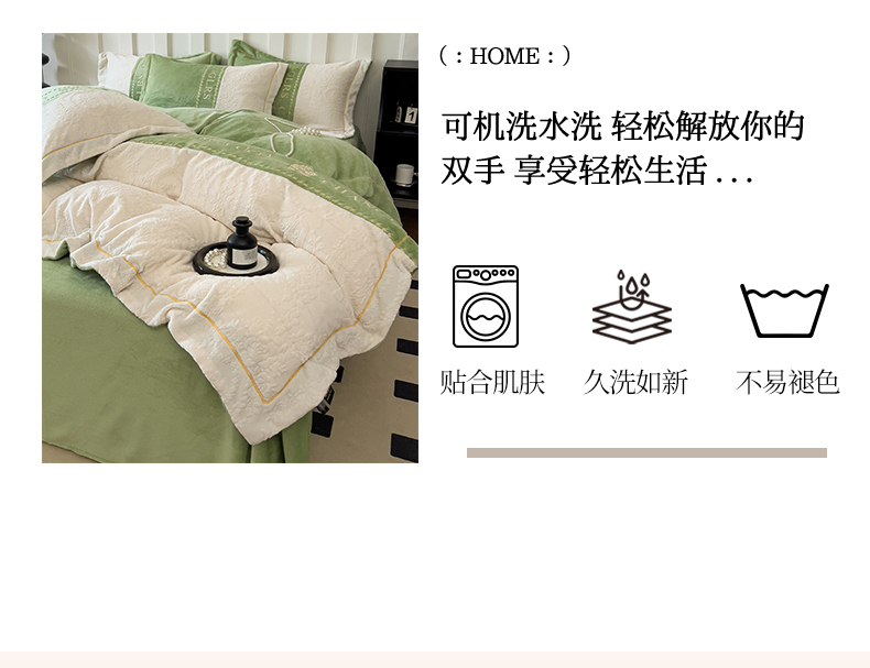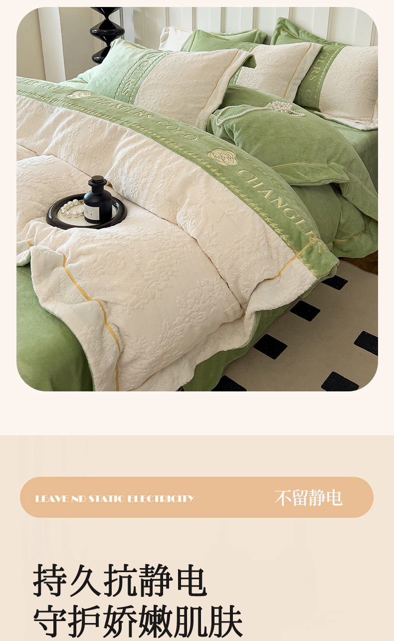 商品名称:言熙居家纺 2025新款A类A版牛奶雕花绒B版全消光牛奶绒四件套-花季 花季-竹林绿