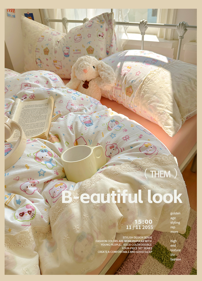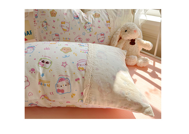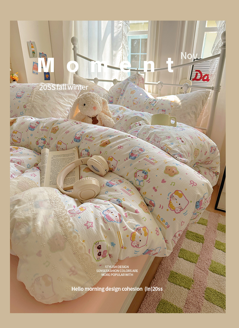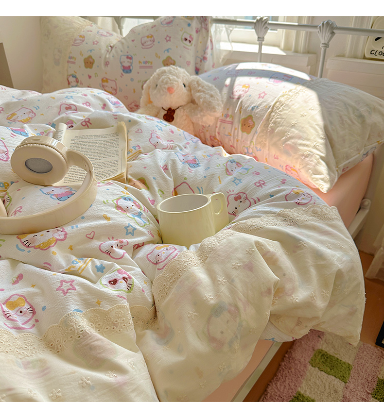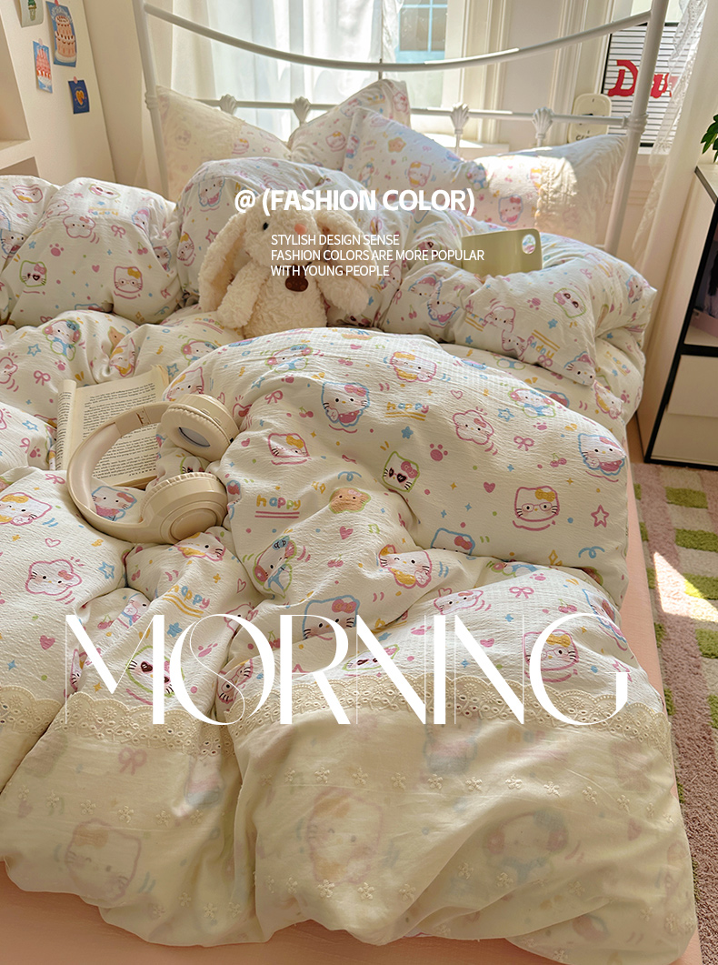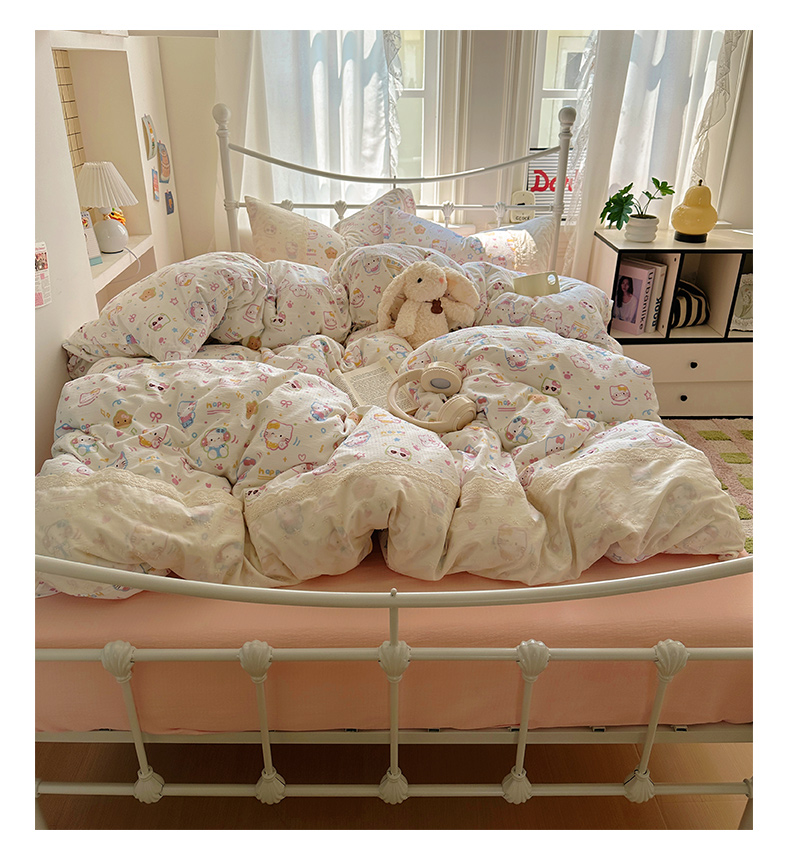 当前位置: 91家纺网 > 商品网购 > 床品套件 > 四件套 > 双层纱四件套 > 花伞家居 2025新款A类韩系蕾丝花边云感木棉双层纱四件套(提供买家秀) 韩系快乐小猫