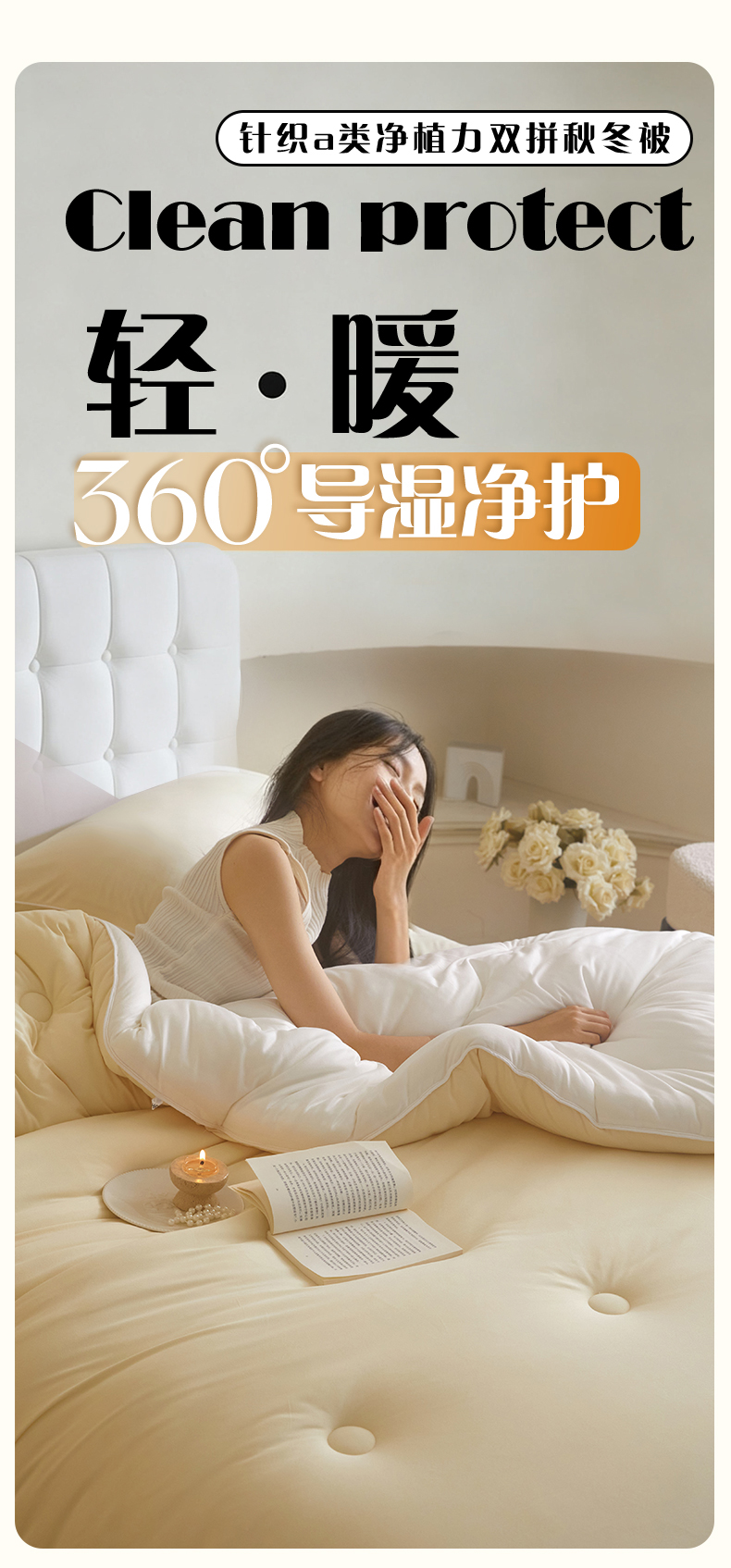 头等舱 2025新款针织A类软糯净植力抗菌防螨防霉低致敏双拼秋冬被(模特图) 米黄+本白