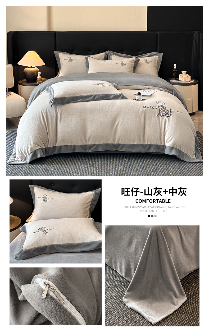 (总)眷恋家纺 2025新款牛奶绒加厚卡通刺绣四件套-旺仔,旺仔-可可粉+香槟,旺仔-奶昔白+奶茶,旺仔-山灰+中灰,旺仔-绅士灰+香槟,旺仔-香槟+中灰,旺仔-婴儿蓝+山灰