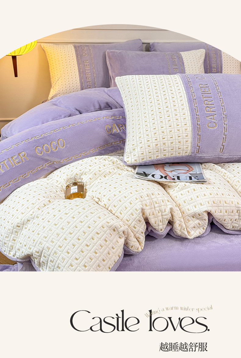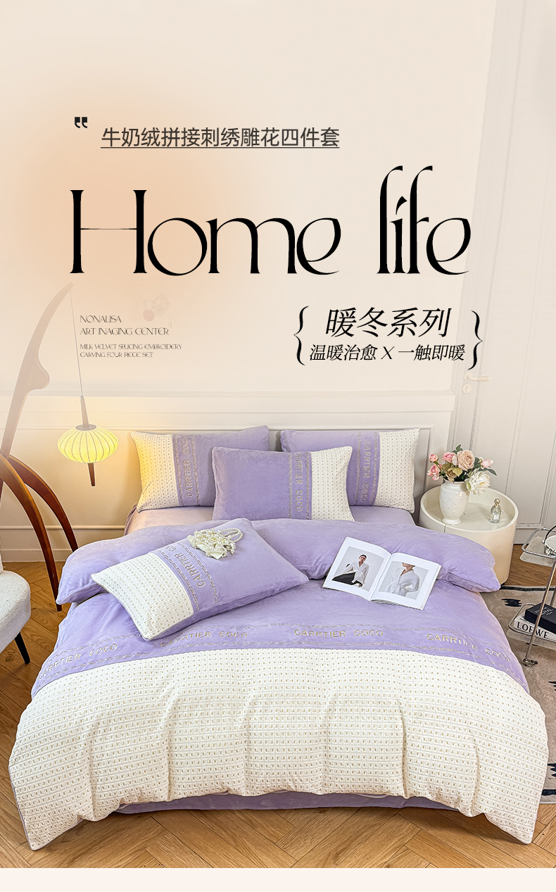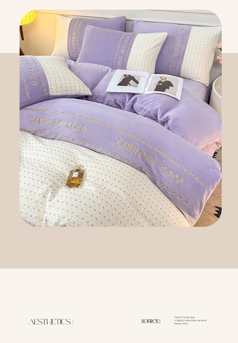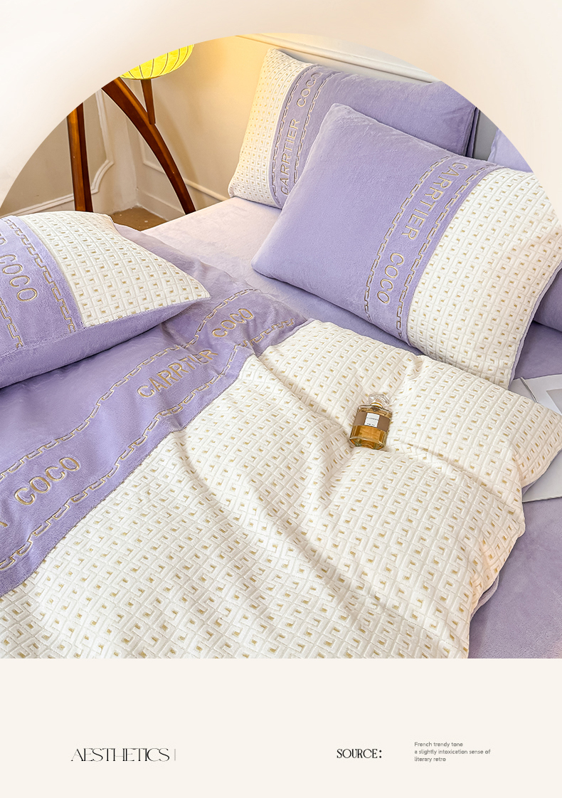 当前位置: 91家纺网 > 商品网购 > 床品套件 > 四件套 > 牛奶绒四件套 > 灰鲸 2025新款牛奶绒刺绣拼接款四件套-威廉 威廉-风铃紫